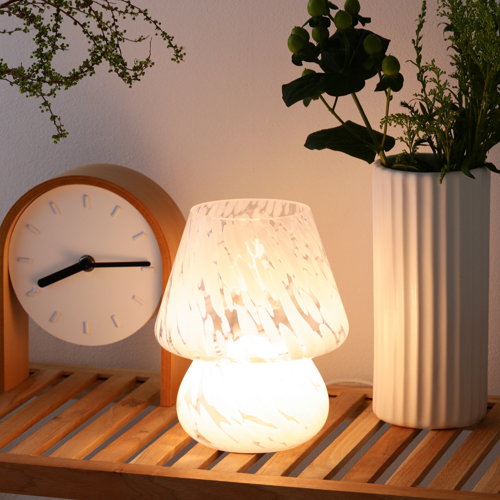 コロンとかわいらしいマッシュルームのかたちをしたランプです。明かりをつけるとガラス越しの優しいやわらかな光が広がります。そのままおいておくだけでお部屋を素敵に演出できます。