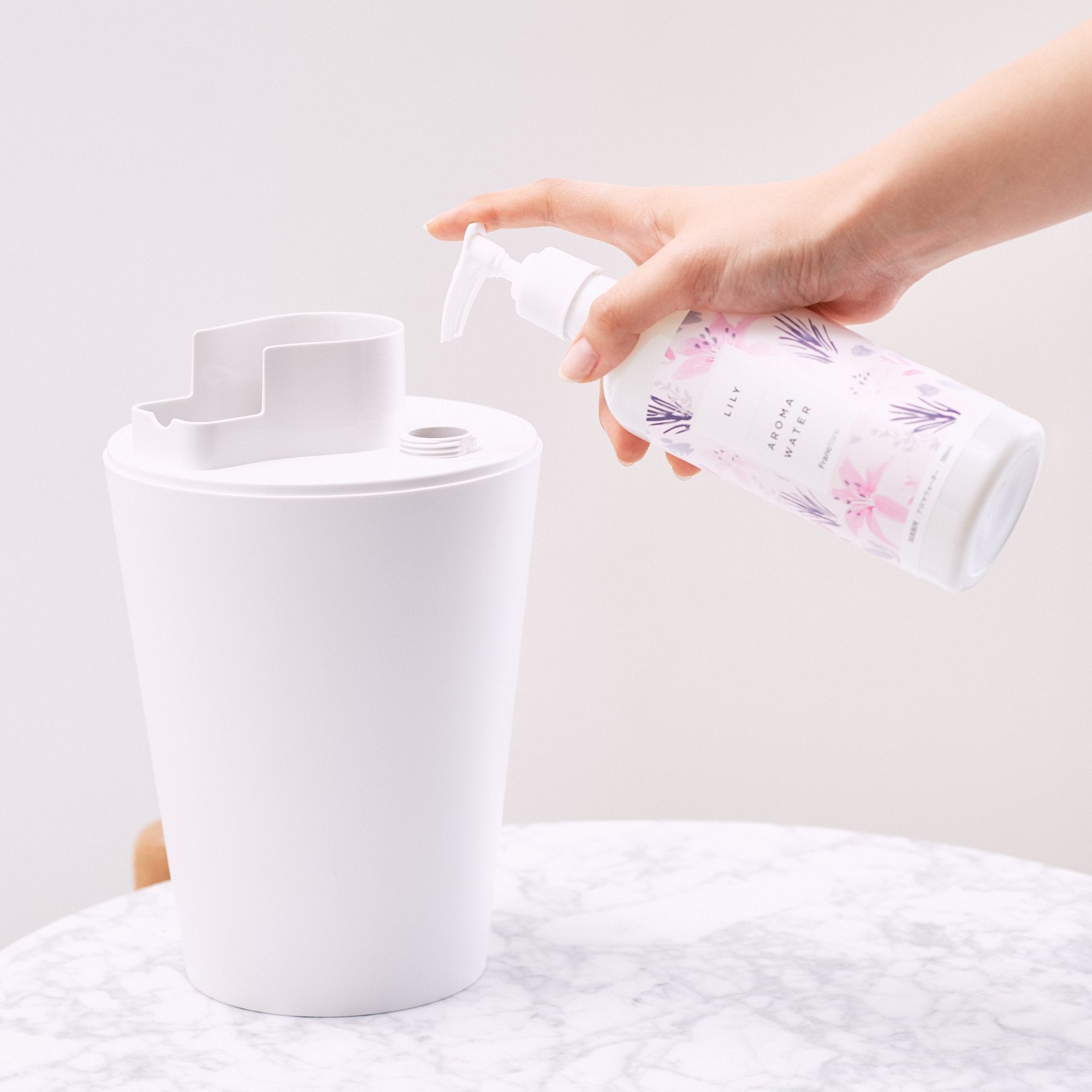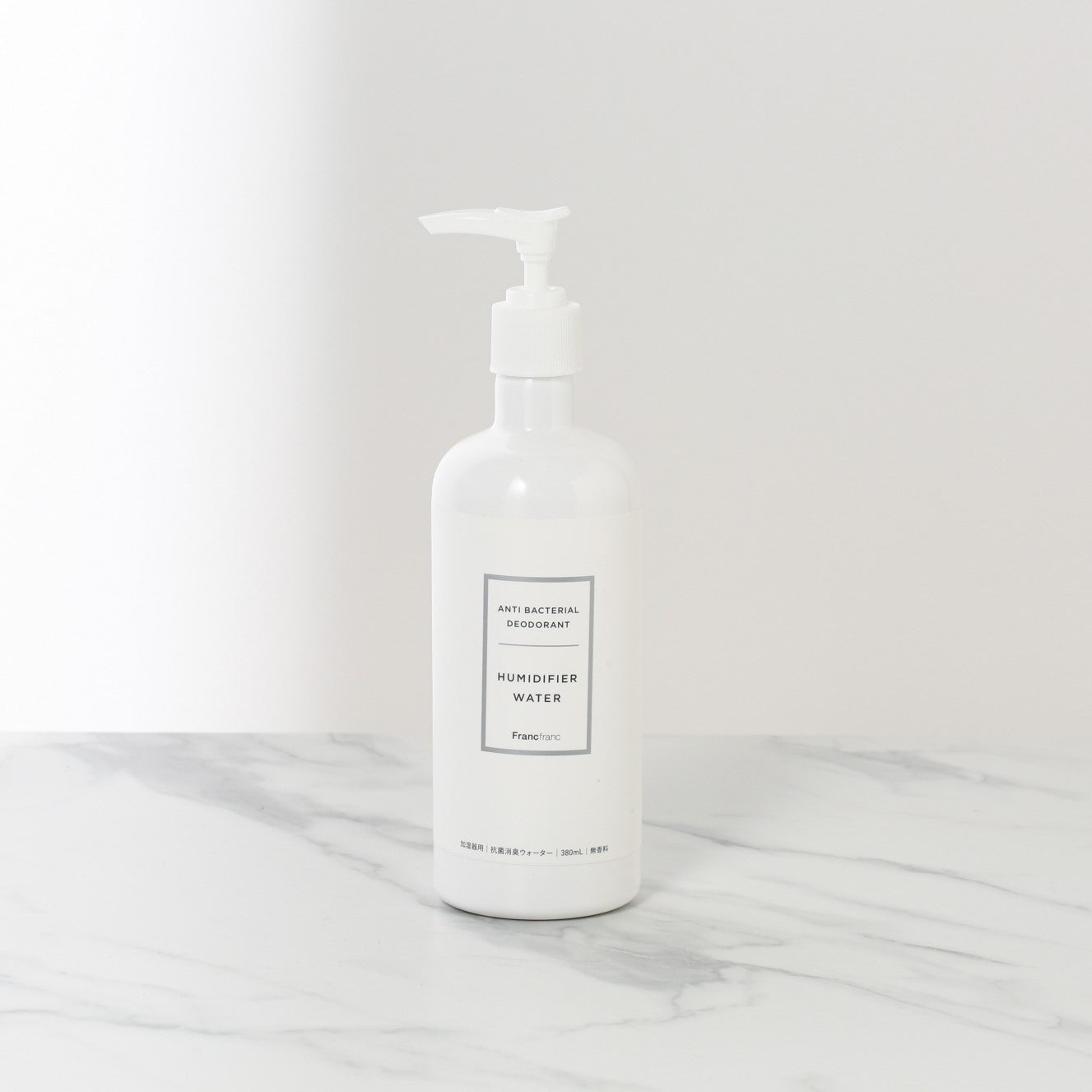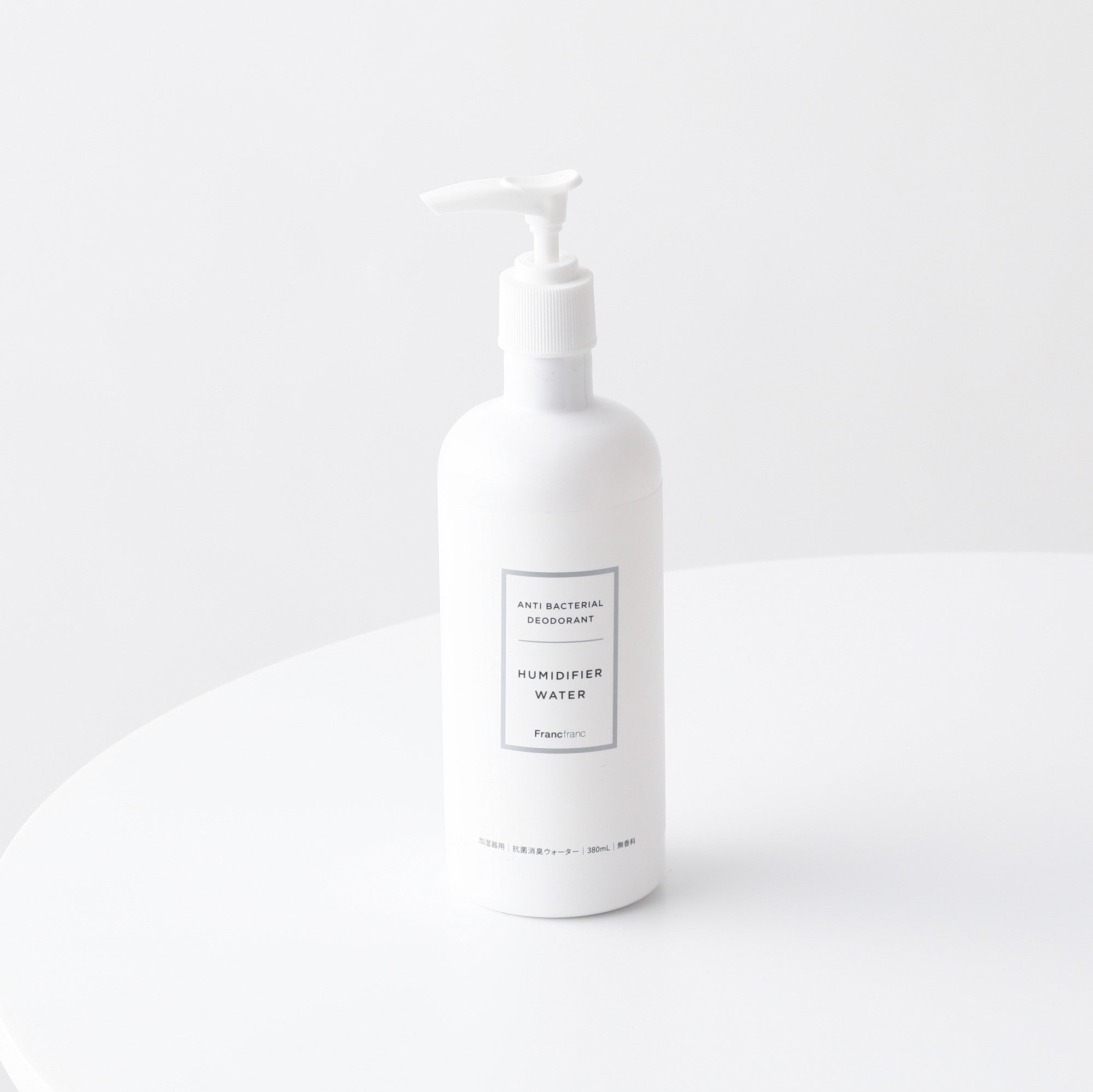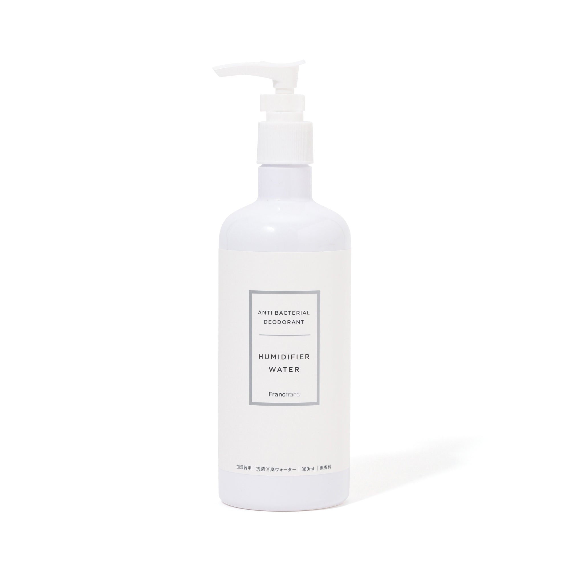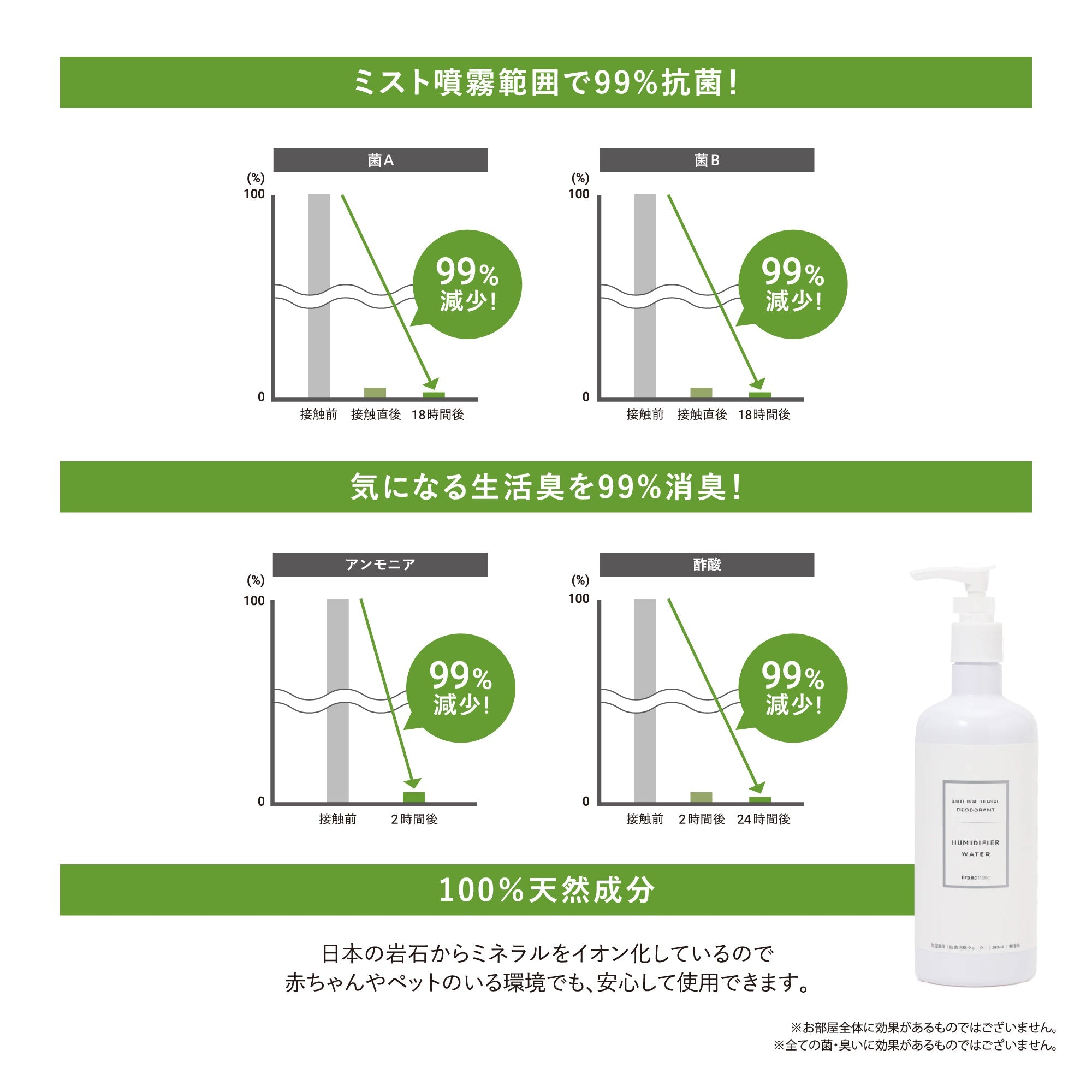 加湿器に水と一緒に入れて使用する抗菌消臭ウォーターで、アロマウォーターといっしょに使うと香りをお楽しみいただけます。加湿器のミスト噴霧範囲に99%抗菌効果を発揮。アンモニアや酢酸などの生活臭へも99%消臭効果を発揮してくれます。日本の岩石のミネラルをイオン化した天然成分でできているので、赤ちゃんやペットがいても安心してご使用いただけます。1プッシュ約1mlのポンプ式なので、計量の手間が省けるうえに手も汚れにくくて便利です。水約1,000mlに対して、3プッシュ(約3ml)が目安です。<使用方法>加湿器のタンクに水を入れてから本液を適量いれてお使いください。