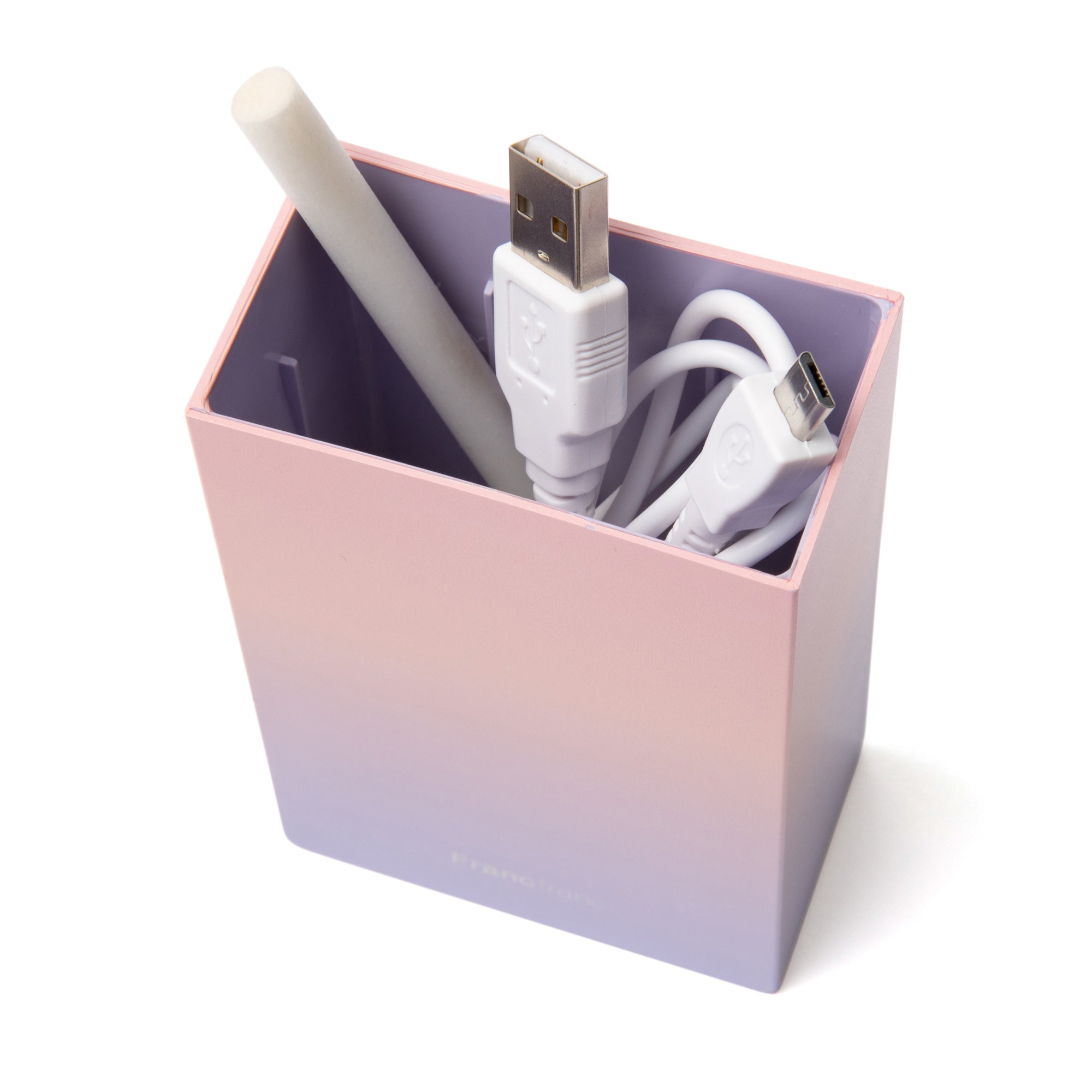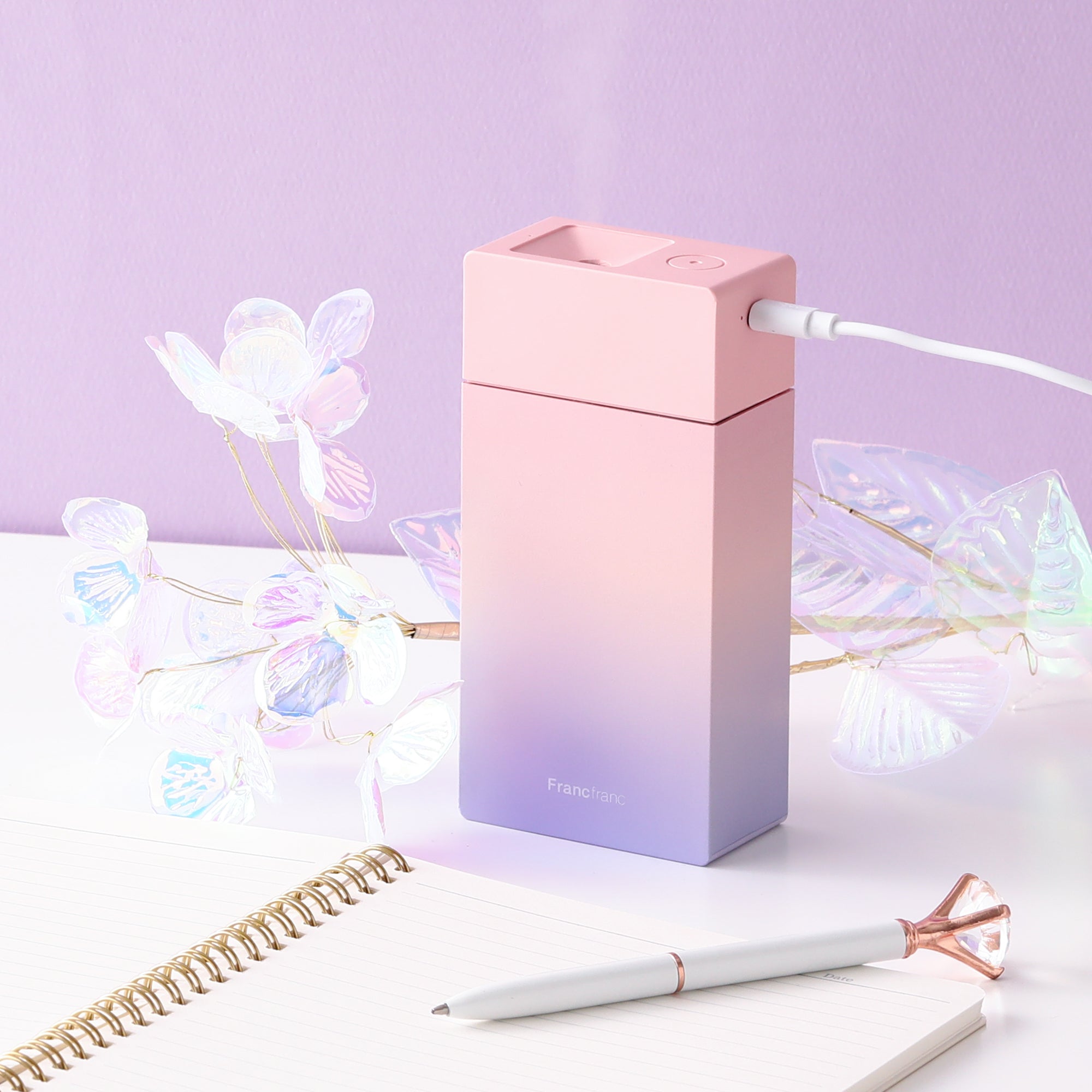 充電式でどこでもスマートに持ち運べるポータブル加湿器です。モバイルバッテリーやパソコンからも充電できます。充電しながら使用することも可能なので、オフィスで、旅行先で、いつでもどこでもお使いいただけます。3時間オートオフ機能つきで就寝中のご使用も安心です。タッチボタンは1秒間の長押しで電源が入る仕様。持ち運び中などの誤操作を防ぎます。ふたにはシリコンのパッキンがついていているのでうっかり倒してしまってもこぼれにくく、上部を取り外せばお手入れが簡単です。※アロマオイル・アロマウォーターは故障の原因になるため使用できません。