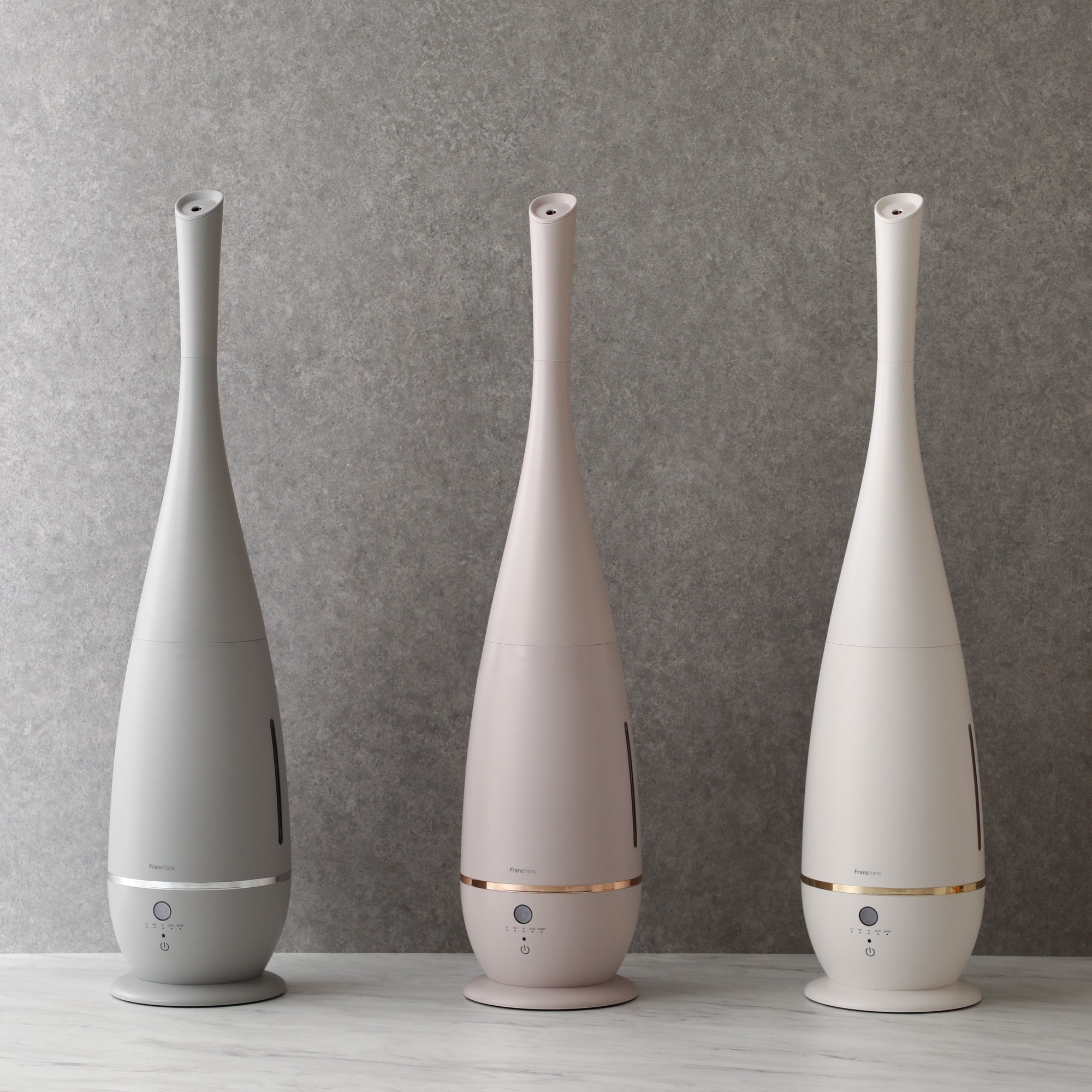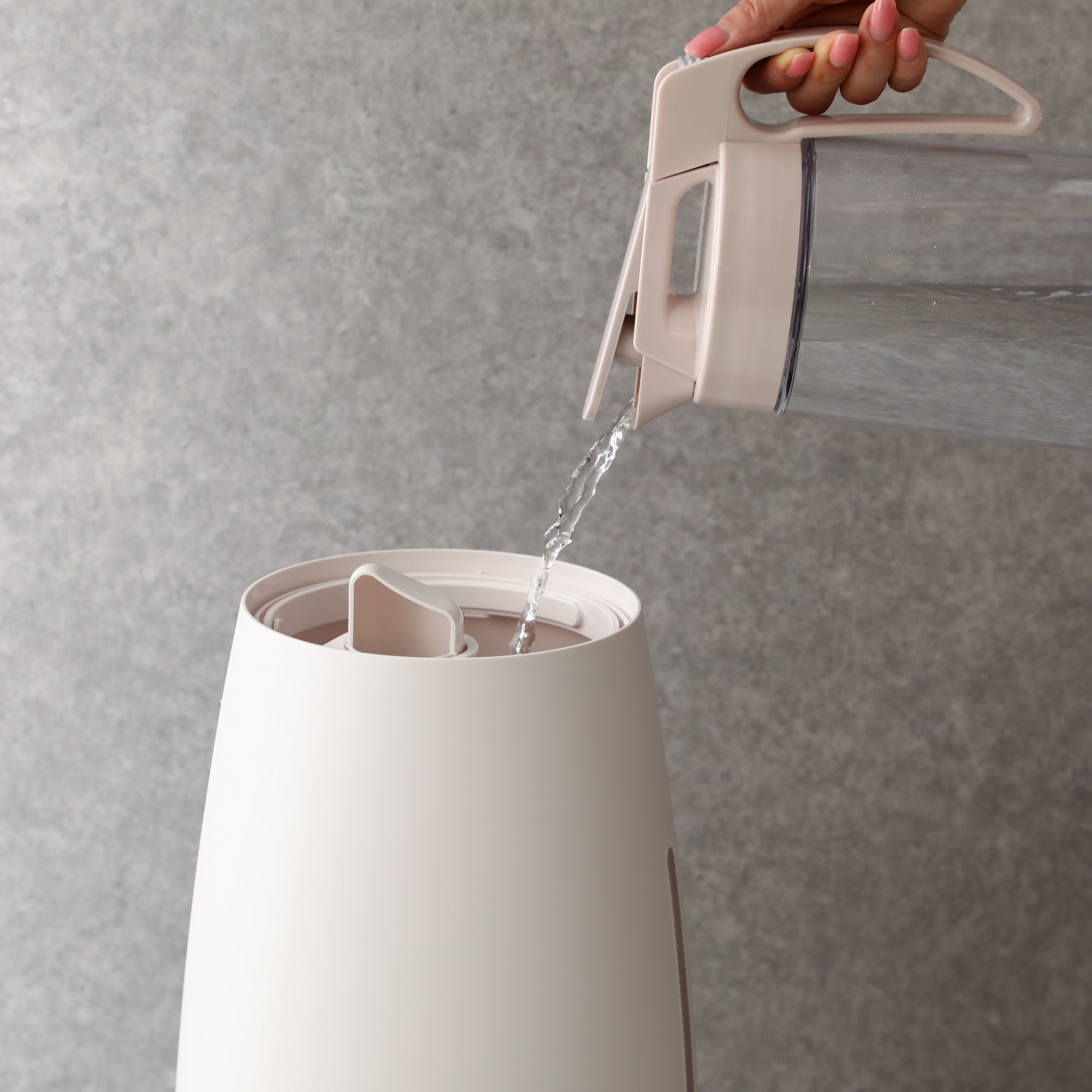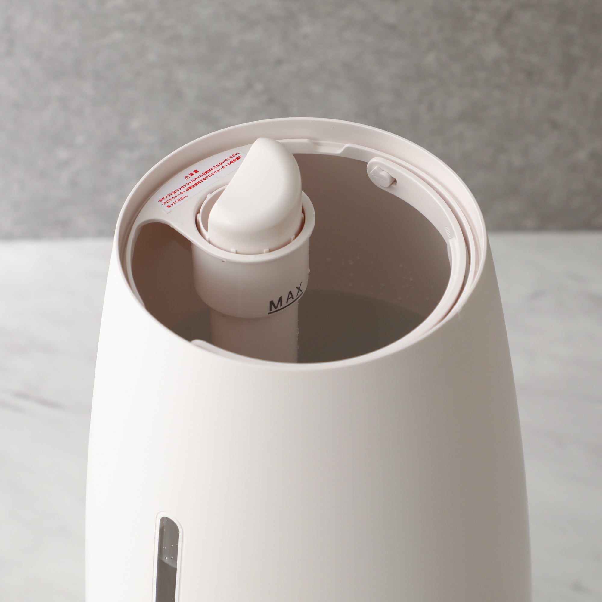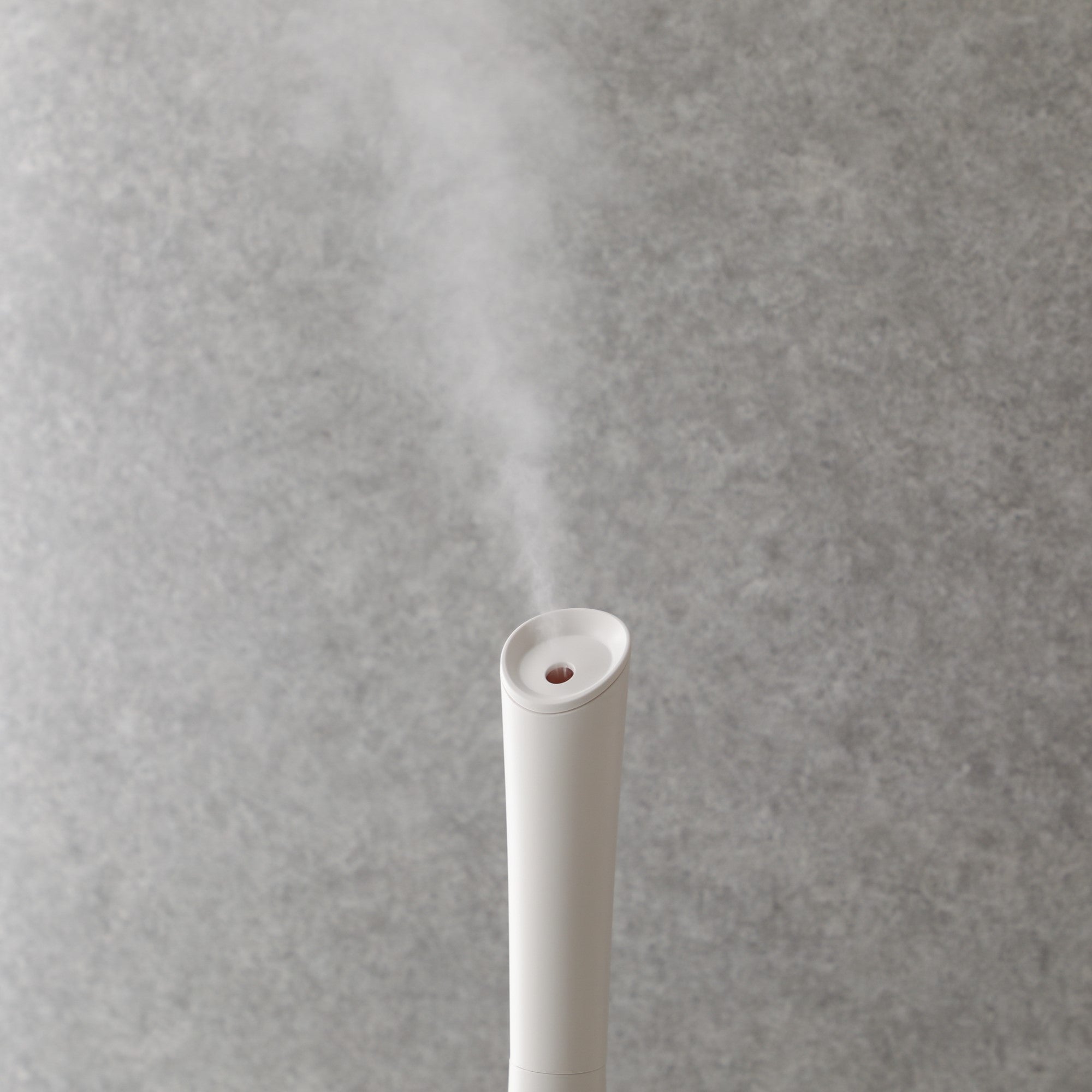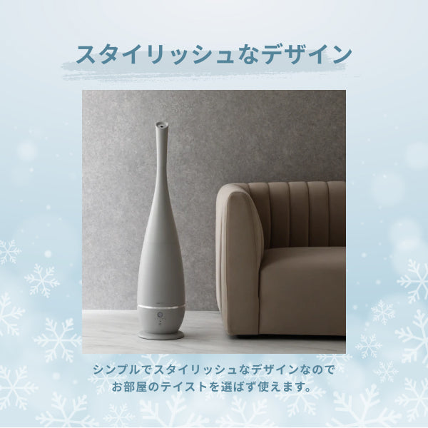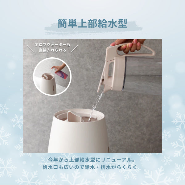 インテリアに溶け込む美しい佇まいと大容量タンクで人気の2WAY超音波式加湿器です。 水タンクを5Lから5.5Lに増量、さらに持ち運ぶ必要のない「上部給水型」にリニューアルしました。 タンクが大容量なので面倒な水汲みの手間が軽減でき、上部給水型になったことで給水もらくらくに。持ちやすい取っ手が付いているからタンクを移動する際も便利です。 ひとめでお部屋の湿度環境がわかる湿度センサー搭載で適切な湿度をLEDでお伝えします。 ・オレンジ点灯=湿度40%以下 (乾燥気味) ・青点灯=湿度40%~60%(快適) ・緑点灯=湿度60%以上(多湿) 室内の湿度を検知し自動でミストの量を調節するオートモード、睡眠を邪魔しないLED消灯モード、ミスト量を抑えて6時間でオートオフするナイトモードなど、多機能なアイテムです。 付属のアロマパッドを使ってお好きな香りを楽しむこともできます。 本体が部屋の隅にあっても遠隔操作のできるリモコンつきで操作も簡単。 吹き出し口が着脱できるので、ロングタイプとミドルタイプの2つの形状に変更できるのでシーンに合わせてお使いいただけます。