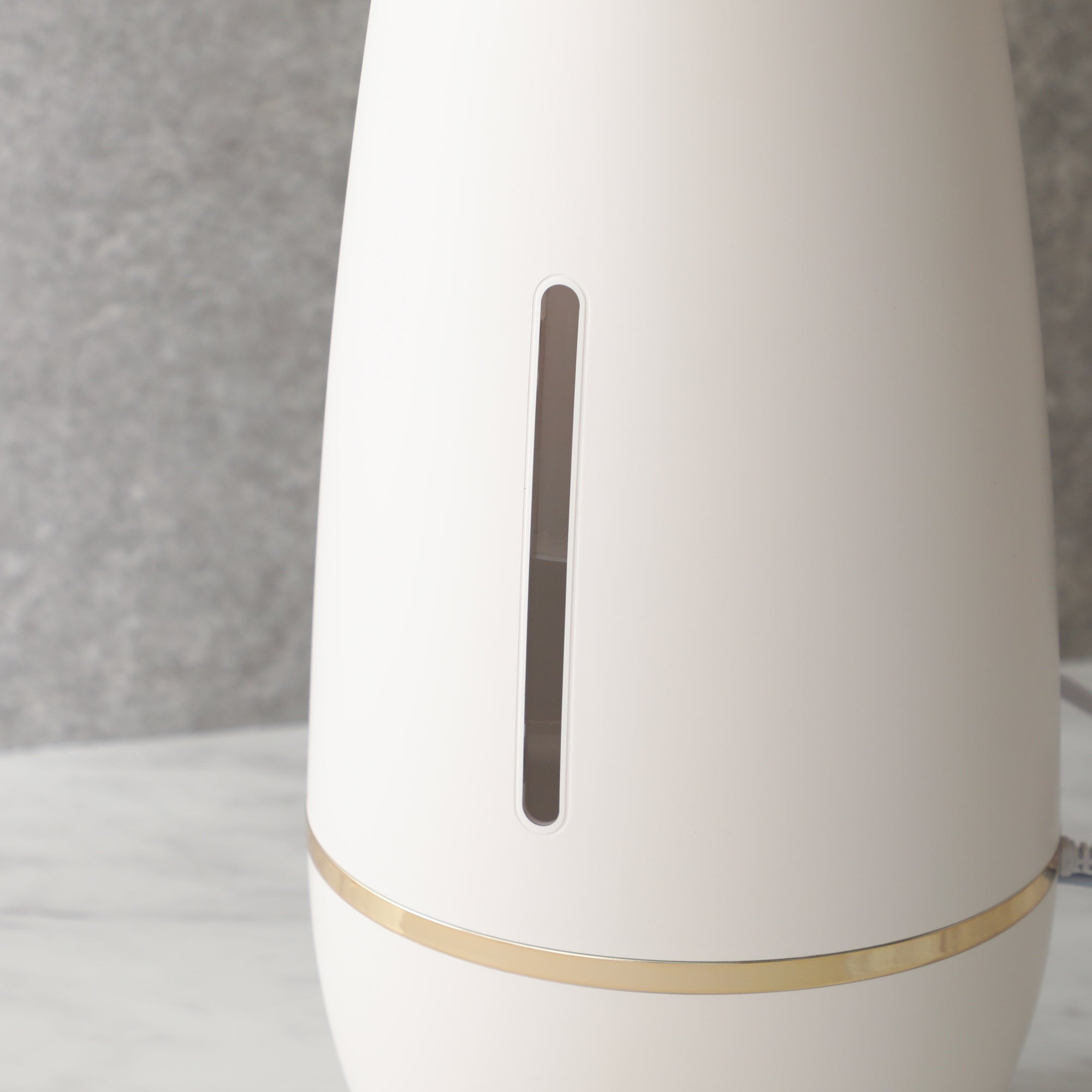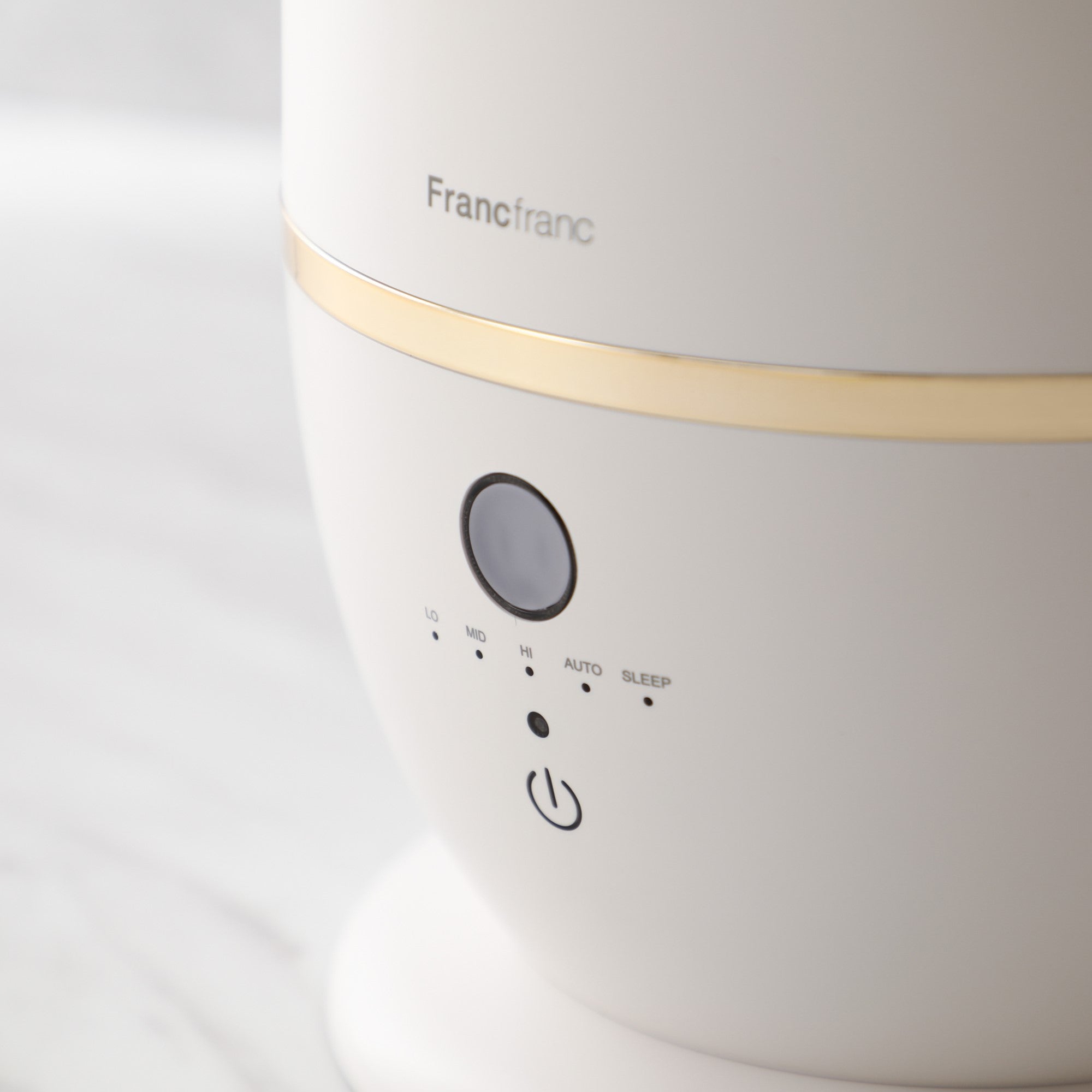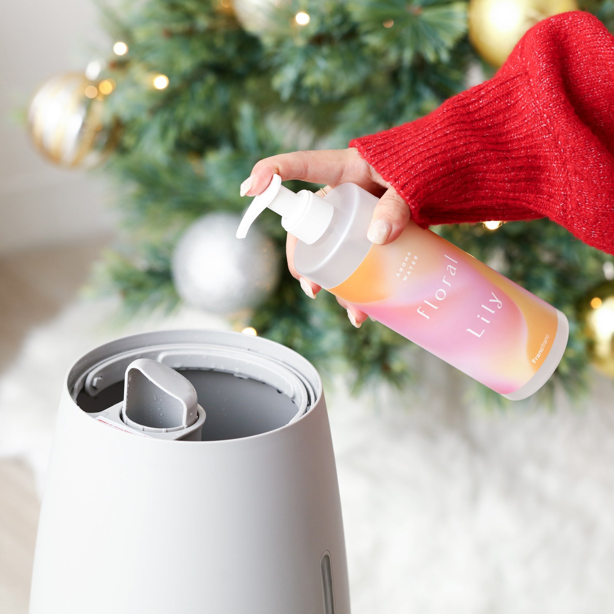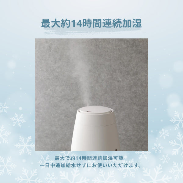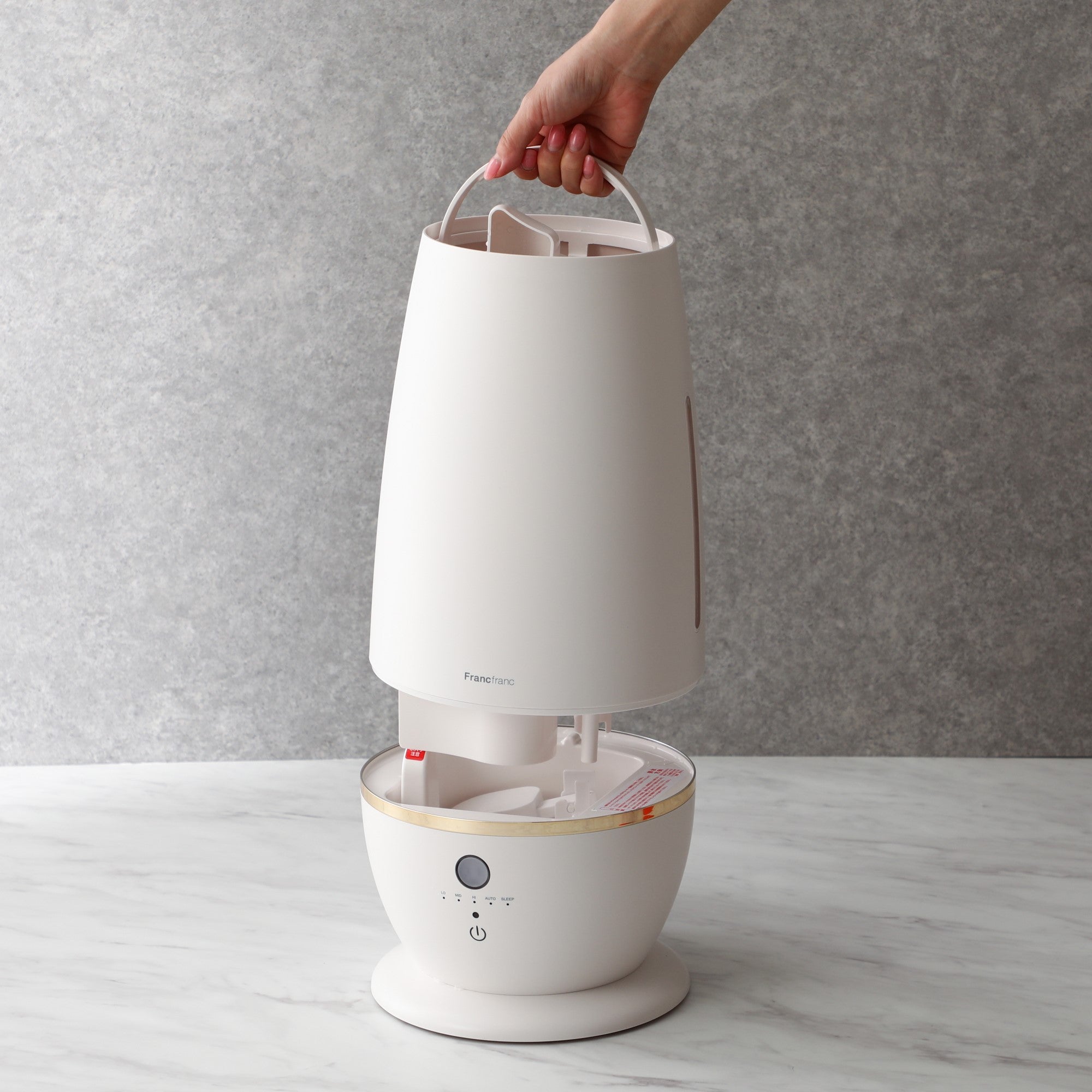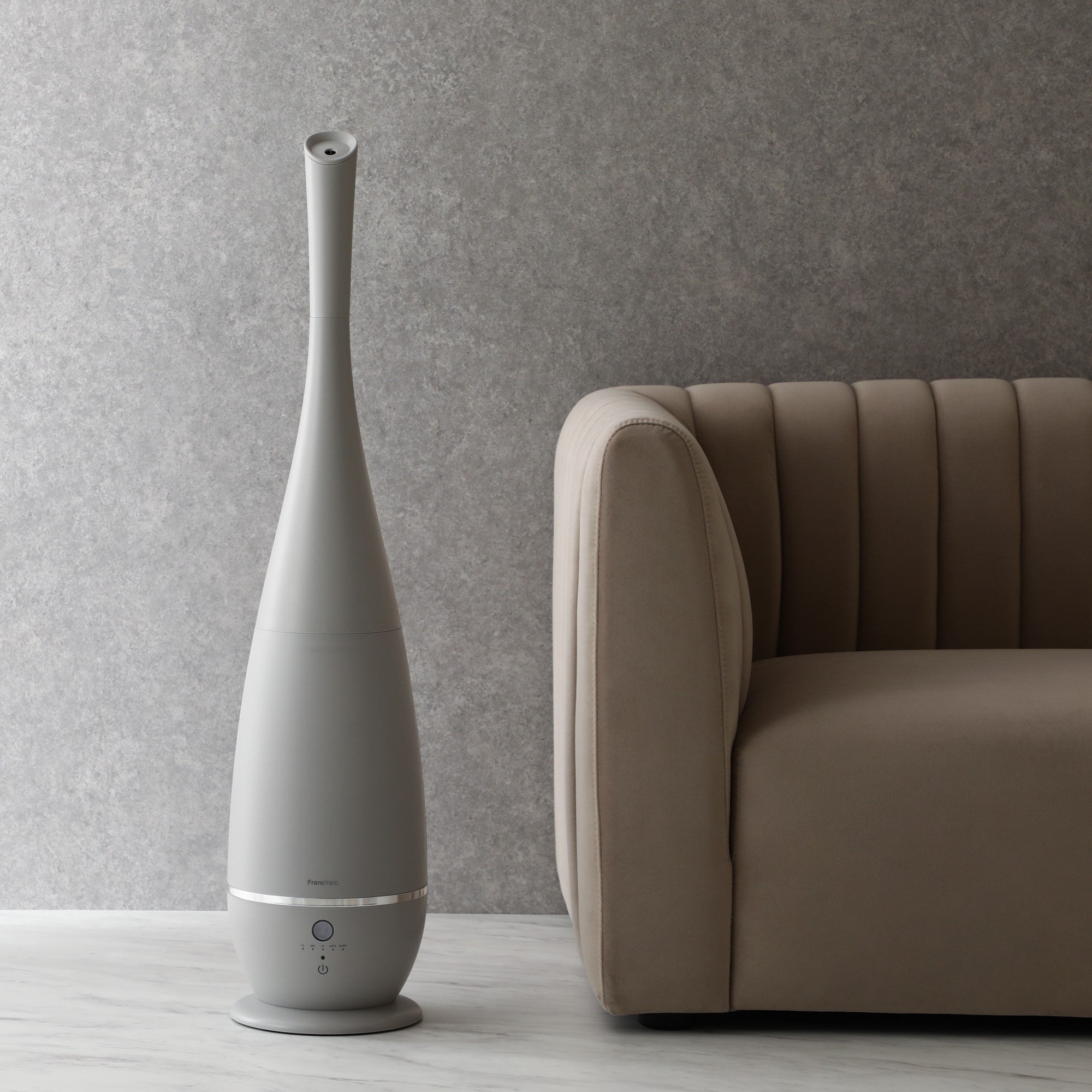 インテリアに溶け込む美しい佇まいと大容量タンクで人気の2WAY超音波式加湿器です。 水タンクを5Lから5.5Lに増量、さらに持ち運ぶ必要のない「上部給水型」にリニューアルしました。 タンクが大容量なので面倒な水汲みの手間が軽減でき、上部給水型になったことで給水もらくらくに。持ちやすい取っ手が付いているからタンクを移動する際も便利です。 ひとめでお部屋の湿度環境がわかる湿度センサー搭載で適切な湿度をLEDでお伝えします。 ・オレンジ点灯=湿度40%以下 (乾燥気味) ・青点灯=湿度40%~60%(快適) ・緑点灯=湿度60%以上(多湿) 室内の湿度を検知し自動でミストの量を調節するオートモード、睡眠を邪魔しないLED消灯モード、ミスト量を抑えて6時間でオートオフするナイトモードなど、多機能なアイテムです。 付属のアロマパッドを使ってお好きな香りを楽しむこともできます。 本体が部屋の隅にあっても遠隔操作のできるリモコンつきで操作も簡単。 吹き出し口が着脱できるので、ロングタイプとミドルタイプの2つの形状に変更できるのでシーンに合わせてお使いいただけます。
