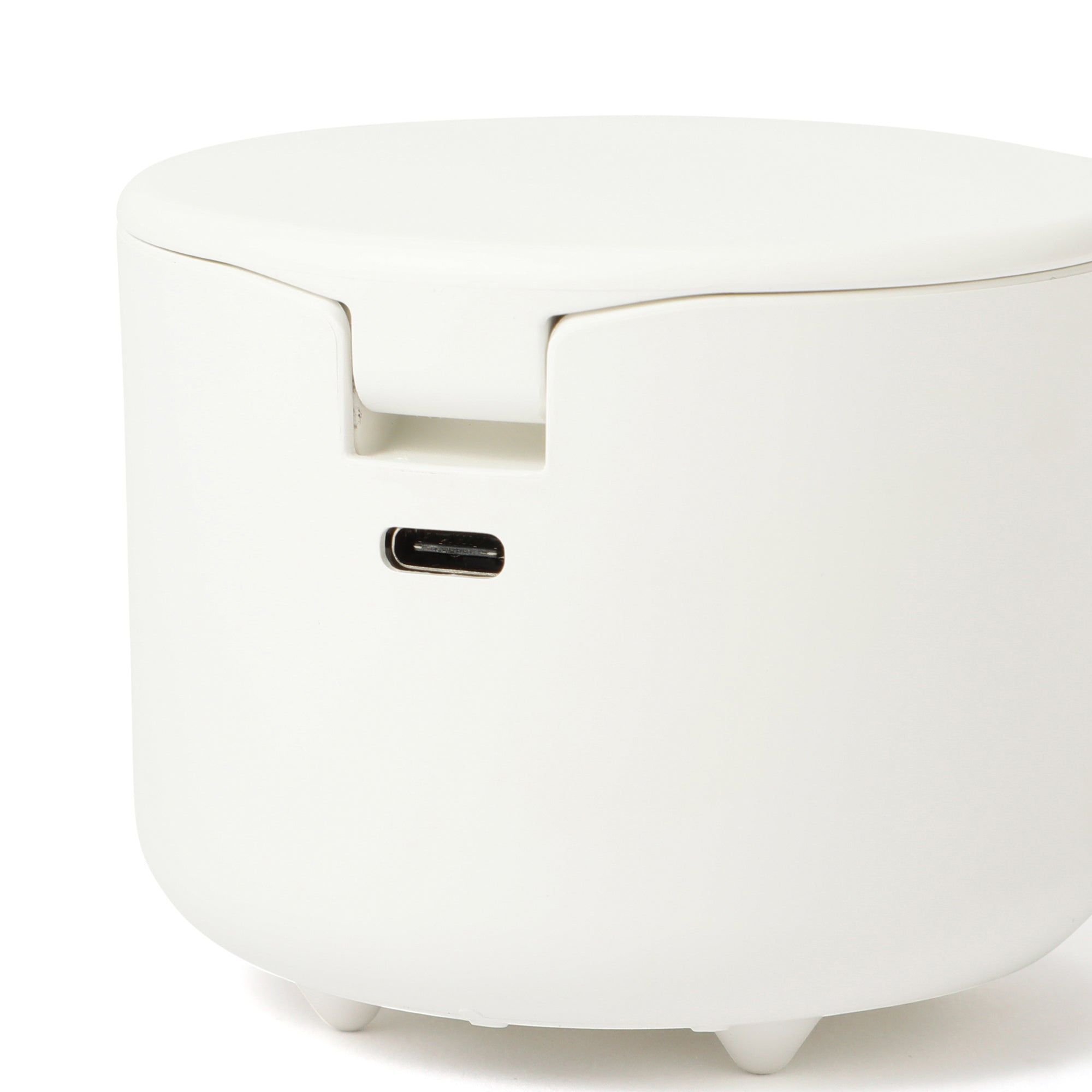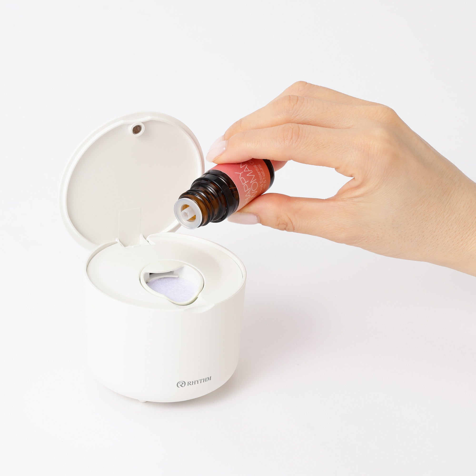 コンパクトサイズのファン式のアロマディフューザーです。火や水を使わないので、安全かつエッセンシャルオイル本来の香りを楽しめます。ふたを開くと電源ON、オイルを垂らすだけですぐに使えます。ファン方式で前方へ効率よく、好きな方向にだけ香りを届けるので、よりパーソナルに香りを楽しめます。香りを変えたいときはオイルパッドを取り替えるだけなので、新しい香りをすぐ楽しめます。コロンとしたデザインはインテリアになじみつつ、香りを楽しむ道具としてのアクセントにも。コンパクトな手のひらサイズで持ち運びも便利。ベッドサイド、リビング、デスクワークのおともに最適です。自動OFF機能付きなのも嬉しいポイントです。