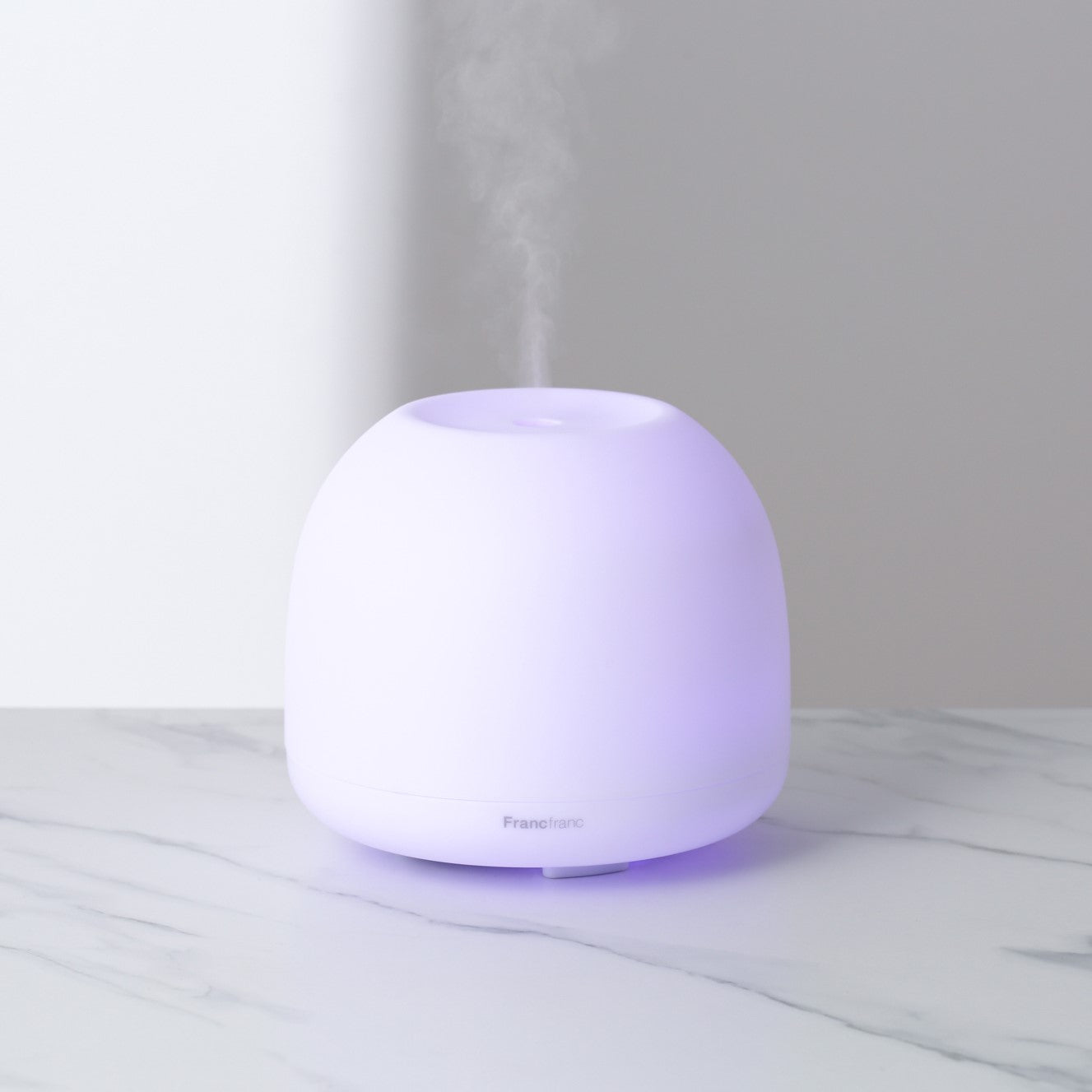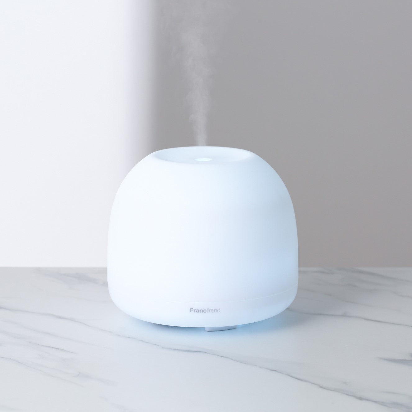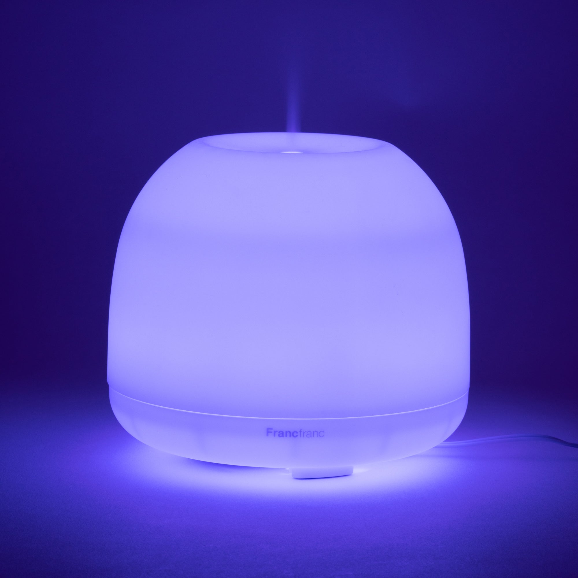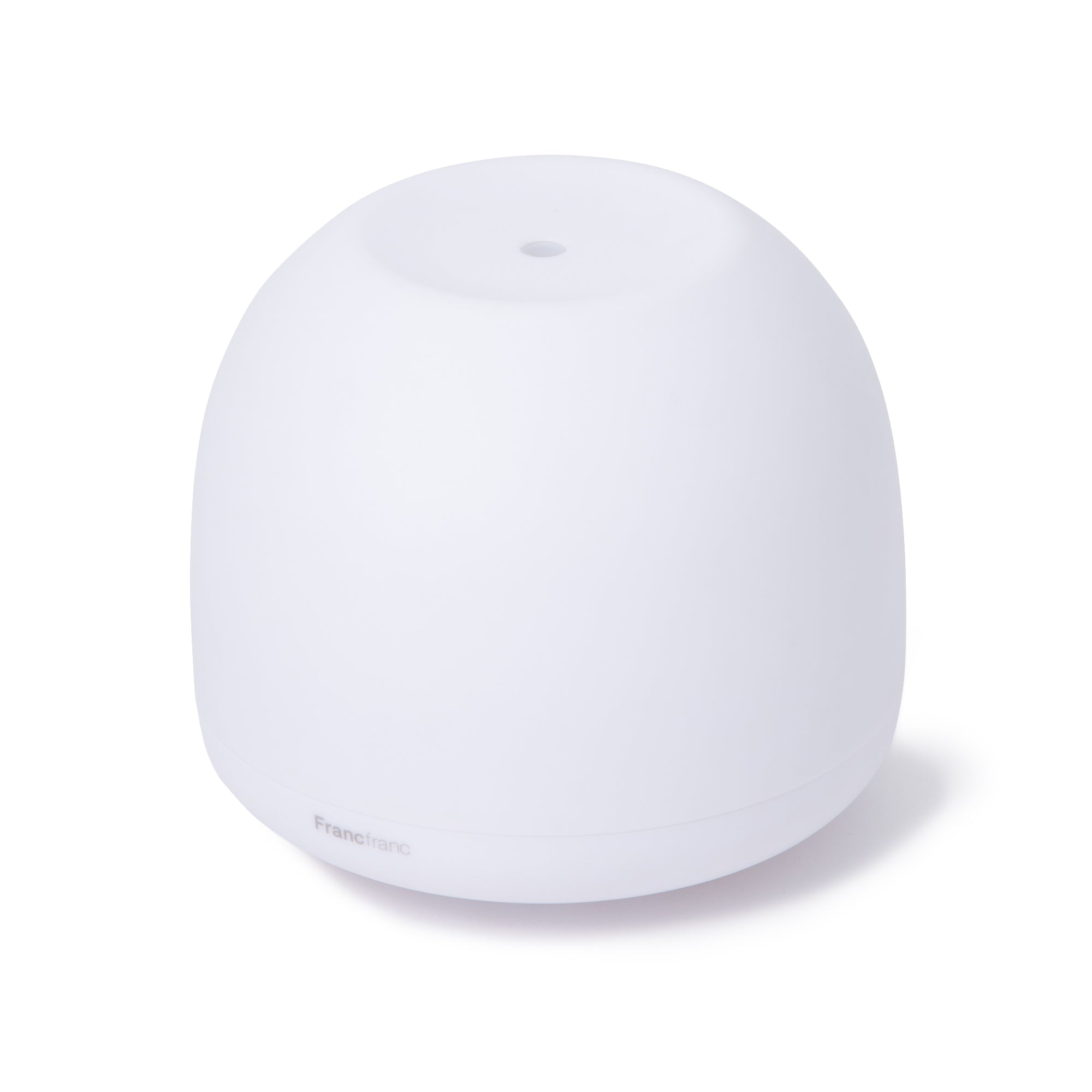 ころんと可愛らしい超音波式アロマ加湿器です。デスクやテーブルなど小さなスペースに最適なコンパクトサイズですが、長時間しっかりうるおいます。LEDの色はお好みのカラーを選んで固定することができます。使用されるシーンによって組み合わせてみては。また、3段階のタイマーが付いて省エネにも貢献します。Francfrancの超音波加湿器アロマ対応のデザイン性の高い加湿器。お部屋のインテリアに溶け込む、Francfrancならではの見た目が特徴です。タンク容量も大きく、省エネ設計もポイント。