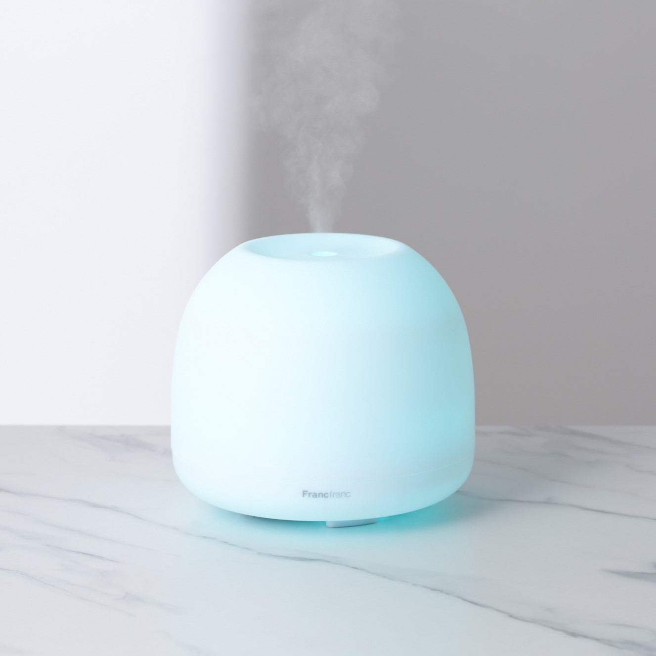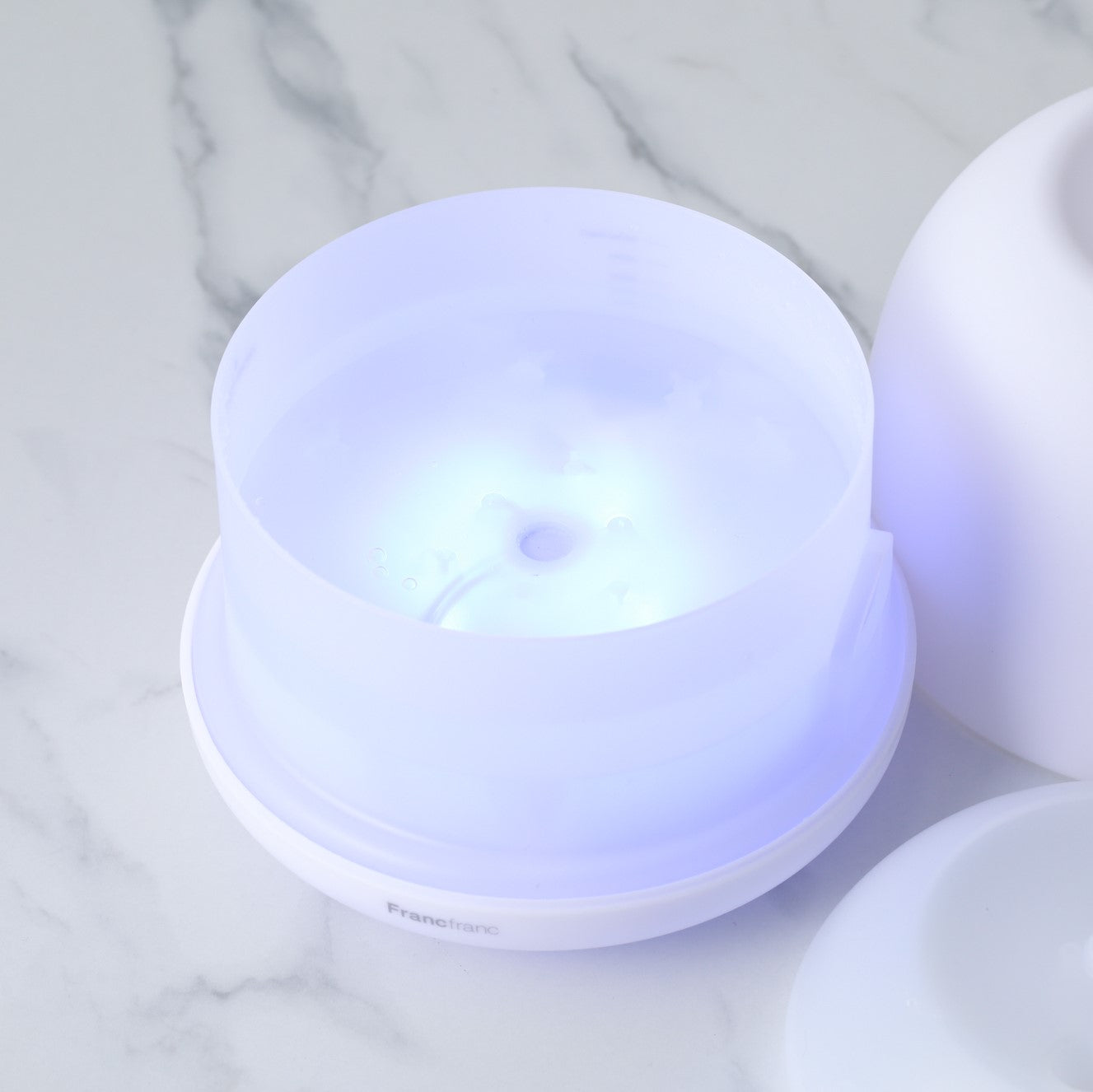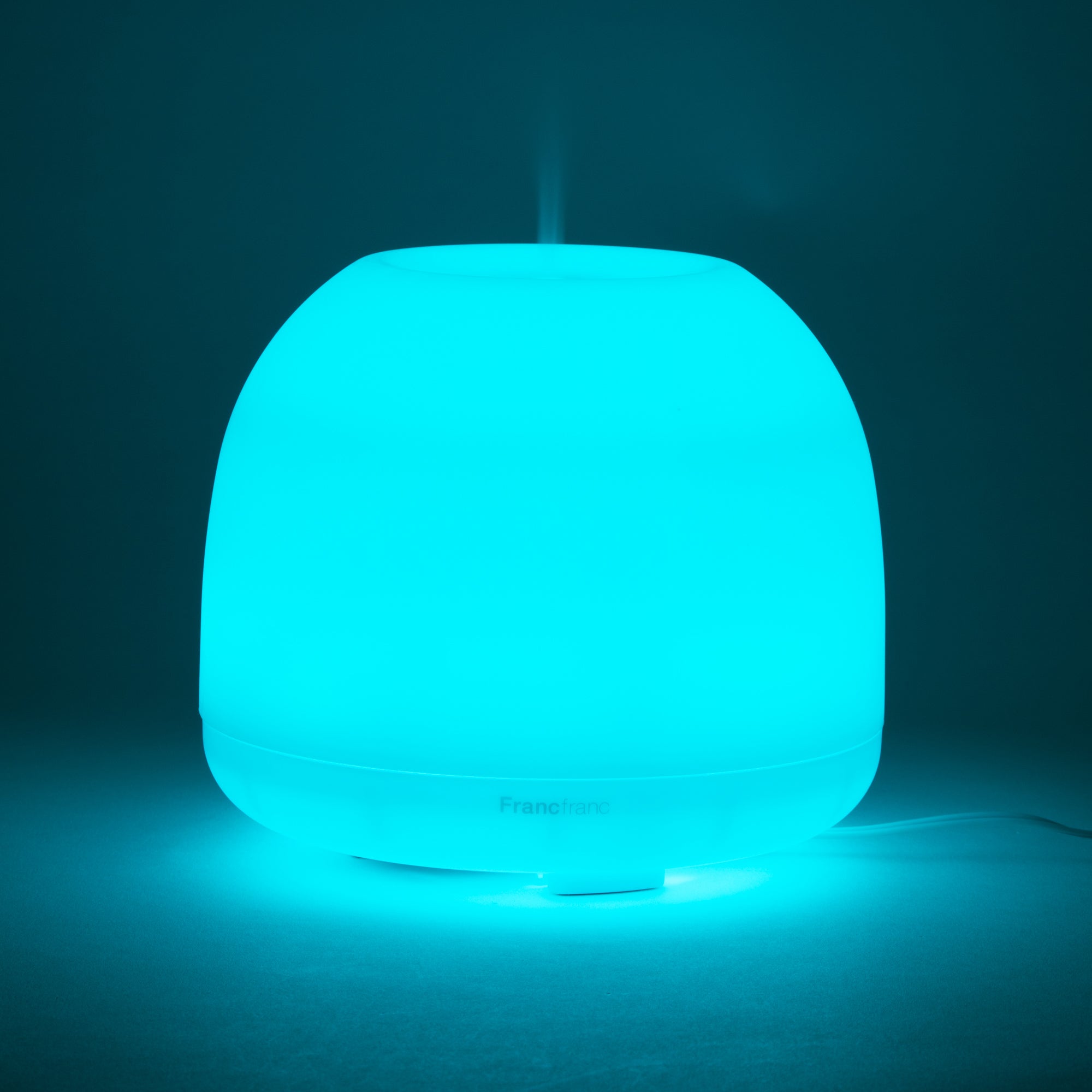 ころんと可愛らしい超音波式アロマ加湿器です。デスクやテーブルなど小さなスペースに最適なコンパクトサイズですが、長時間しっかりうるおいます。LEDの色はお好みのカラーを選んで固定することができます。使用されるシーンによって組み合わせてみては。また、3段階のタイマーが付いて省エネにも貢献します。Francfrancの超音波加湿器アロマ対応のデザイン性の高い加湿器。お部屋のインテリアに溶け込む、Francfrancならではの見た目が特徴です。タンク容量も大きく、省エネ設計もポイント。