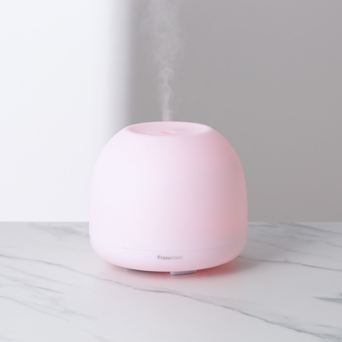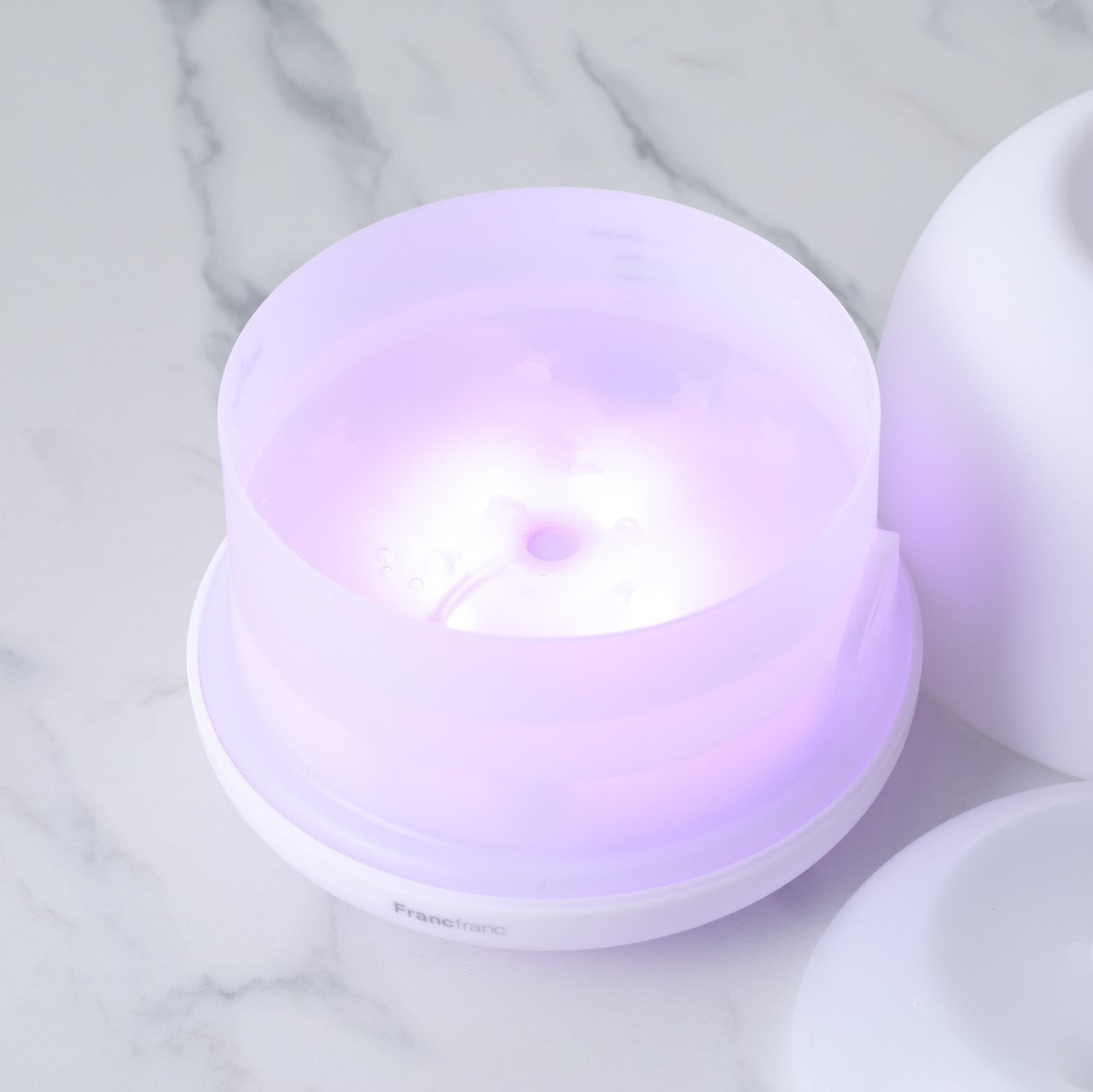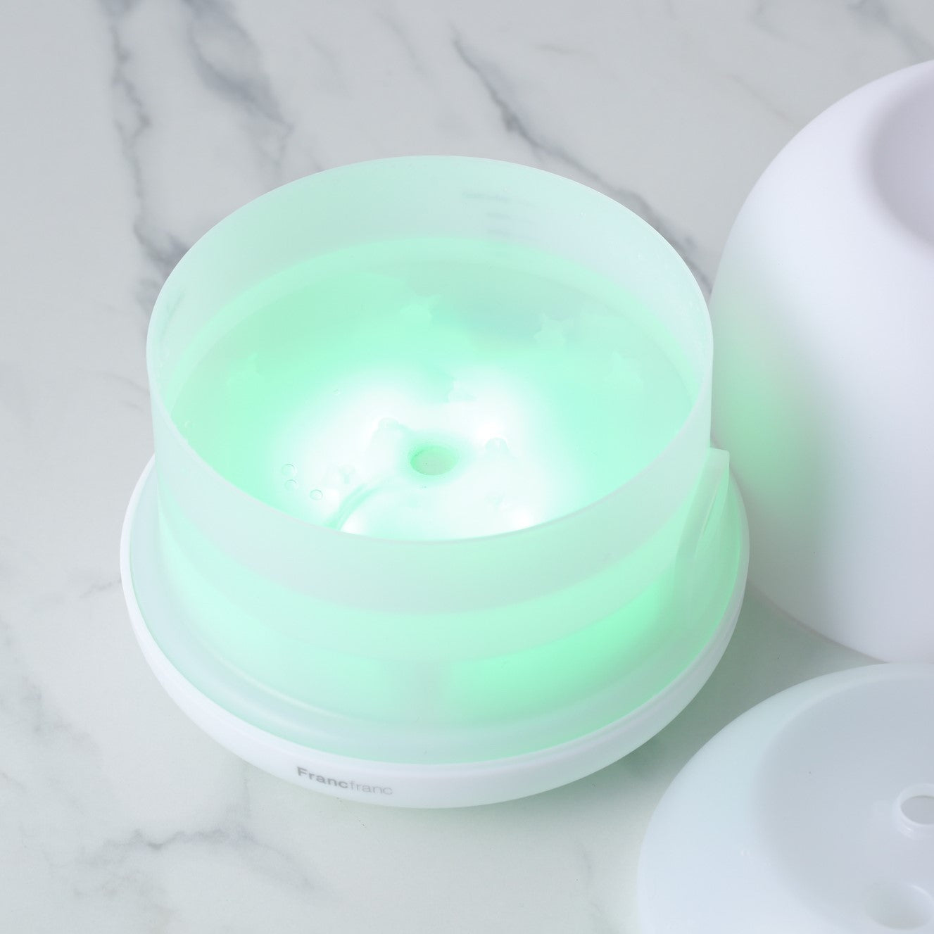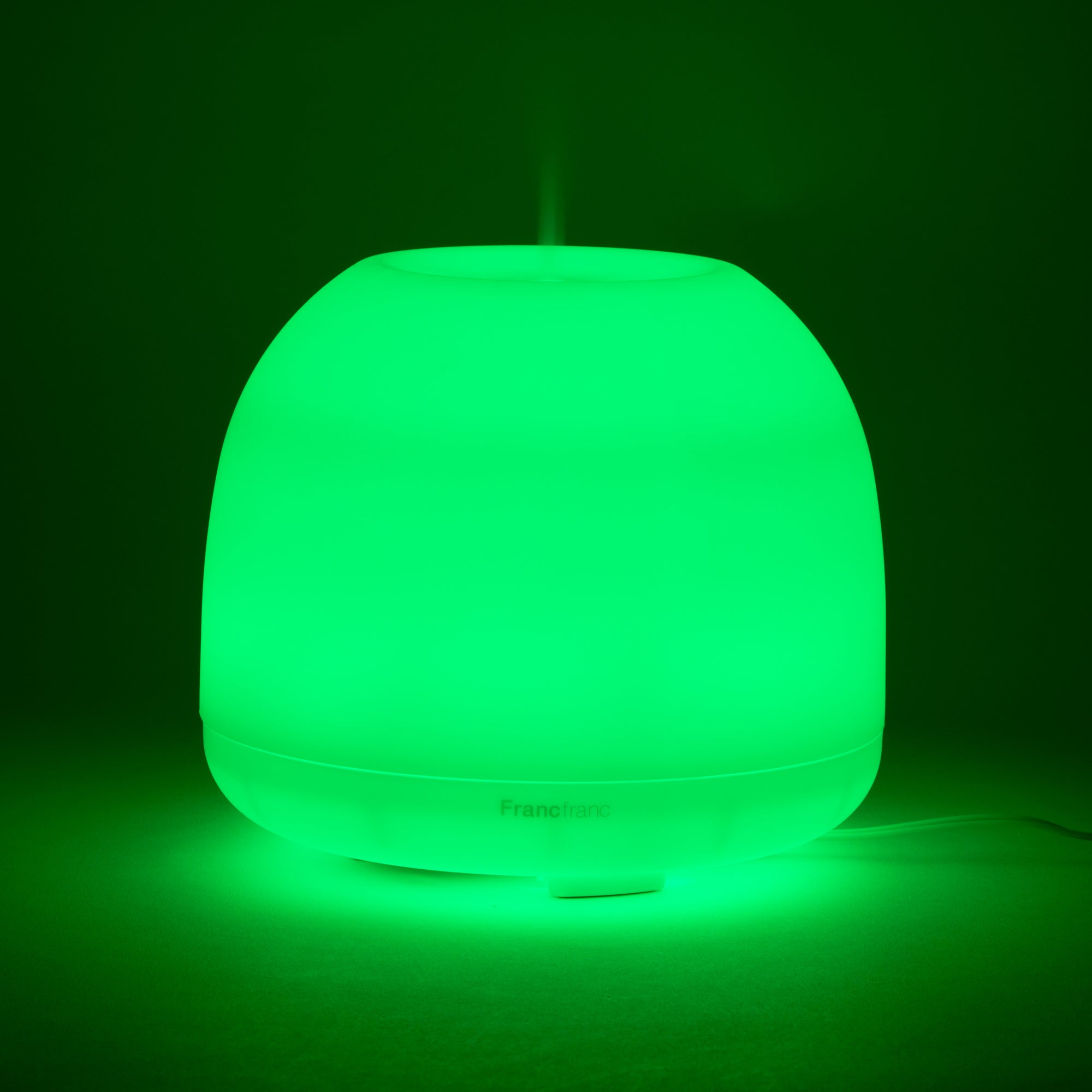 ころんと可愛らしい超音波式アロマ加湿器です。デスクやテーブルなど小さなスペースに最適なコンパクトサイズですが、長時間しっかりうるおいます。LEDの色はお好みのカラーを選んで固定することができます。使用されるシーンによって組み合わせてみては。また、3段階のタイマーが付いて省エネにも貢献します。Francfrancの超音波加湿器アロマ対応のデザイン性の高い加湿器。お部屋のインテリアに溶け込む、Francfrancならではの見た目が特徴です。タンク容量も大きく、省エネ設計もポイント。