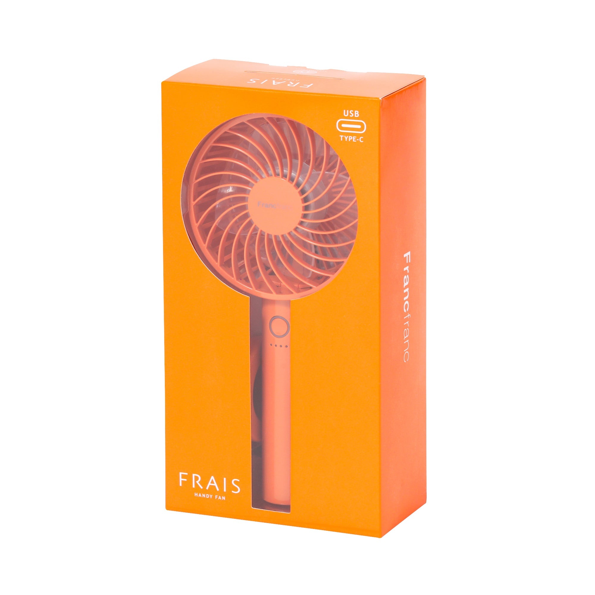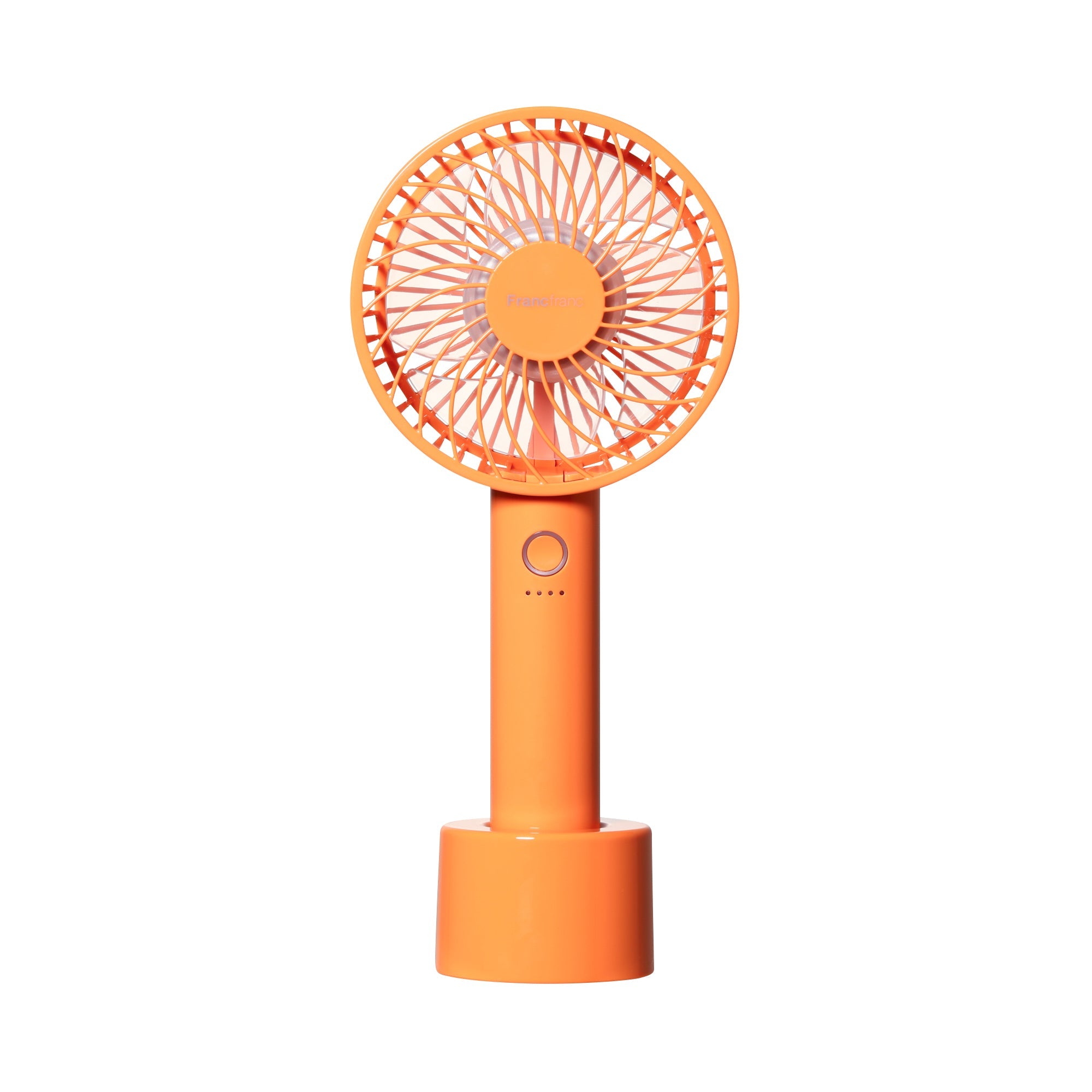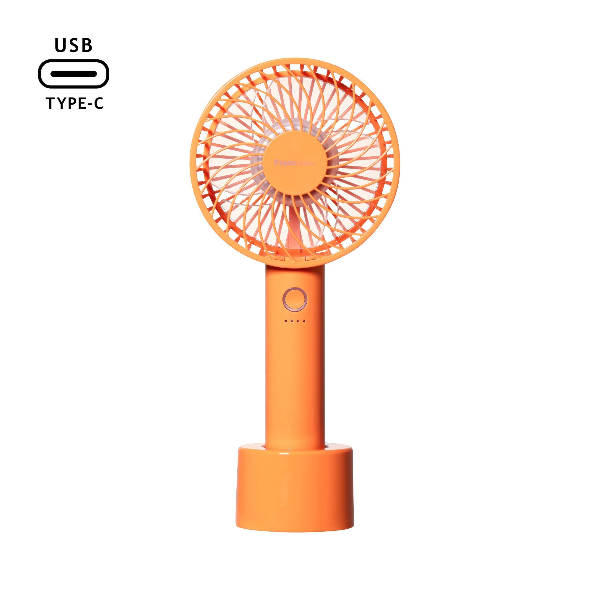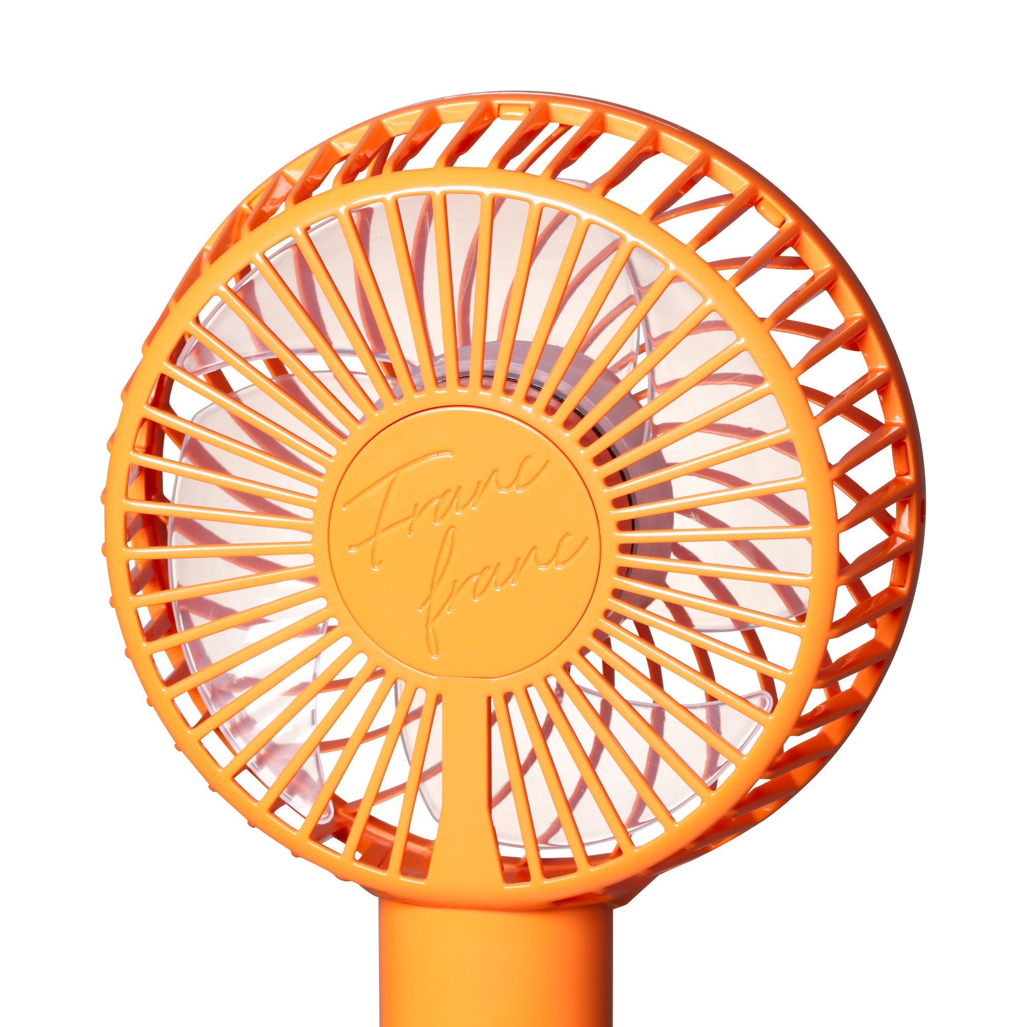 【ハンディファン買い替えキャンペーンクーポン利用対象品】※クーポン利用期間:2024年3月22日(金)10:00~2024年6月23日(日)23:59▼詳細はこちらハンディファン買い替えキャンペーン================夏の定番「フレハンディファン」卓上でも携帯型でも使える2WAYタイプのUSB充電式ハンディファンが今年も登場!ファッションに合わせて選べる豊富なカラーバリエーションで、今年もFrancfrancが「持ち歩ける涼しさ」をお届けします。強力な5段階の風+リズム風風量は弱~強モードの5段階+リズム風をボタンひとつで簡単に調節できます。手軽な携帯型ながらしっかりと涼しさを感じられるパワフルタイプ。強力な風で熱中症対策にも効果的です。うれしい2電源対応USB電源と充電池の2電源に対応。付属の専用充電スタンドやパソコンのUSBポートからも充電できます。また、2024年モデルよりUSB Type-Cを採用しています。充電池使用の場合は約4時間で充電完了。風力「最大」で約2時間、「微弱」ならたっぷり9時間の連続運転が可能です。「涼しい」を持ち運ぶ便利なコードレスタイプだからいつでもどこでも使い方自由自在です。フェス、イベント、スポーツ観戦、通勤・通学時など様々なシーンで活躍します。持ち運びに便利なストラップ付き。付属の専用充電スタンドを使えば手がふさがっている時も安心。デスクや洗面所、キッチンなど、お好きな場所にさっと移動してスモールスペースを涼やかに心地よくキープできます。ストラップホールが3か所あるのでネックストラップ(別売り)をセットして首に掛けて持ち歩くことも可能。電源スイッチがへこんでいるからバッグにそのまま入れても誤作動を防ぎ、安全に持ち運べます。サイズW103×D37×H218mm素材ABS、ポリプロピレン(PP)重量0.18 kgカラーOR品番 1109100030487 全国一律550円(税込)です。雑貨の商品金額合計が5,000円(税込)以上の場合、送料無料で配送いたします。※手数料、ラッピング料、付帯サービス料は含みません。※新生活期・年末年始は出荷や配送の繁忙期となるため、日時指定をいただいてもご希望日時通りお届け出来ないことがございます。■付属品:専用充電スタンド、充電用USBケーブル、ストラップ■電池:リチウムイオン蓄電池■コードレス対応(バッテリー交換不可)■USBコネクタ規格:USB Type-C■充電時間:約4時間※接続機器の電源供給能力によって極端に長くなる場合があります。■充電回数:約300回■電源:DC5V 1000mA(USB充電式)■バッテリー容量:2000mAh■連続使用時間:最大風力時約2時間~最小風力時約9時間※使用する風量の強さによって異なります。■風量:5段階調節+リズム風■抗菌加工:有※抗菌効果は永続的ではありません。すべての菌に効果があるわけではありません。ハネには抗菌効果はありません。■ガードデザイン:ストレートタイプ■別売部品:有(専用回転スタンド、専用クリップ)※過去モデルのフレハンディファンクリップにも対応しています。■取扱説明書:有■保証書:有 保証期間:6ヶ月■故障の原因になるため、必ず付属のケーブルをご使用ください。■原産国:中国>>よくあるご質問・お問い合わせはこちら