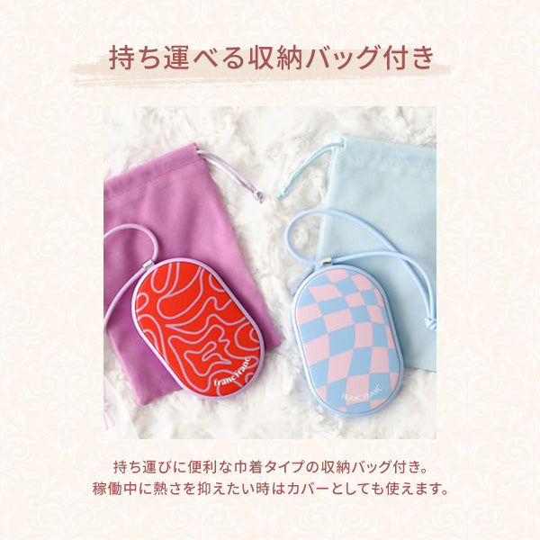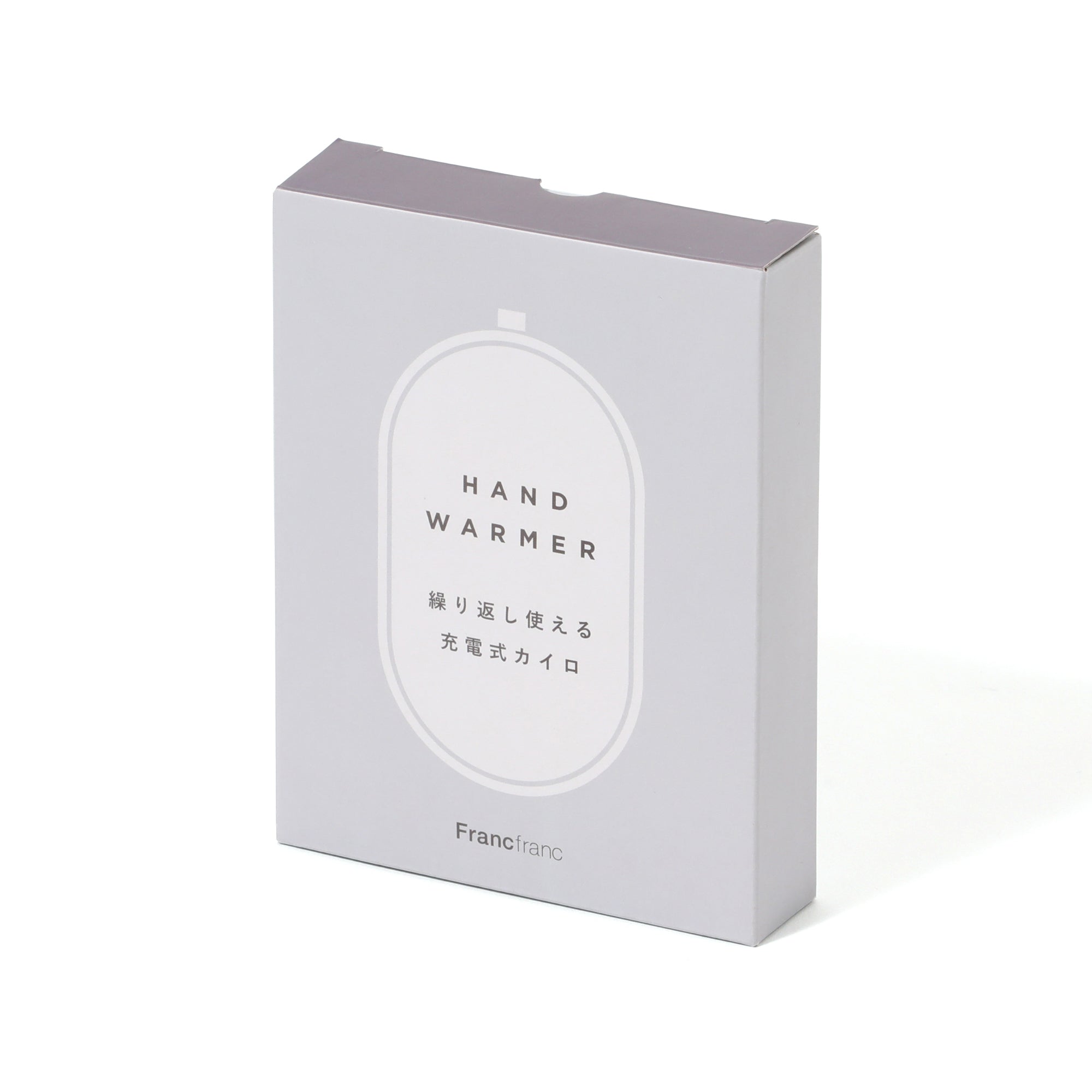 「使い捨てない」カイロです。 スイッチを入れたらわずか10秒で温まり、最大3.5時間持続します。 充電式なので繰り返し使うことができ、経済的です。 暖かさは強・弱の2段階で調整できます。 付属のUSBコードをACアダプターやパソコンに繋いで充電でき、モバイルバッテリーとしても利用可能です。 カラーバリエーションを豊富に揃え、ワンポイントにFrancfrancのロゴをあしらいました。 ころんとした形がかわいいオーバルの本体は手に馴染みやすく実用性も抜群です。 本体底面に充電コネクターと電源スイッチの必要最低限の機能を配置した設計で、機械が苦手な方でも簡単に扱えます。 持ち運びに便利な巾着タイプの収納バッグ付き。 鞄やポケットの中で本体に傷がつくことを防げるだけでなく、稼働中に熱さを抑えたい時はカバーとしても使えます。 手のひらサイズで通学や通勤の普段使いにぴったり。 ストラップを手首に通せば、道を歩いている時も電車やバスの座席から立ち上がる時も手元から滑り落ちずに安心です。
