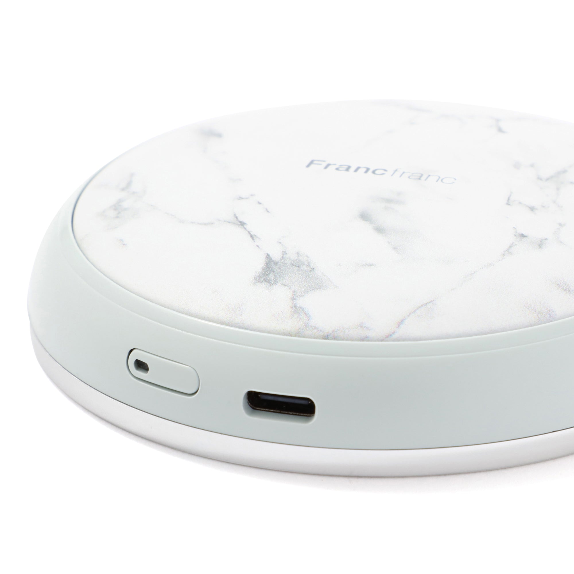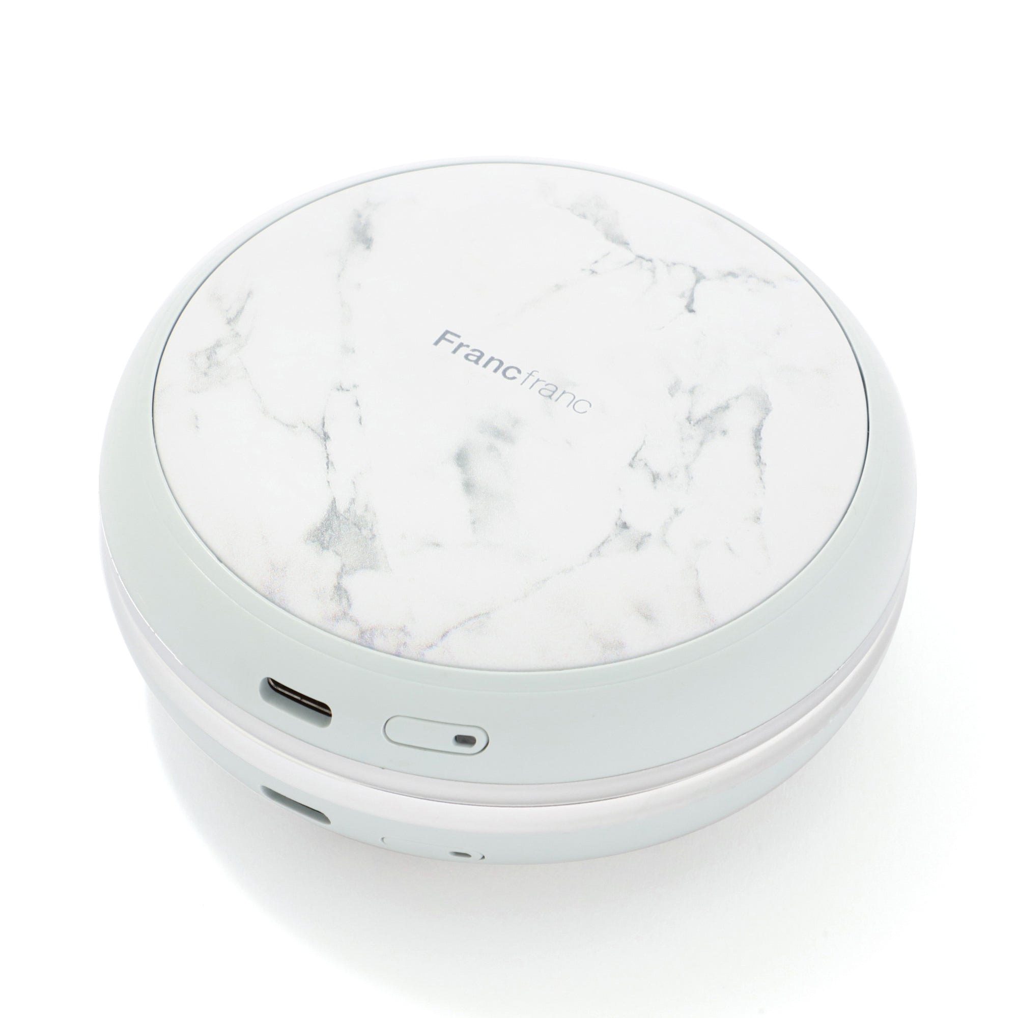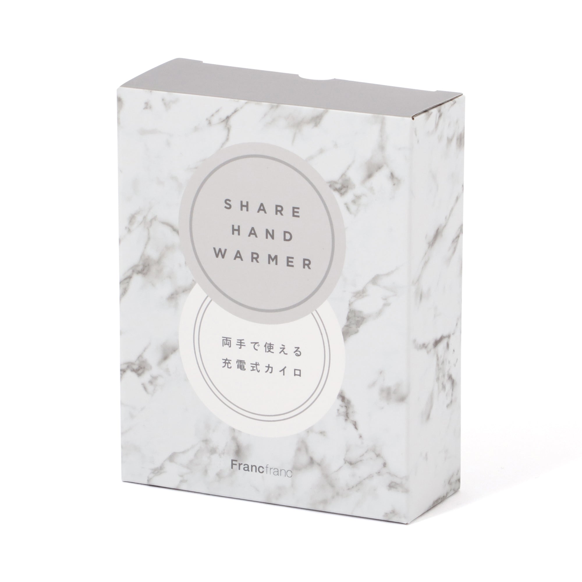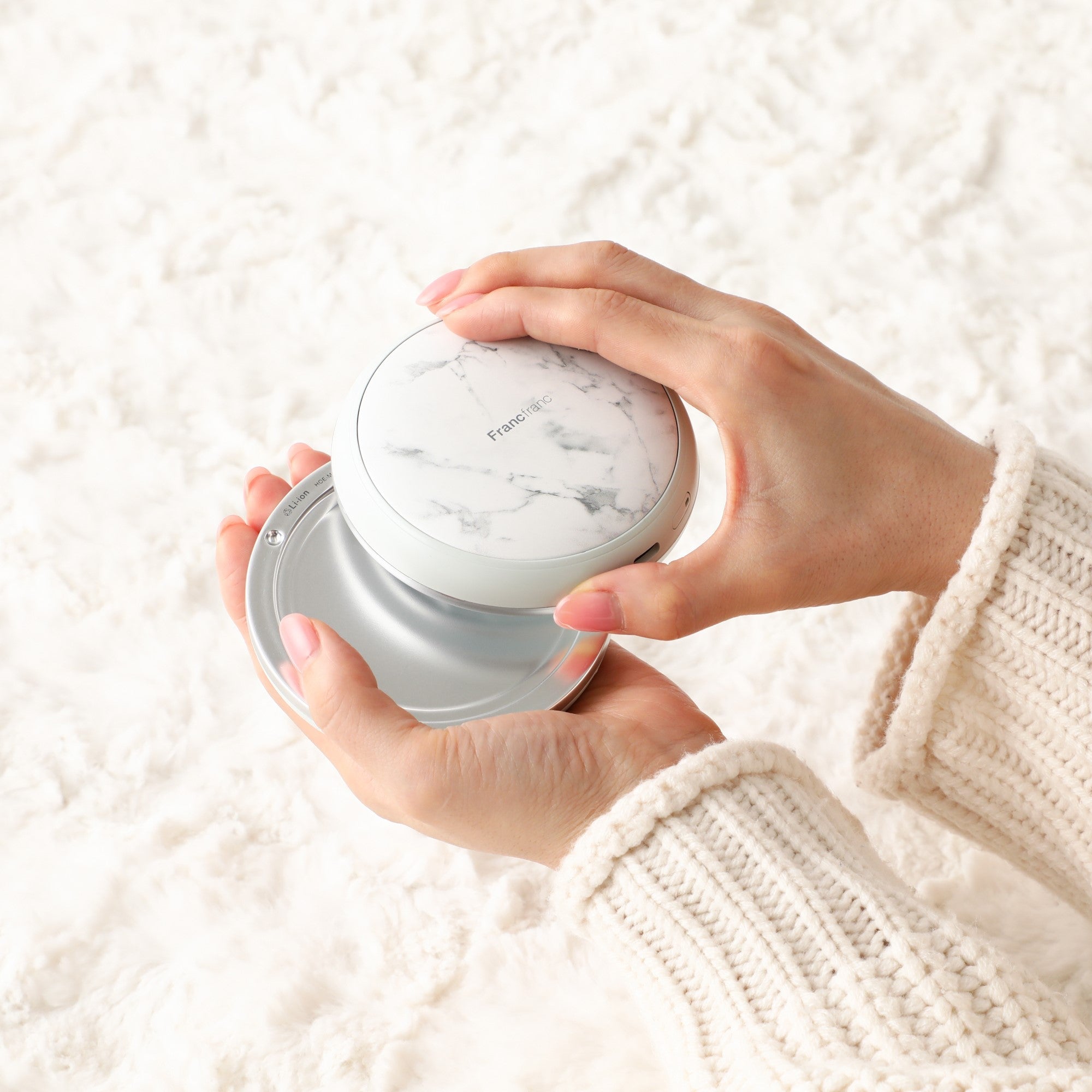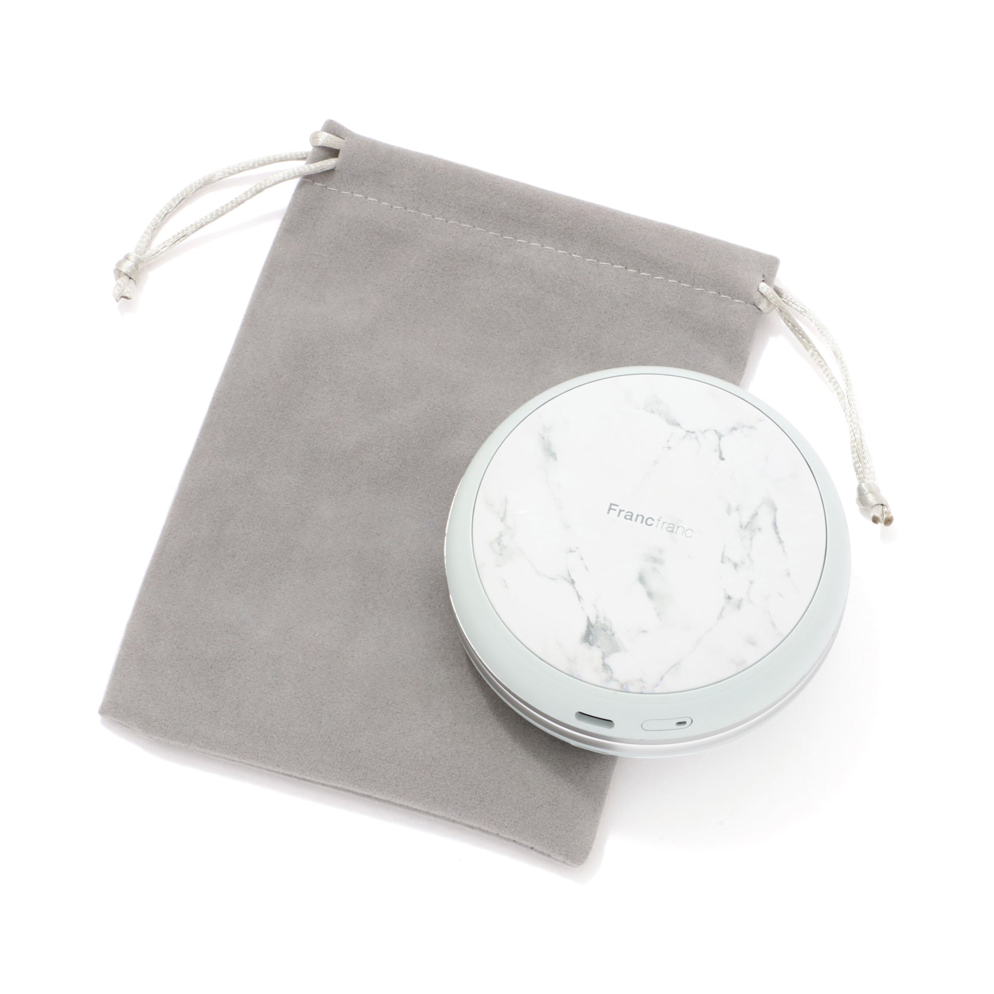 「使い捨てない、シェアする」カイロです。 2つに分かれるので友人や家族とシェアしたり、両手で使ったりと使い方いろいろ。 スイッチを入れて、わずか5秒ほどで温かさを感じられます。 充電式なので繰り返し使うことができ、経済的です。 温かさは強・弱の2段階で調整できます。 付属のUSBコードをACアダプターやパソコンに繋いで充電でき、モバイルバッテリーとしても利用可能です。 ダブルクリックで電源をいれられるため、バッグなどでの誤作動を防止します。 2つに分かれた片方にはミラーついており、お出かけの際の身だしなみチェックにも使用できます。 持ち運びに便利な巾着タイプの収納バッグ付きです。
