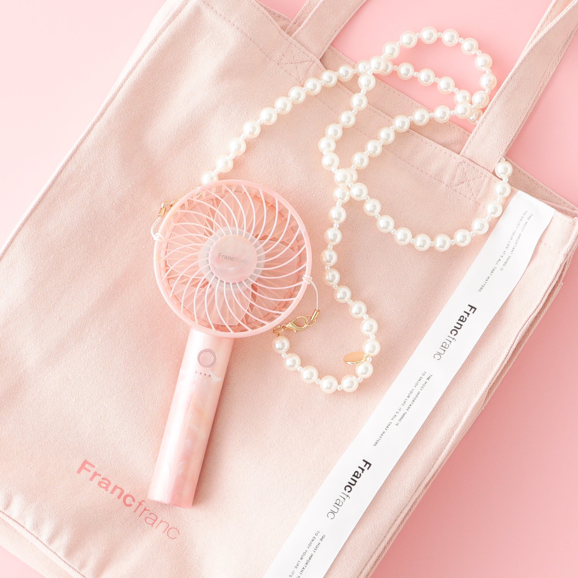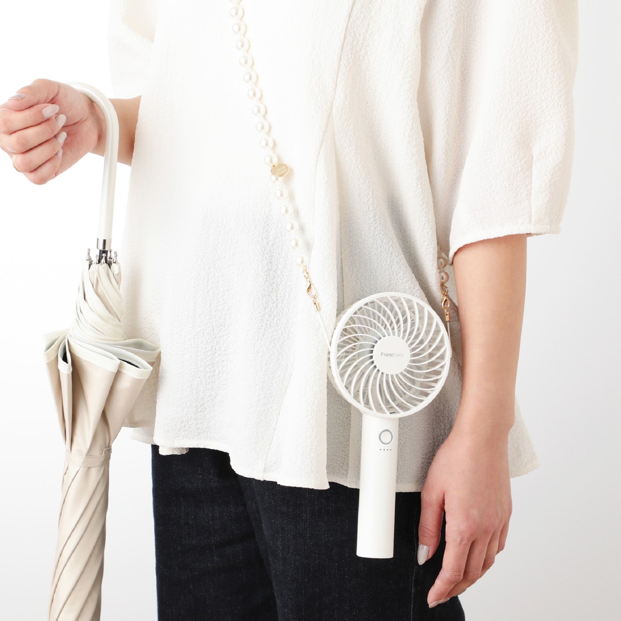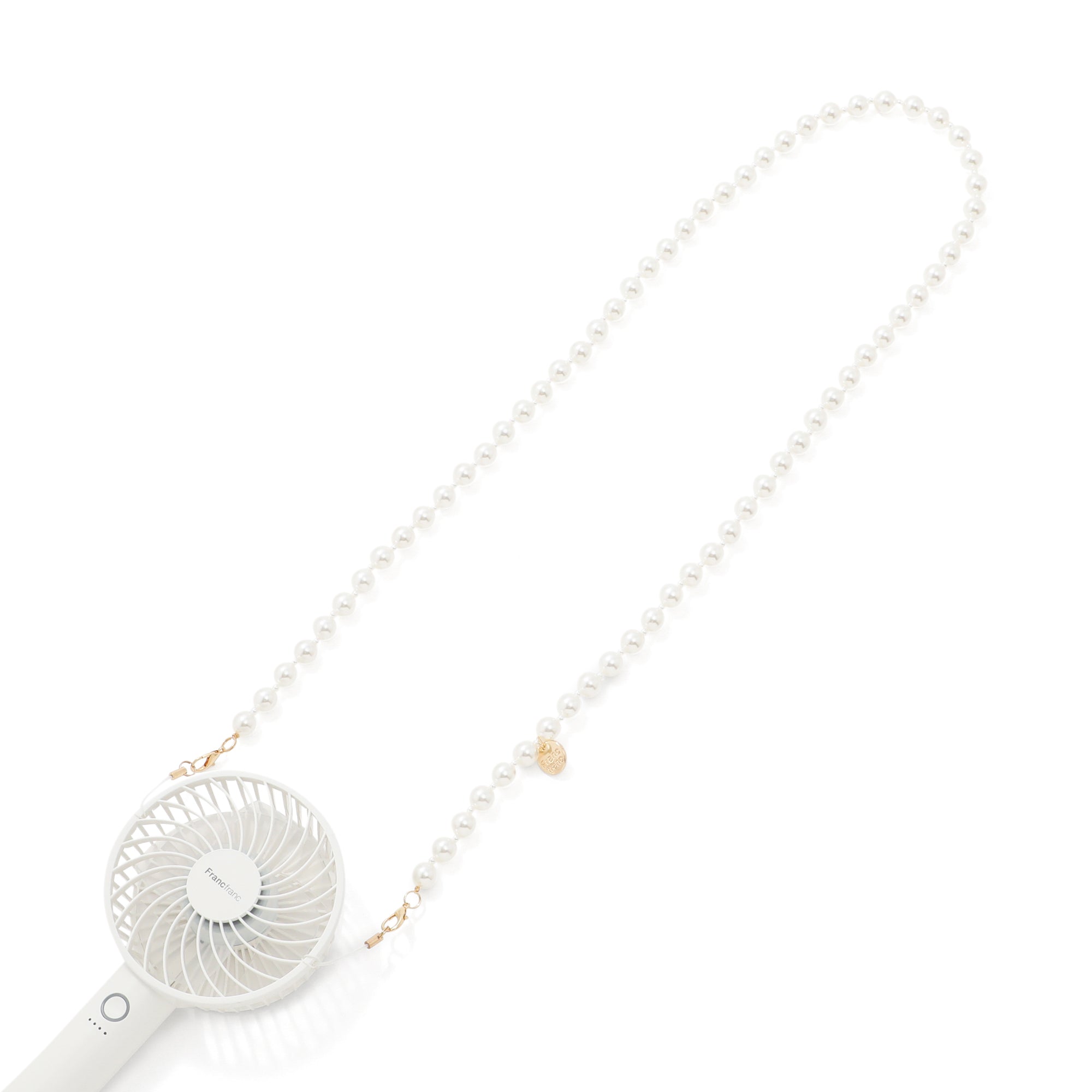 フレ シリーズのファンに取り付けることができるネックストラップです。かわいらしいパールデザインで、ハンディファン オーロラとのコーディネートにぴったりです。金具を繋げてマルチストラップとしても使用可能。ショルダー使いもオススメです。※耐荷量200g