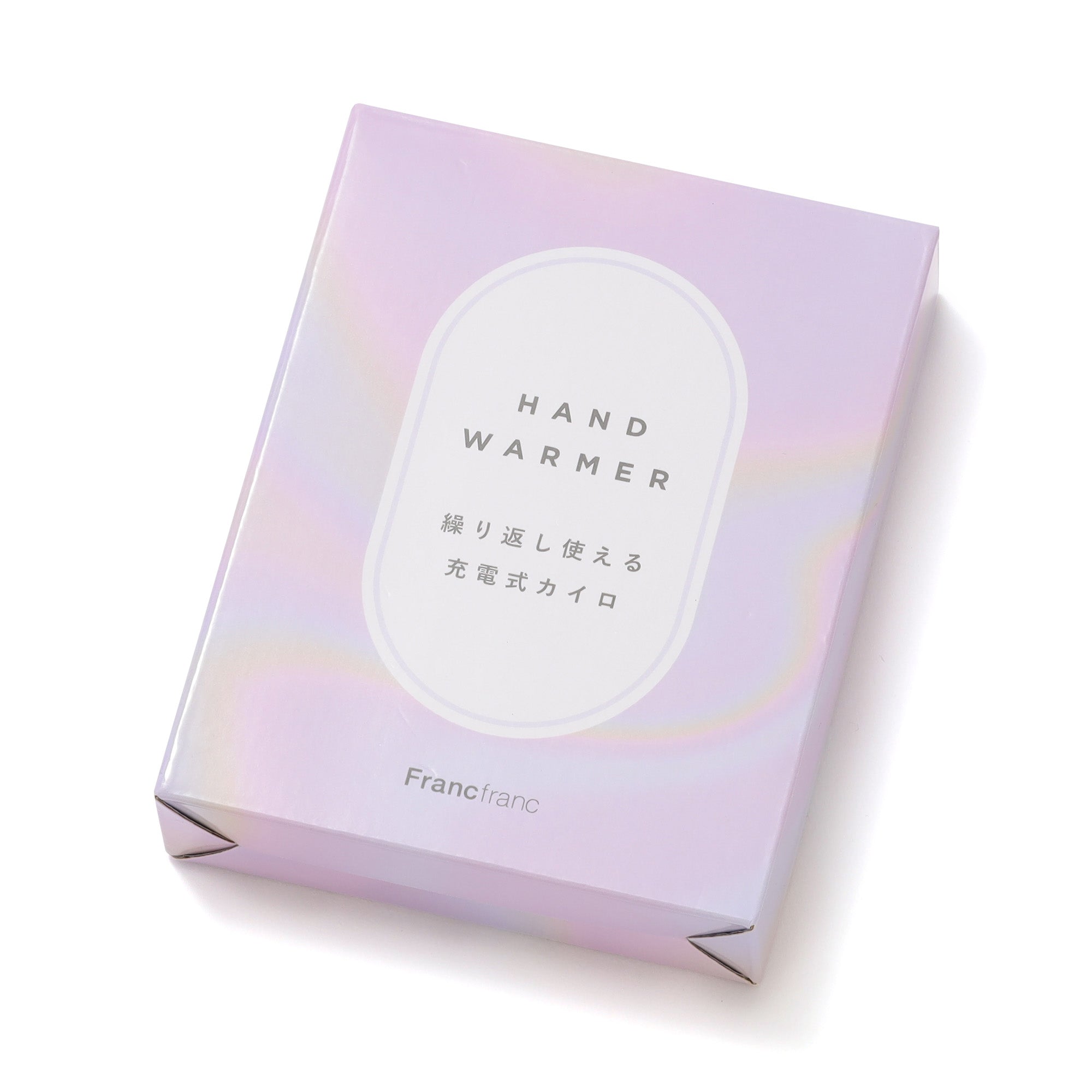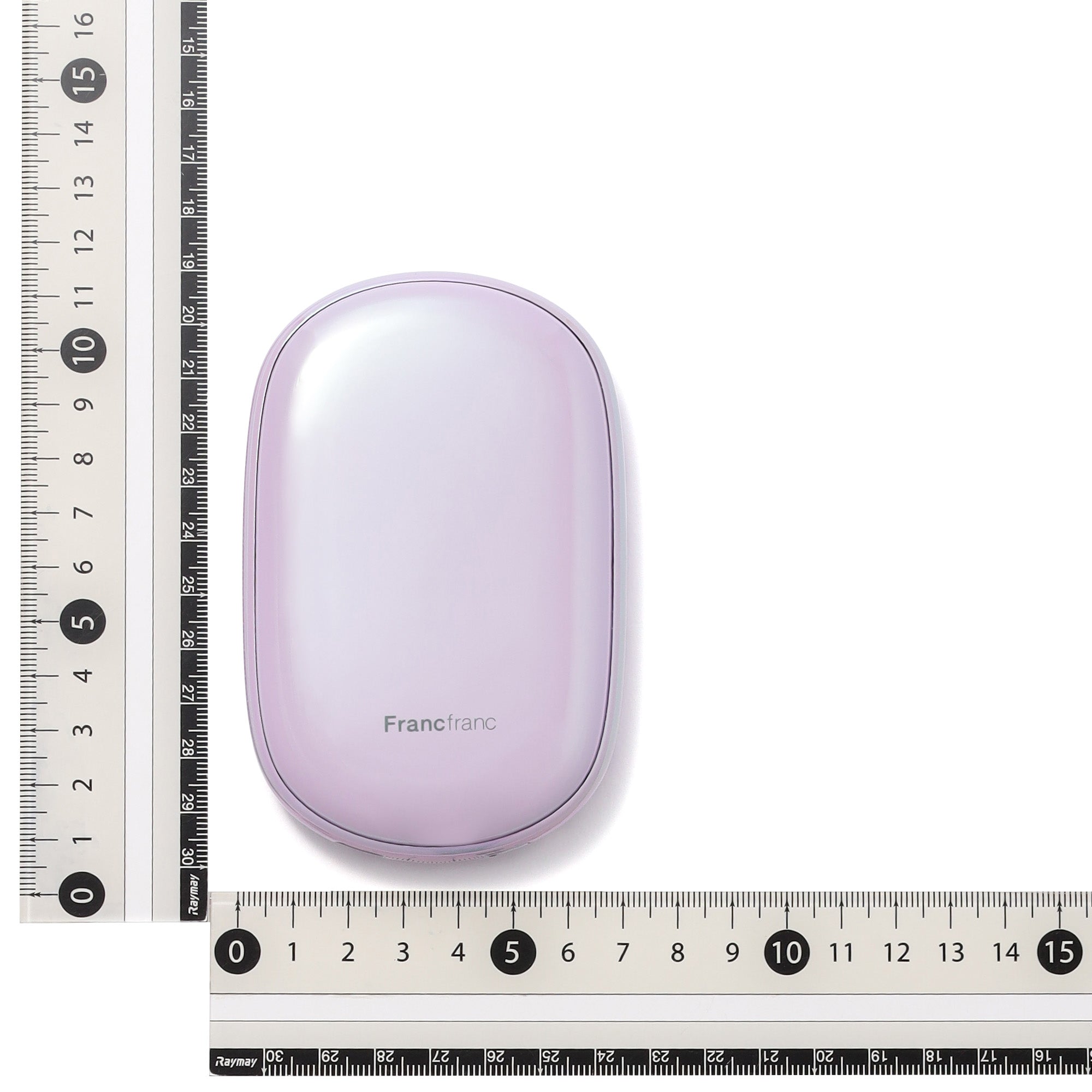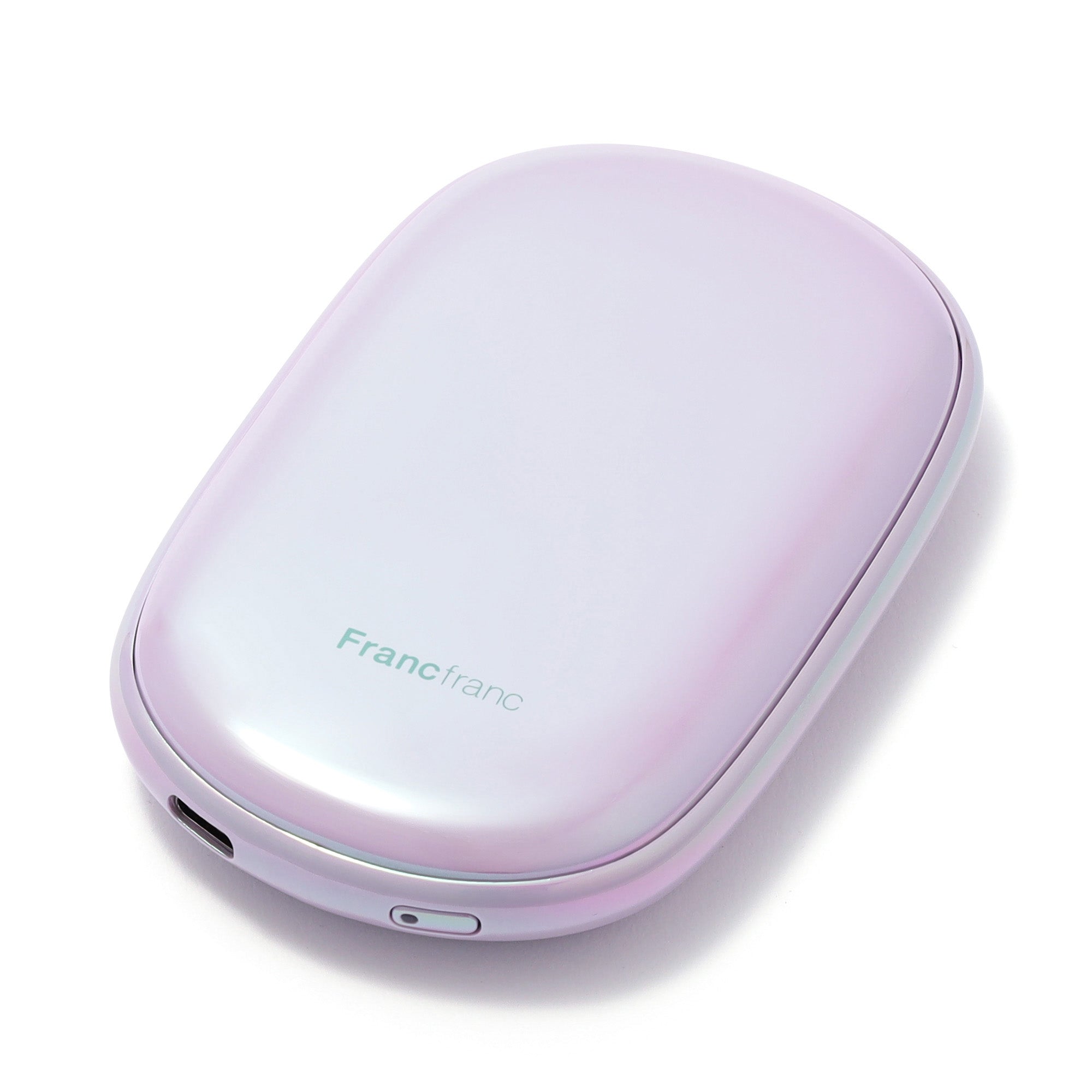 「使い捨てない」カイロです。スイッチを入れたらわずか10秒で温まり、最大約5時間持続します。充電式なので繰り返し使うことができ、経済的です。暖かさは強(約50℃)・弱(約45℃)の2段階で調整できます。付属のUSBコードをACアダプターやパソコンに繋いで充電でき、モバイルバッテリーとしても利用可能です。(2025年モデルから充電コードがtypeC-Cに変更になりました。)カラーバリエーションを豊富に揃え、ワンポイントにFrancfrancのロゴをあしらいました。ころんとした形がかわいいオーバルの本体は手に馴染みやすく実用性も抜群です。本体底面に充電コネクターと電源スイッチの必要最低限の機能を配置した設計で、機械が苦手な方でも簡単に扱えます。持ち運びに便利な巾着タイプの収納バッグ付き。鞄やポケットの中で本体に傷がつくことを防げるだけでなく、稼働中に熱さを抑えたい時はカバーとしても使えます。手のひらサイズで通学や通勤の普段使いにぴったり。ストラップを手首に通せば、道を歩いている時も電車やバスの座席から立ち上がる時も手元から滑り落ちずに安心です。