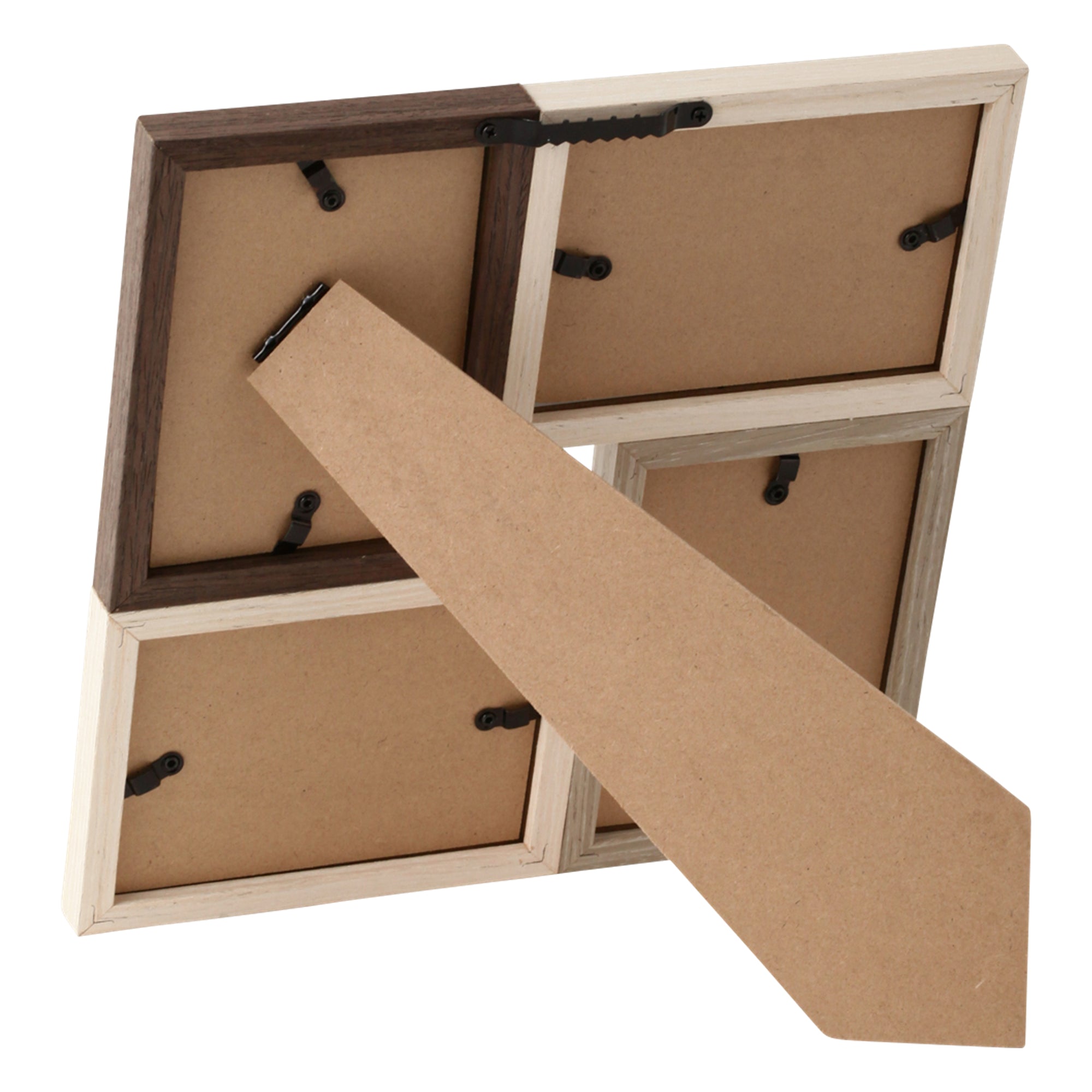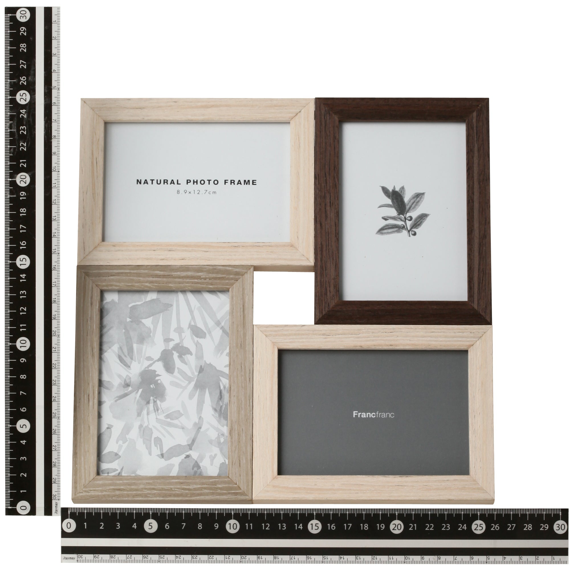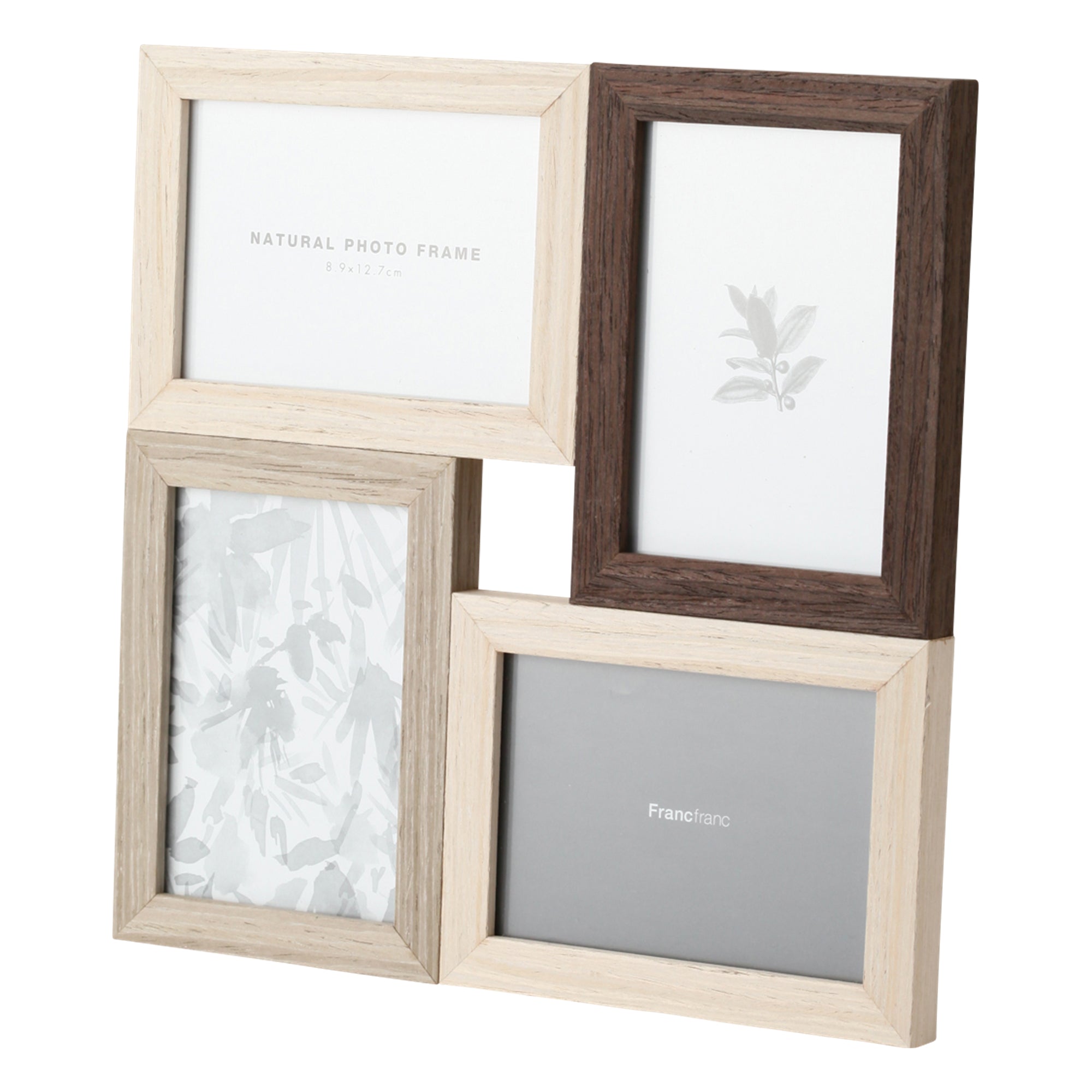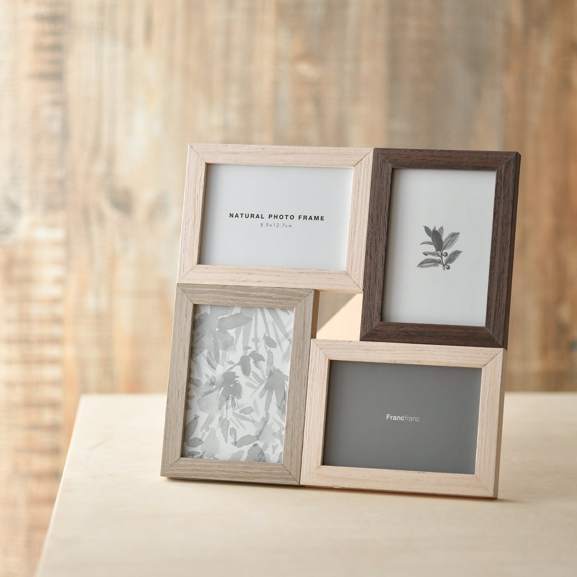 天然素材を使用した木シートを貼り、木の温かみを残したフォトフレームです。写真をかえるのも簡単なので、いつもとっておきの写真を飾ることができます。木目調の温かみのあるフレームで、お部屋をナチュラルで柔らかい印象にします。どんなテイストの写真も合うので様々なシーンで重宝します。色の違うウッドの組み合わせがおしゃれで、写真以外にもお好きなアートなどを飾るのにもぴったりです。壁に掛けて使うこともできます。シンプルなデザインの為、ギフトとしてもおすすめアイテムです。エントランスやリビング、ベッドルームなど様々なシーンに合います。L判サイズの写真を縦に2枚、横に2枚入れることができます。