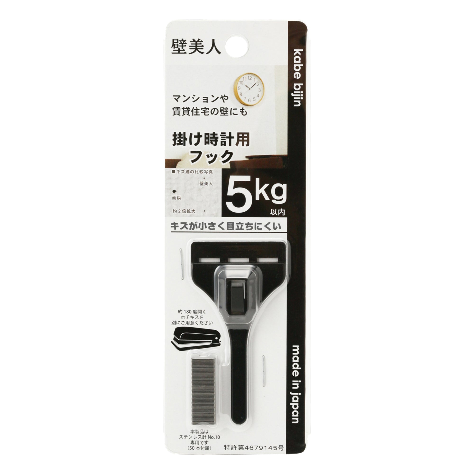 石膏ボード壁や板壁に、時計やミラー、アートボードなどの取り付けができる便利なフックです。本体を壁にホチキスで固定するだけ。壁の傷が非常に目立ちにくいので、賃貸住宅などにもおすすめです。