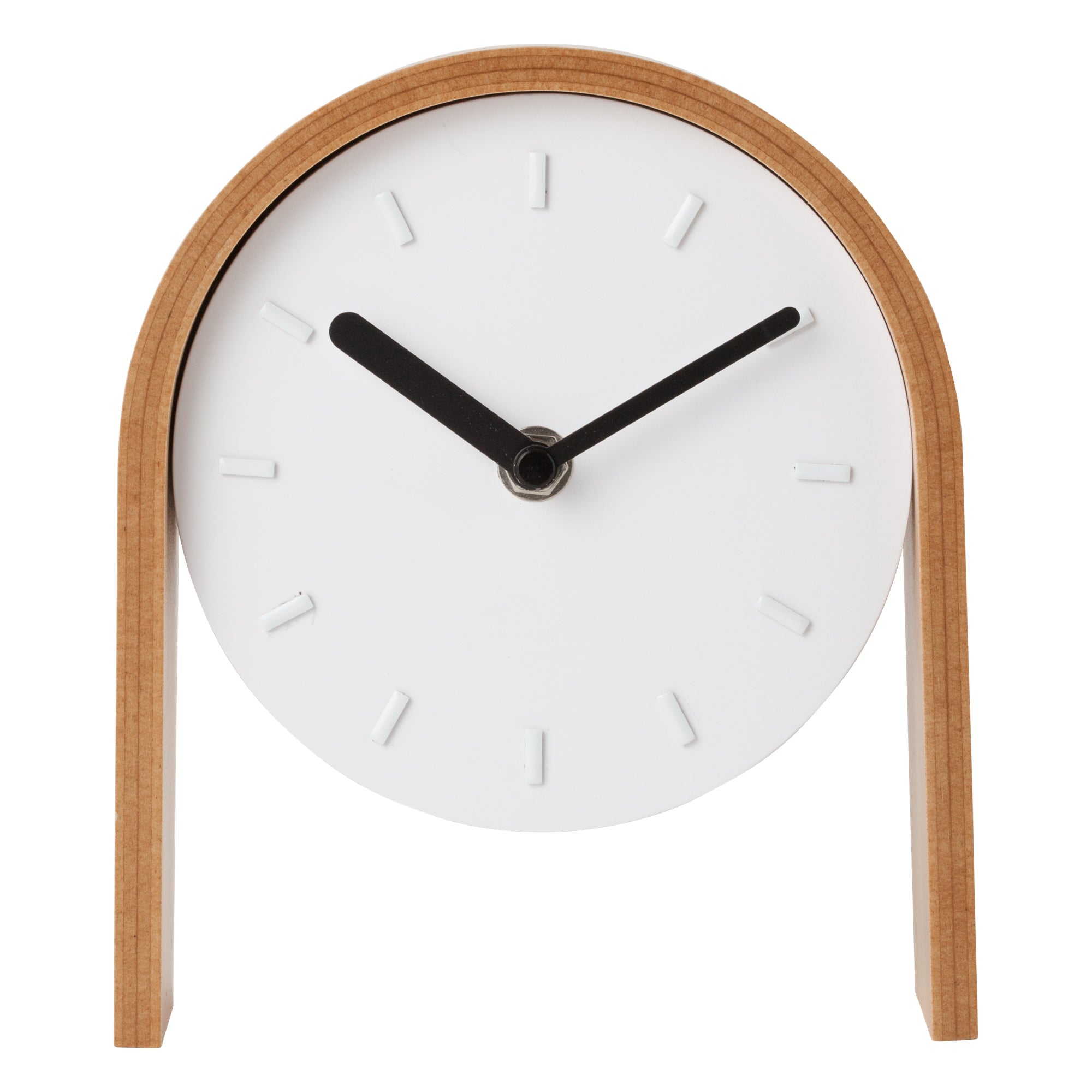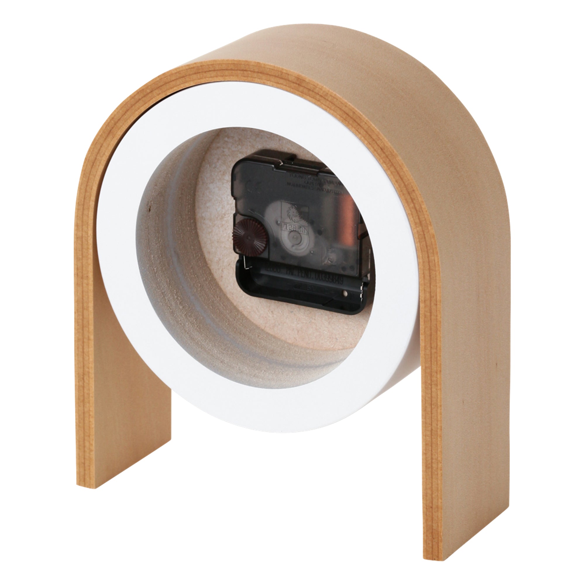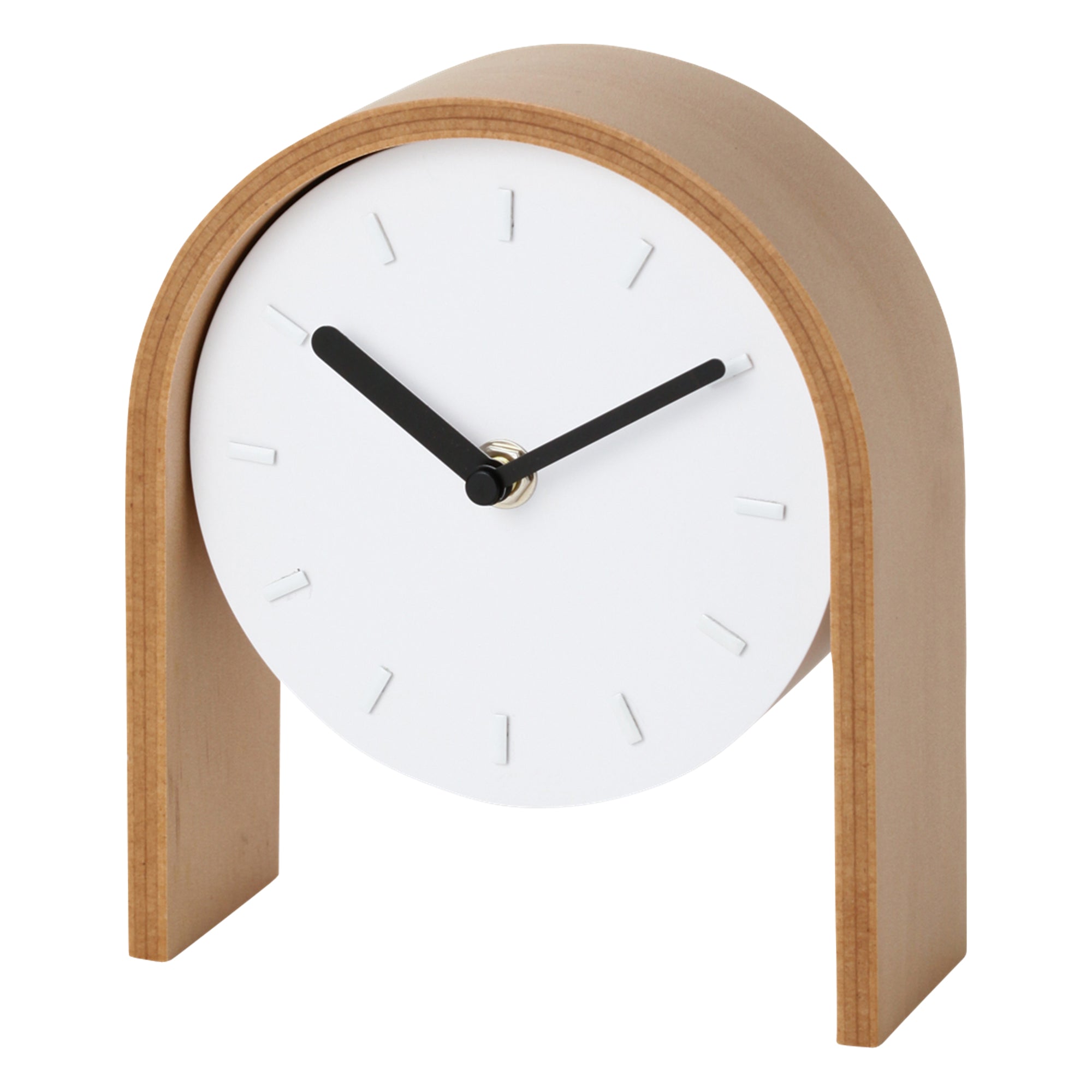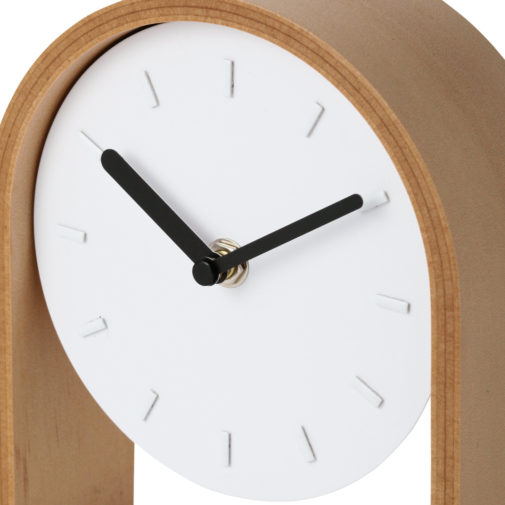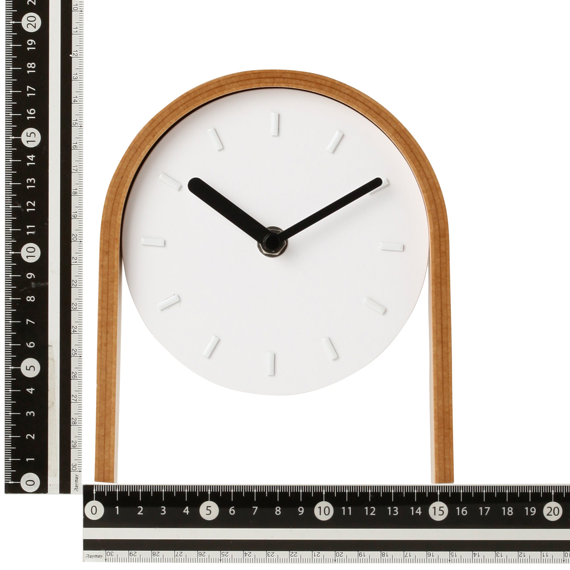 柔らかいウッドカラーとホワイトの組み合わせがインテリアに合わせやすい置き時計です。 スイープムーブメントを使用しており、カチカチ音が鳴りにくい仕様です。 寝室や書斎に置いても音が気になりません。 ※秒針は付いておりません。 木目調のフレームにシンプルな文字盤は、ナチュラルで洗練された印象になります。 インテリアのアクセントになる個性的なデザインが、ぐっとお部屋をおしゃれにします。 使用電池は用意しやすい単三乾電池1個なので、手軽なのが嬉しいです。 シンプルな色合いでで様々なテイストのお部屋に馴染みやすく、ギフトにもおすすめ。 ちょうど良いサイズの置き時計なので、玄関やリビングや窓際など、どこでも好きな場所に置くことができます。