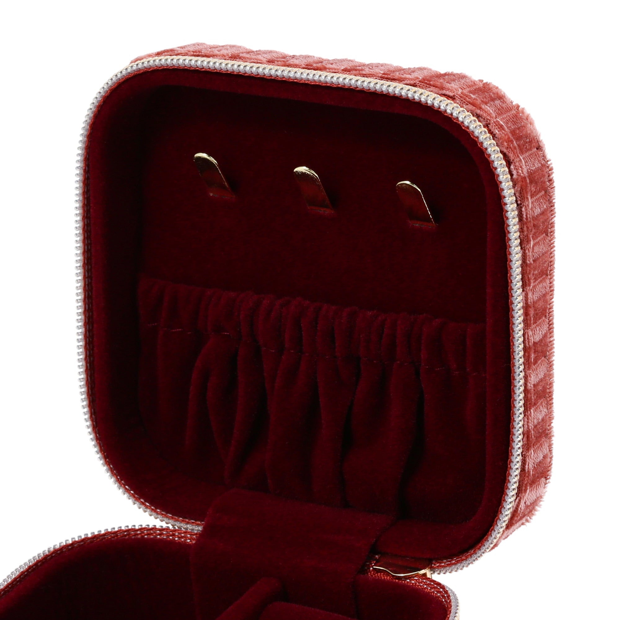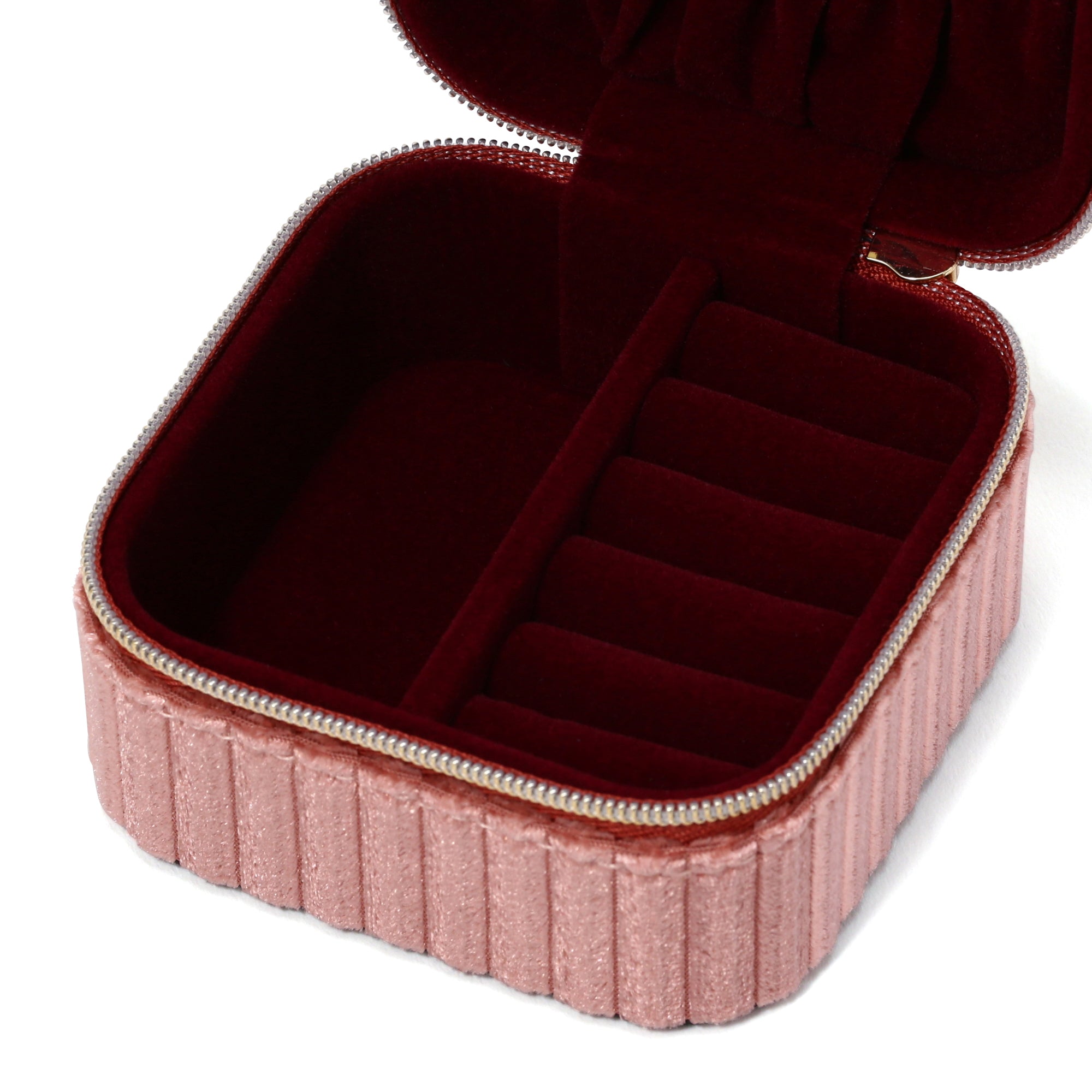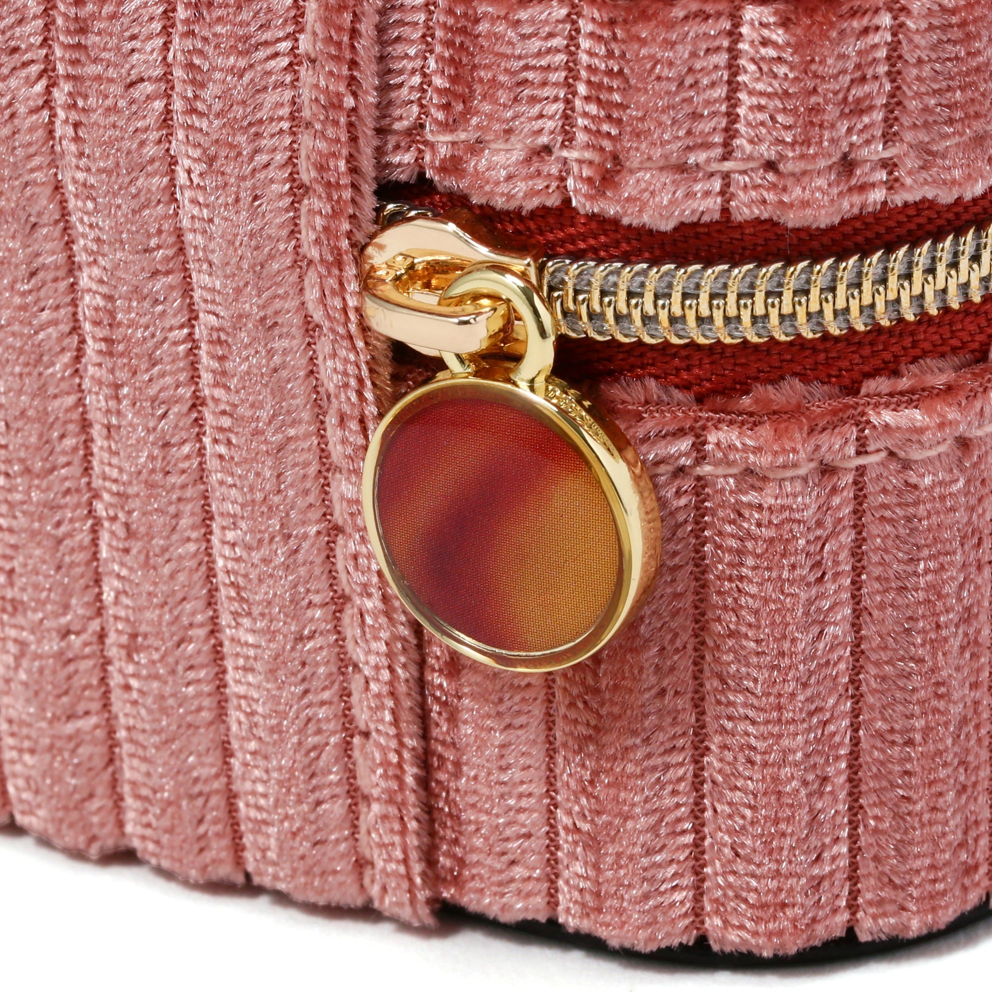 ベロア生地がポイントになったジュエリーボックスです。深みのあるカラーにストライプ柄が程よいアクセントになっています。持ち運びに便利なファスナータイプなので旅行などにも安心して携帯できます。くすみピンクが可愛すぎず、落ち着いた雰囲気なので、幅広い年代の方におすすめです。ネックレスは引っ掛けてポケットに入れて収納できるので、絡まる心配がありません。コンパクトながら、収納力は抜群です。大切なジュエリーを綺麗に収納できます。同シリーズでサイズ違いのジュエリーボックスもご用意しております。お持ちのジュエリーに合わせてお選び頂けます。