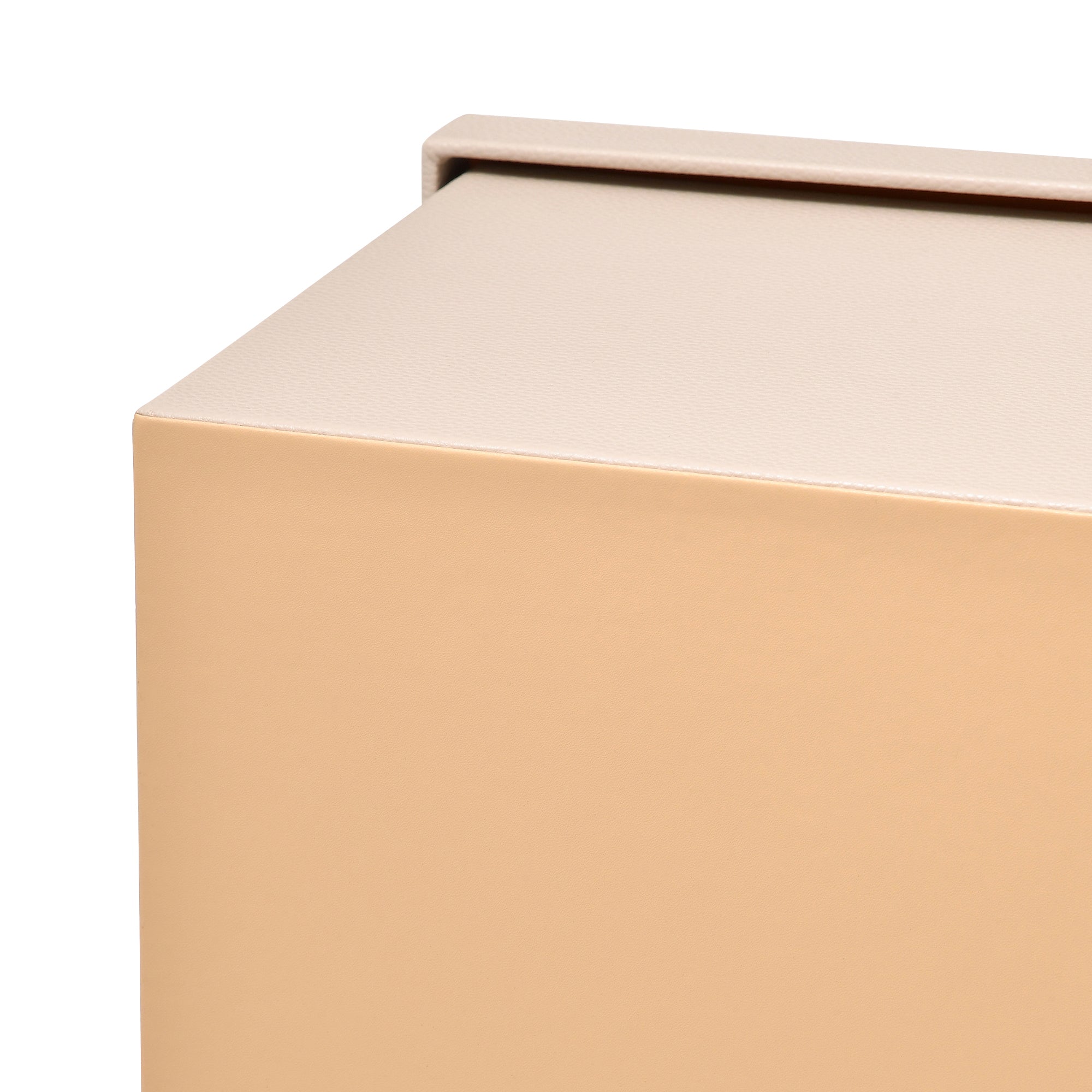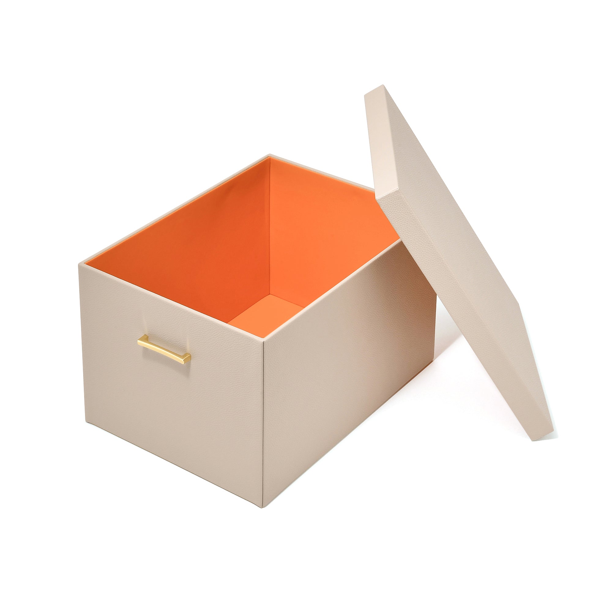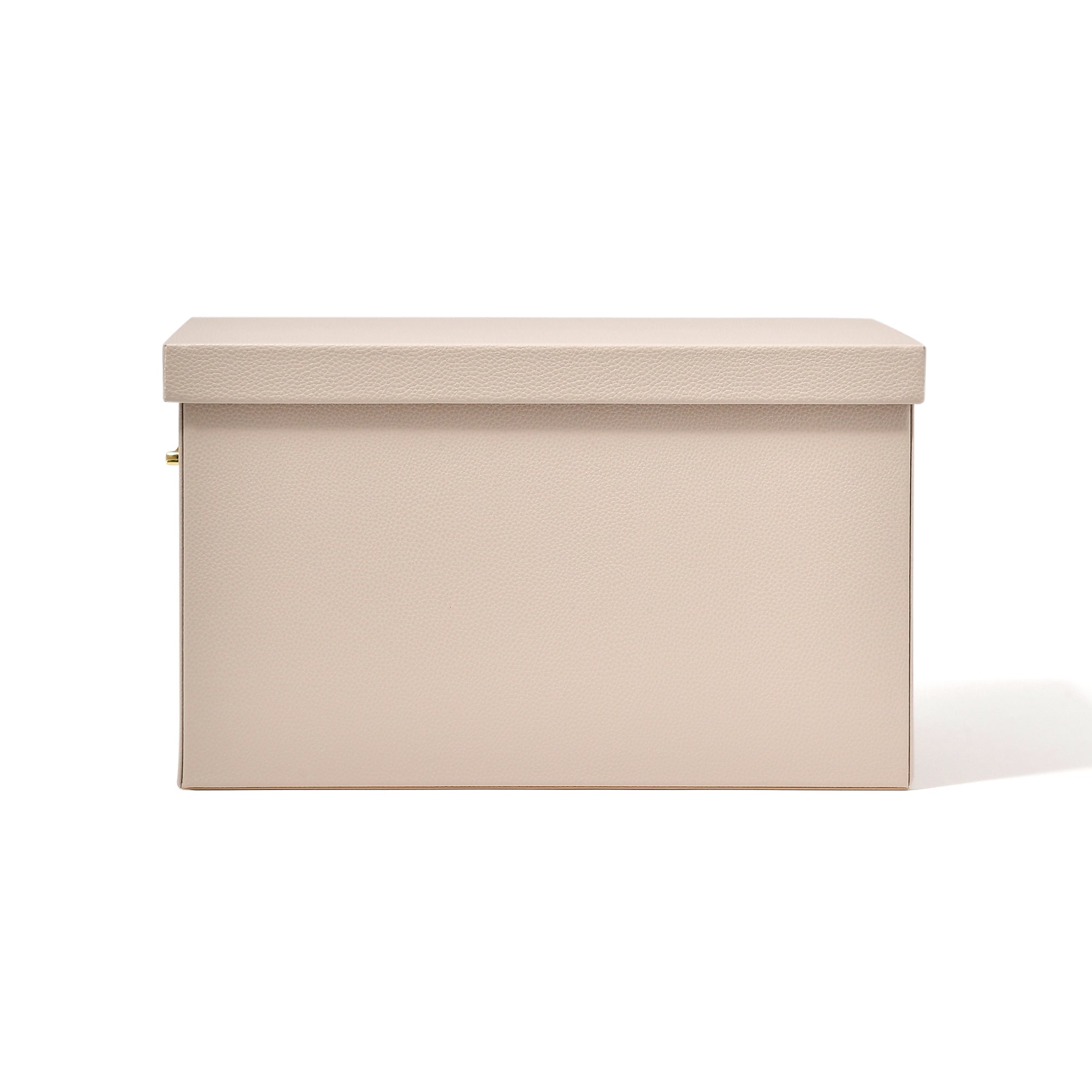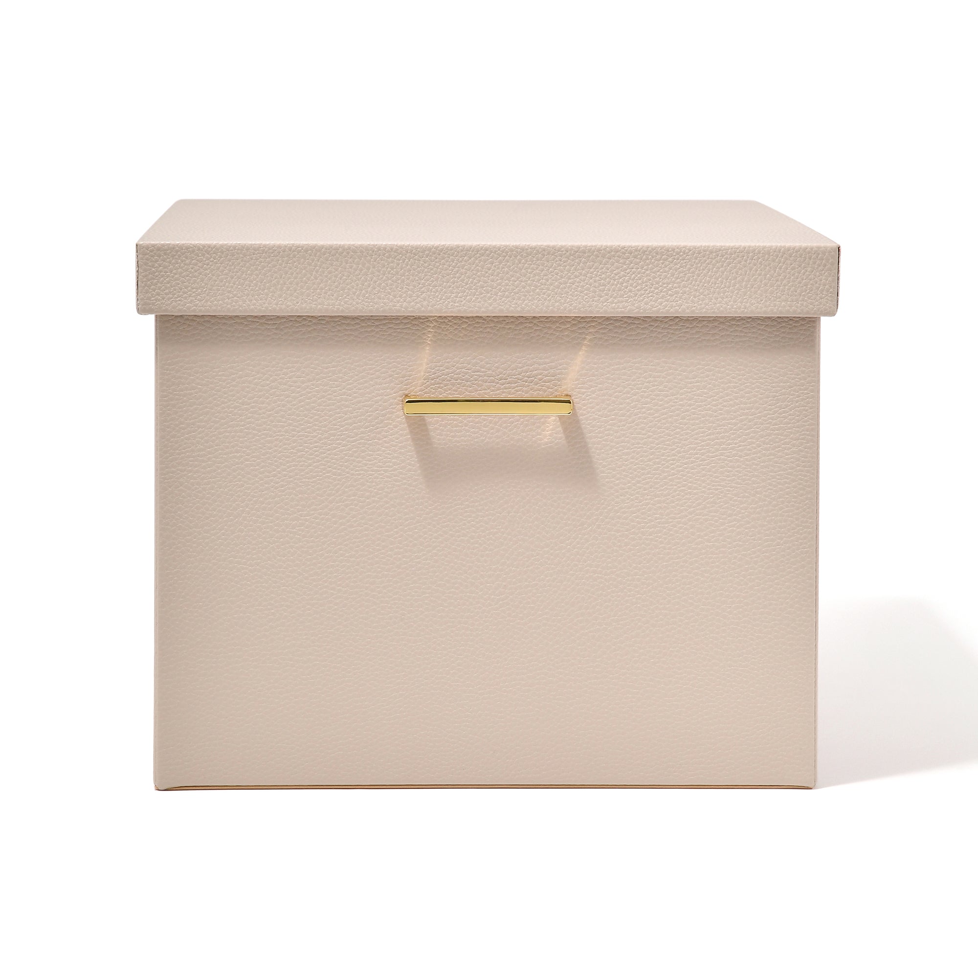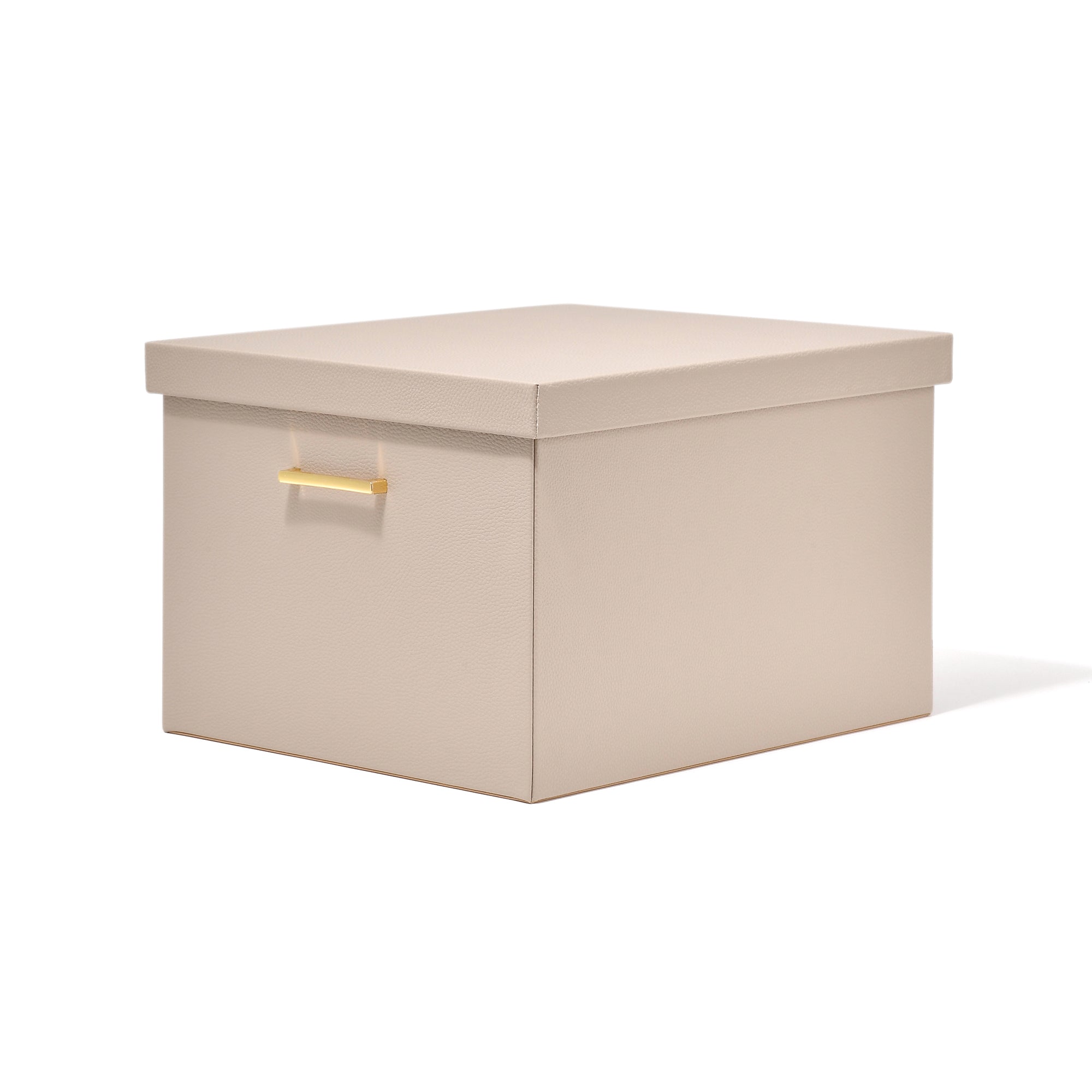 シンプルなデザインにゴールドの取っ手がアクセントとなった大型ボックスです。”見せる収納”としてお部屋をスタイリッシュに整理できるアイテム。蓋付きのためすっきりと収納でき、奥行40cm以上のシェルフやクローゼットにもご使用いただけます。しっかりした作りで高級感があり、長く安心してお使い頂けます。他サイズや色違いとシリーズで揃えて頂くのもおすすめです。