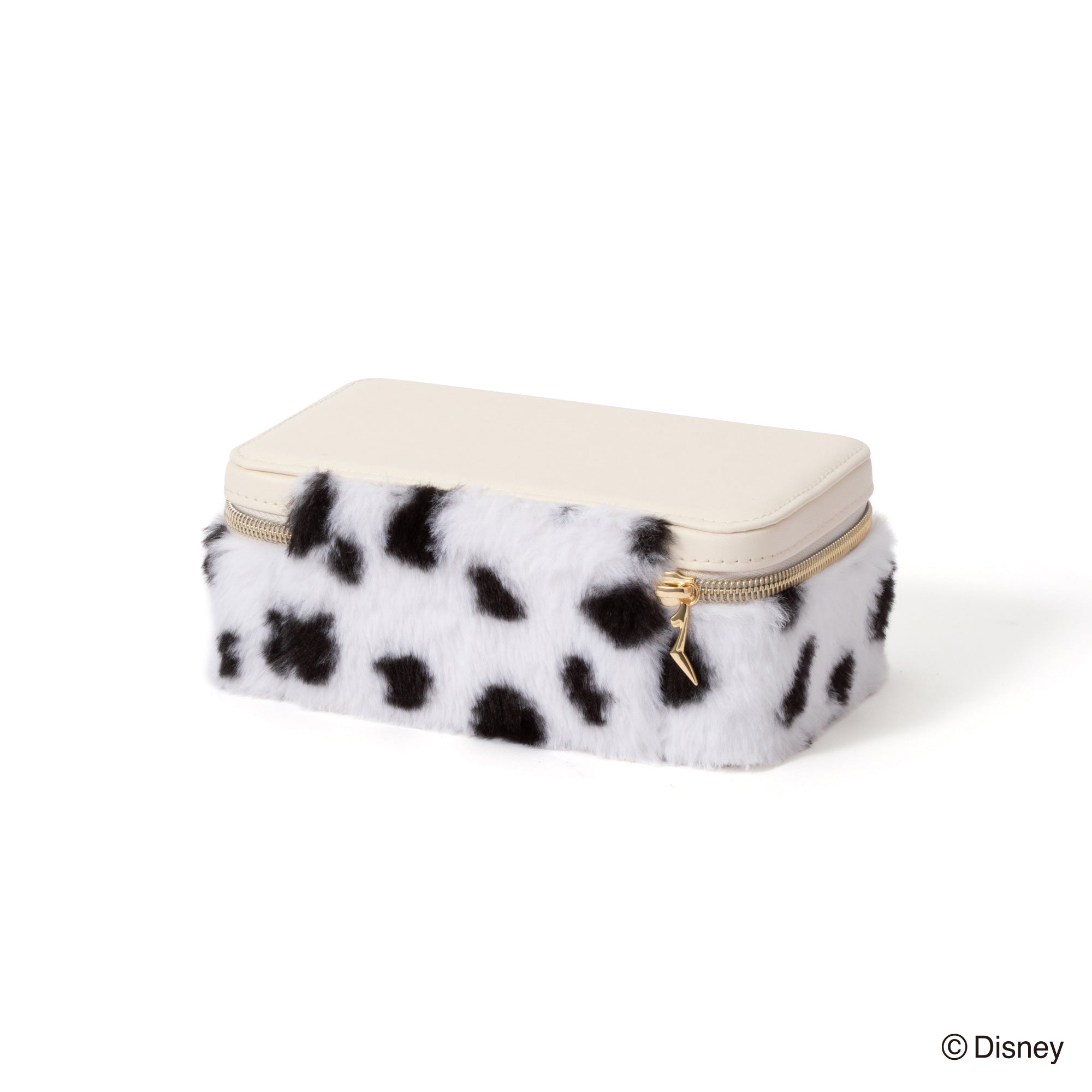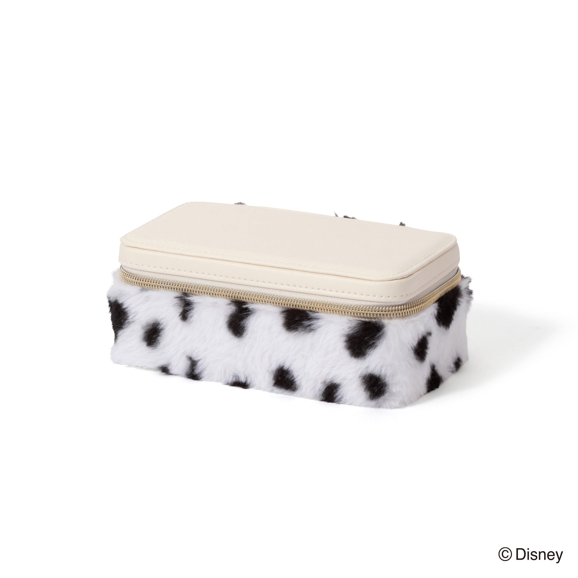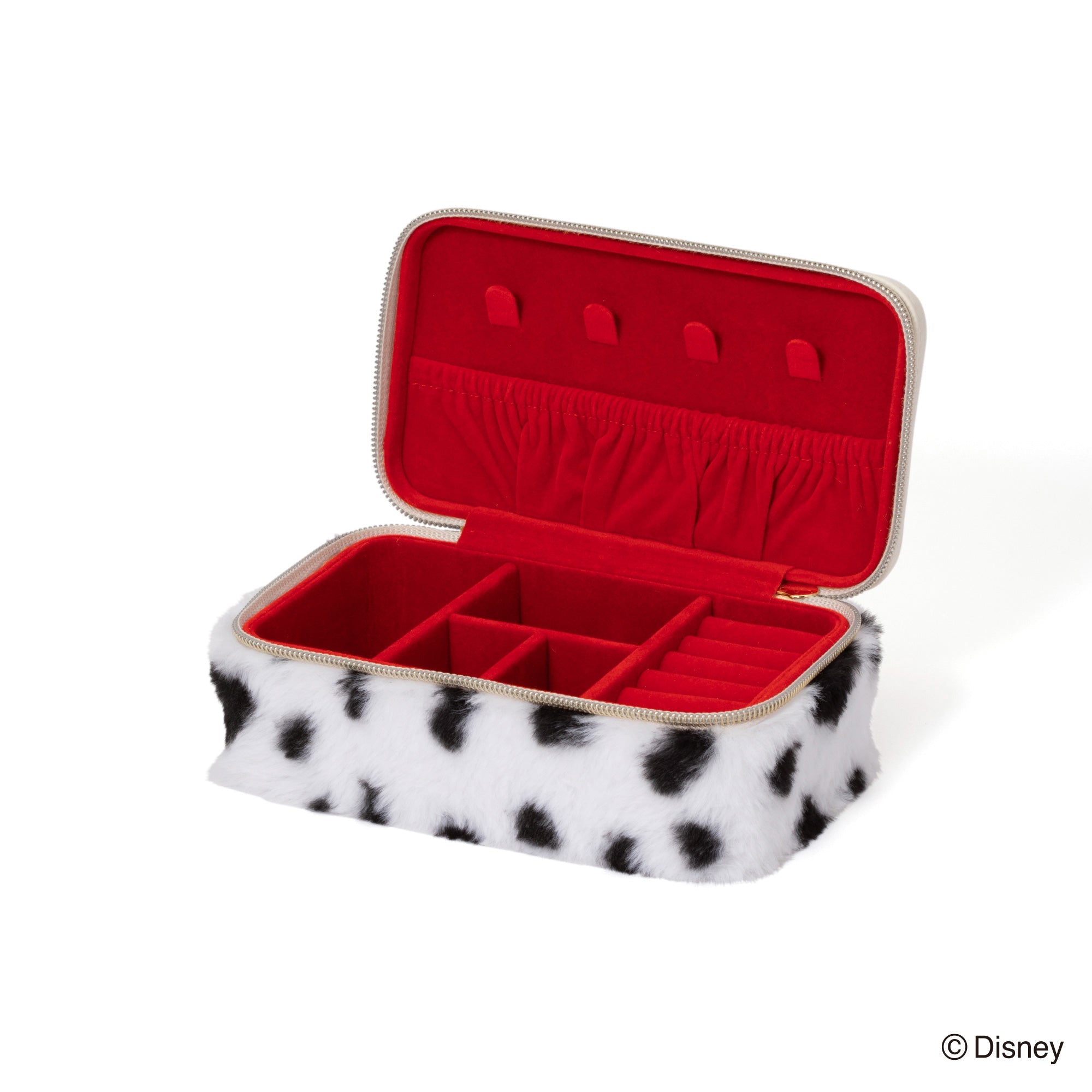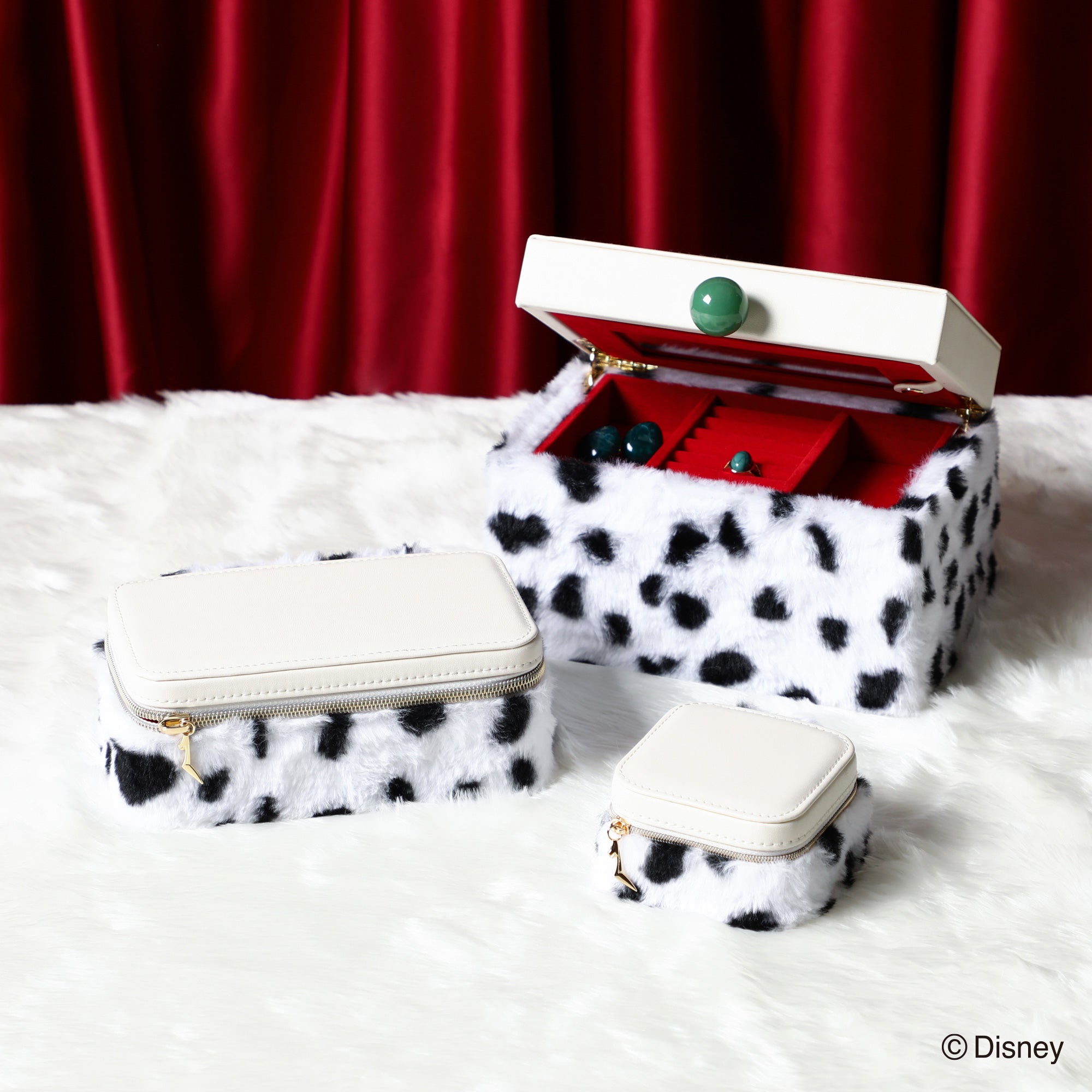 ディズニー映画『101匹わんちゃん』に登場する「クルエラ・ド・ビル」をイメージしたトラベルジュエリーボックスです。持ち運びに便利なサイズです。チャームとバックルのモチーフはクルエラが身に着けているグリーンのリングです。本体はダルメシアンを起想起させる生地に。眺めているだけでも癒される可愛らしいデザインです。内生地にはクルエラのコートの内側と同じ赤色で仕上げました。持ち運ぶジュエリーに合わせて選べる、S・Mの2サイズ展開です。