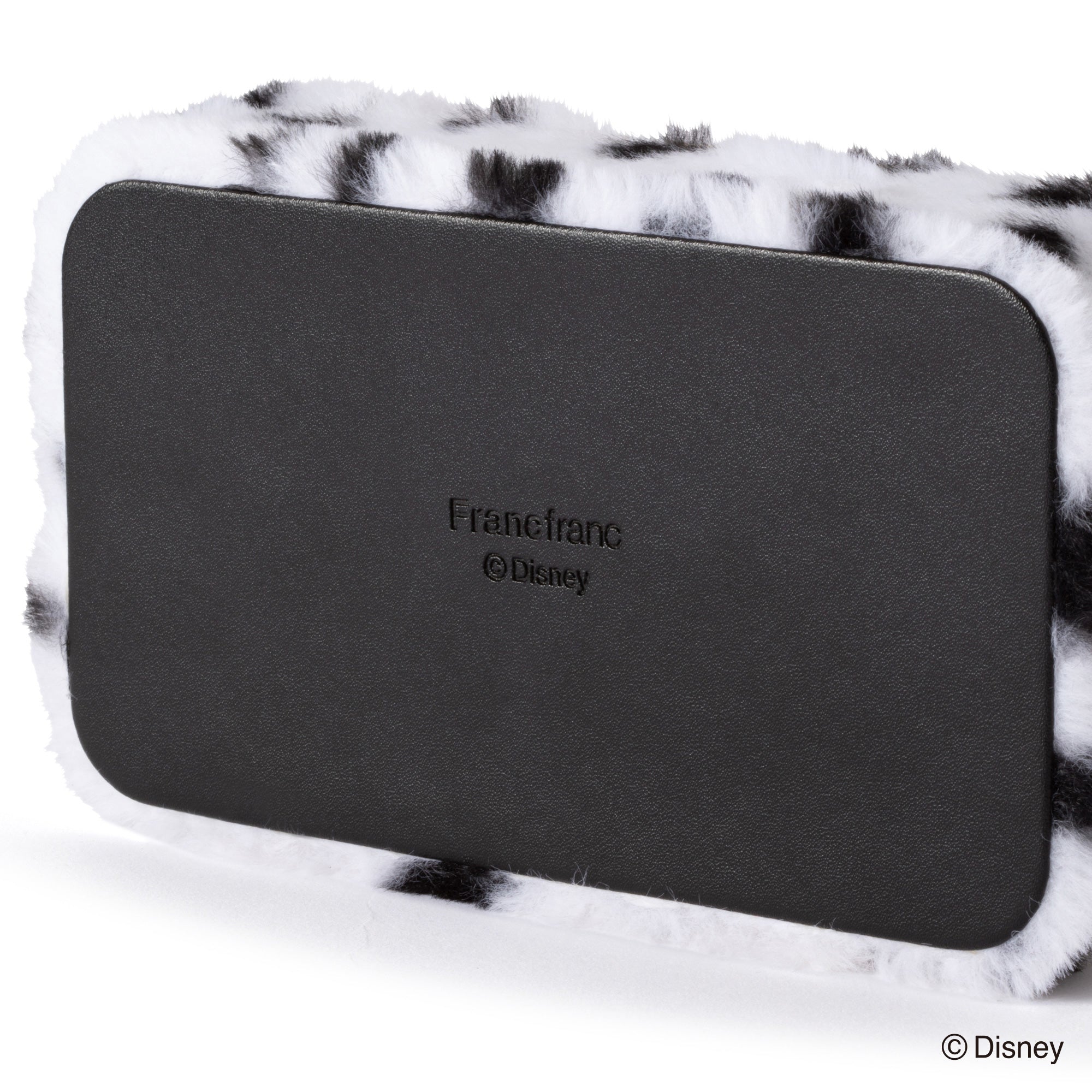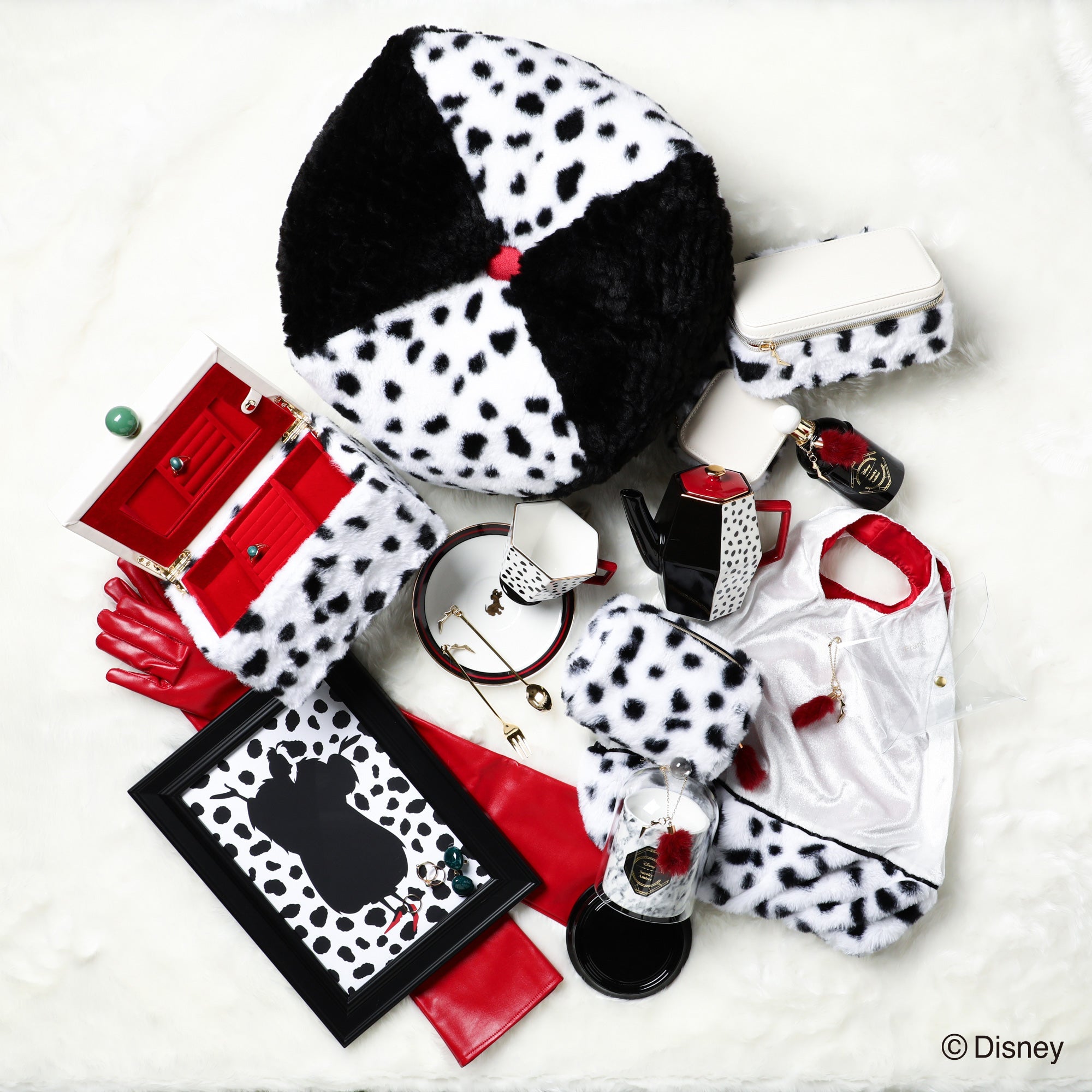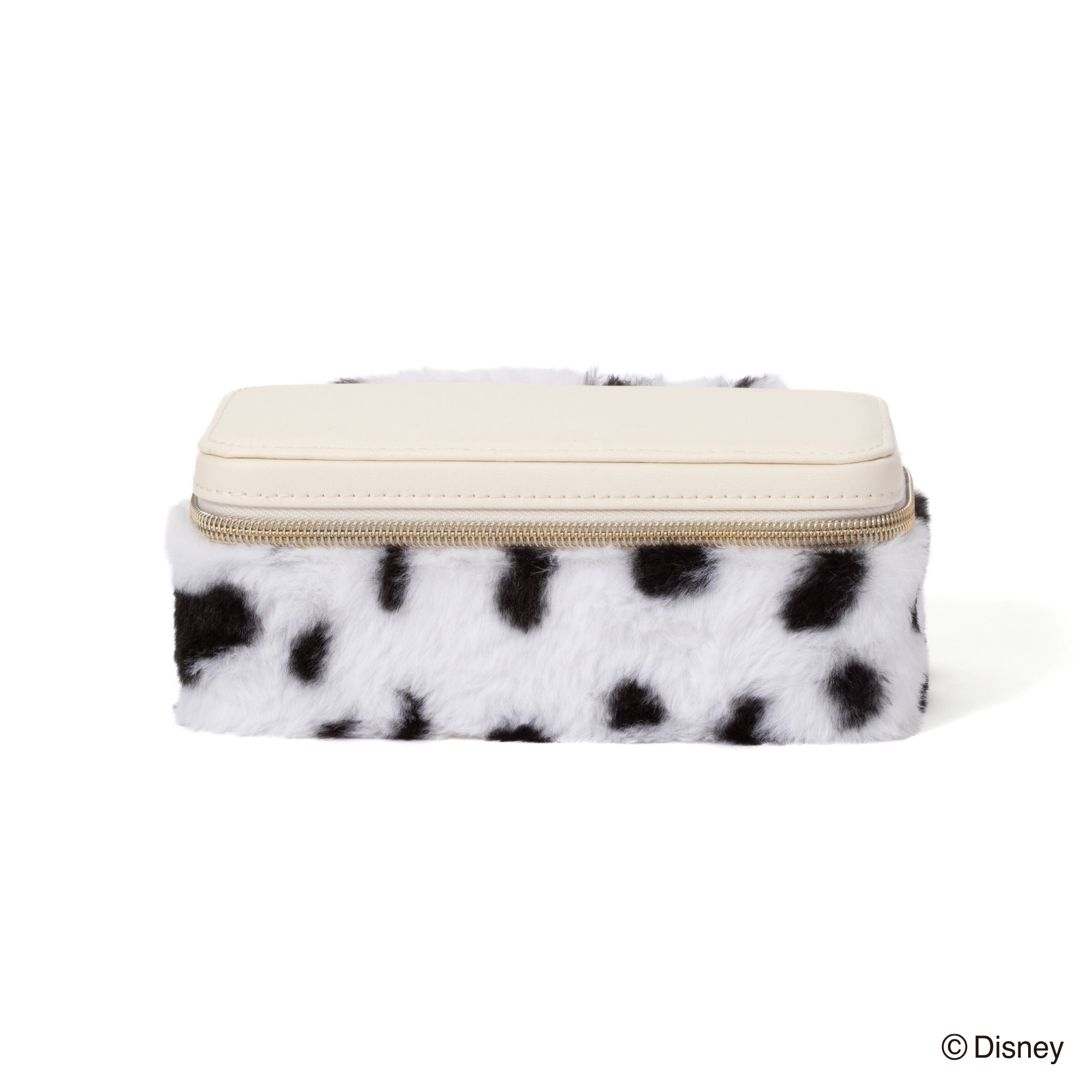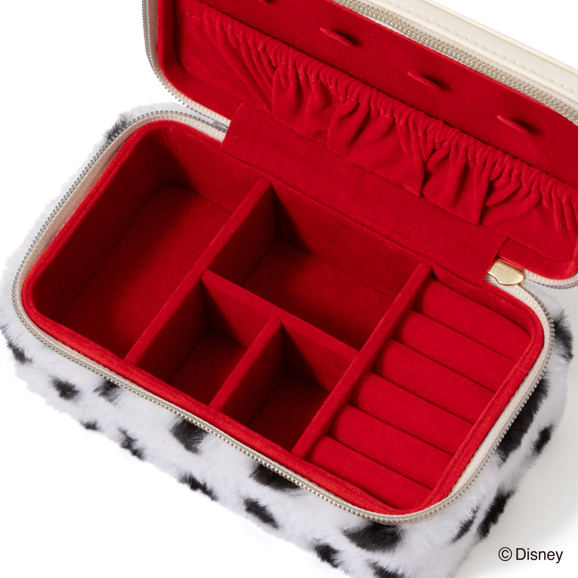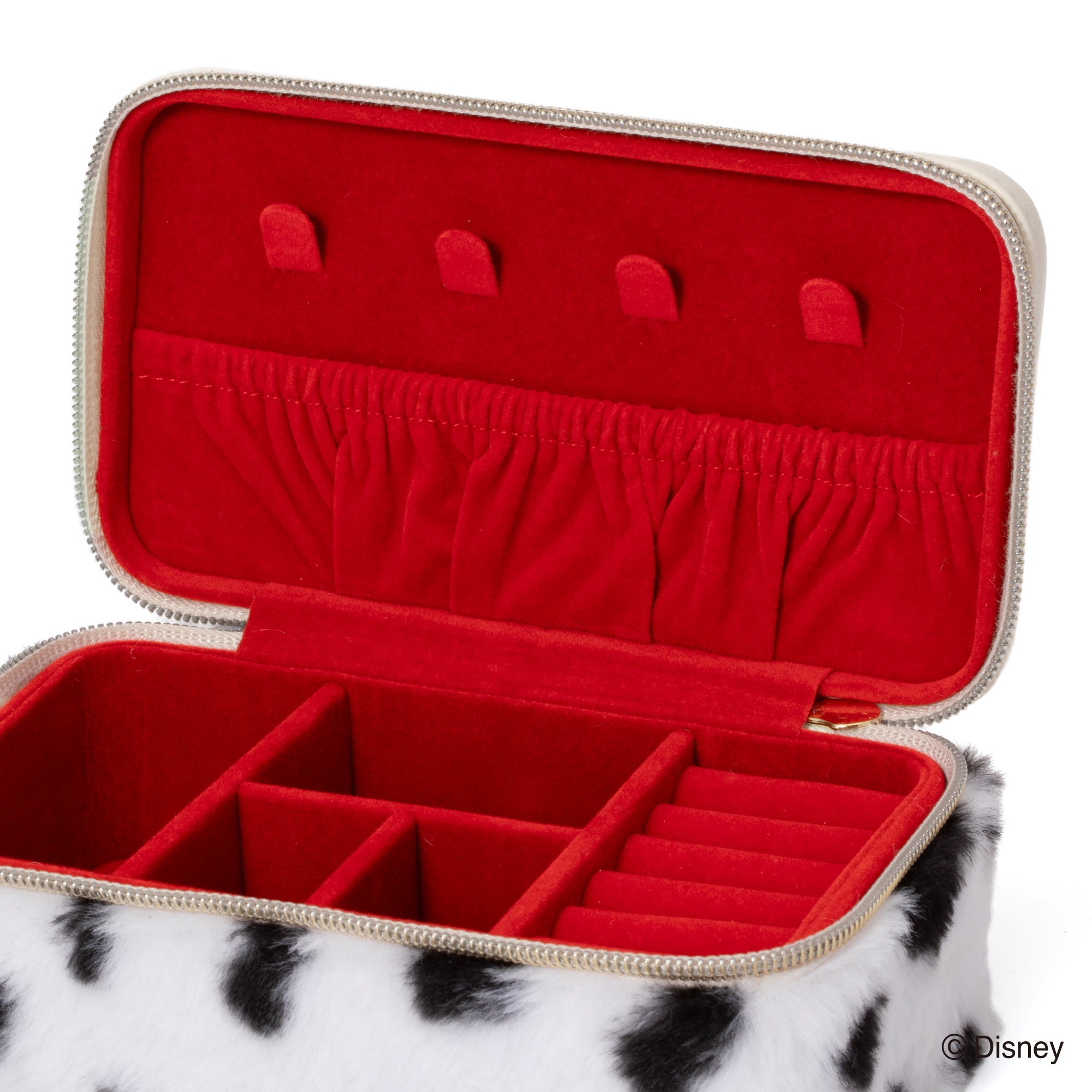 ディズニー映画『101匹わんちゃん』に登場する「クルエラ・ド・ビル」をイメージしたトラベルジュエリーボックスです。持ち運びに便利なサイズです。チャームとバックルのモチーフはクルエラが身に着けているグリーンのリングです。本体はダルメシアンを起想起させる生地に。眺めているだけでも癒される可愛らしいデザインです。内生地にはクルエラのコートの内側と同じ赤色で仕上げました。持ち運ぶジュエリーに合わせて選べる、S・Mの2サイズ展開です。