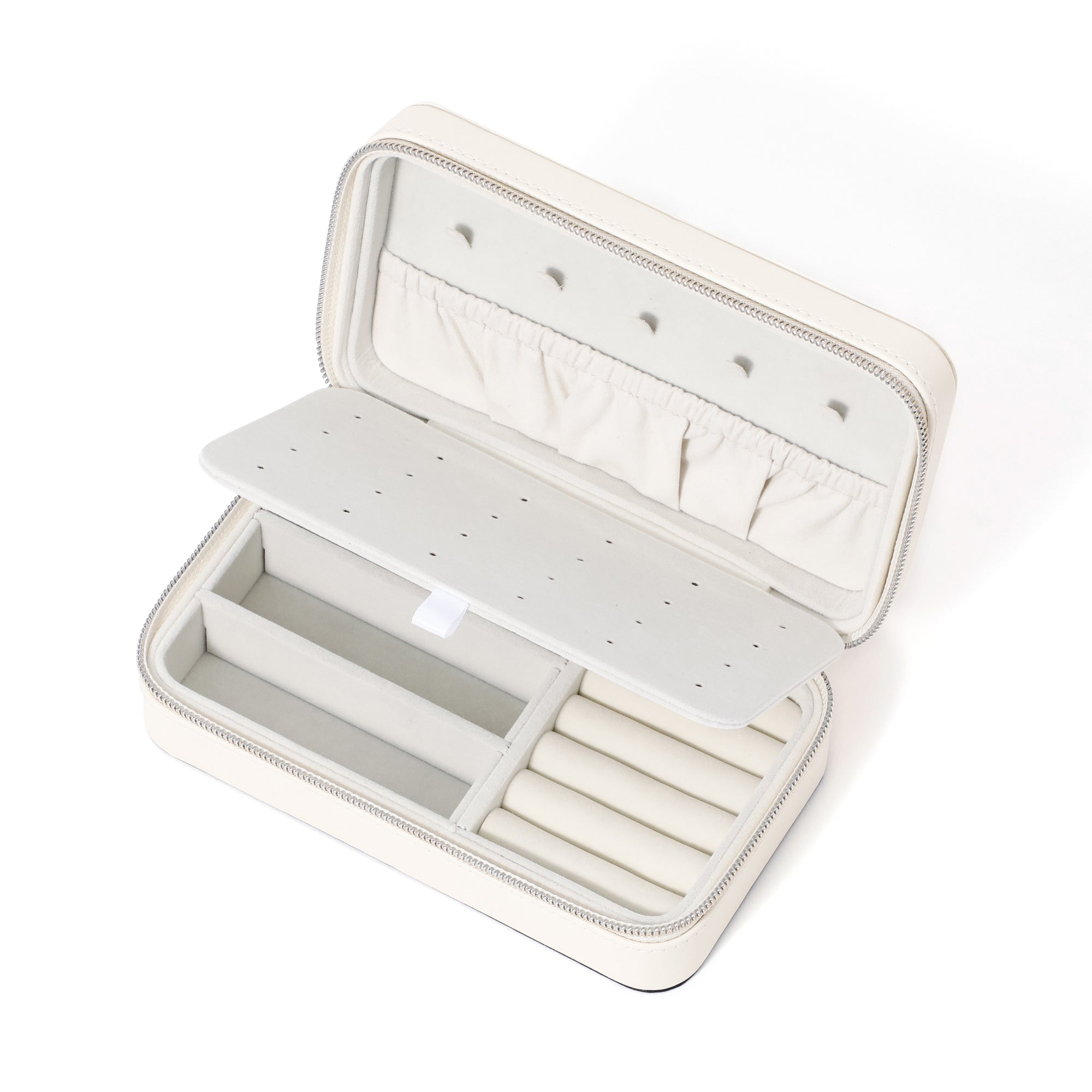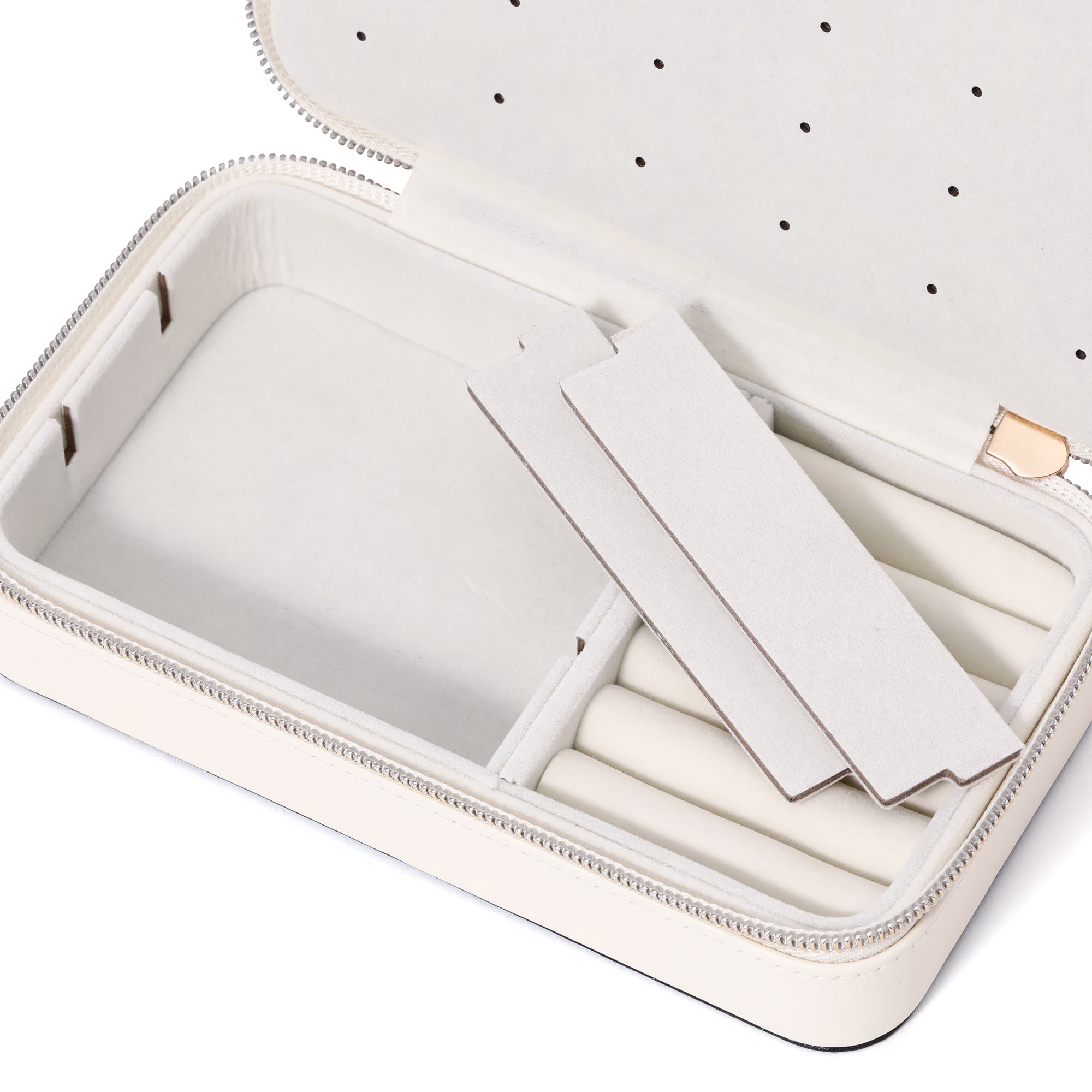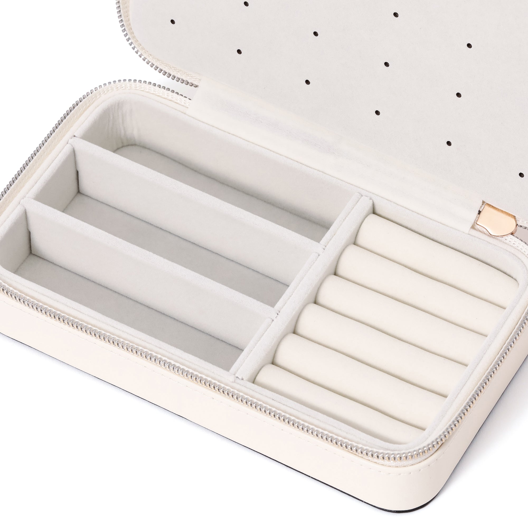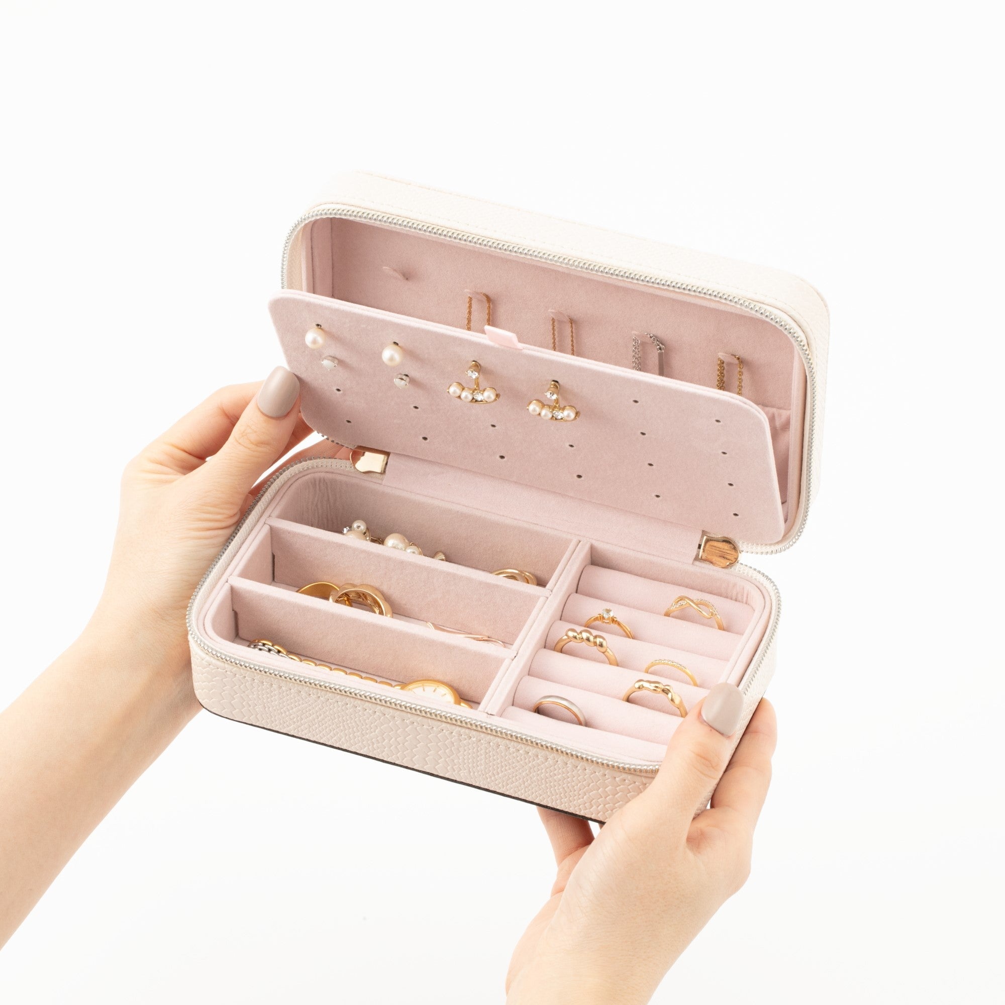 コンパクトですが収納力抜群のジュエリーボックスです。内側にピアスをはさむ板を入れたのでピアスの収納がしやすくなっています。仕切りが取れるので収納するものに合わせて調節できるのも嬉しいポイント。