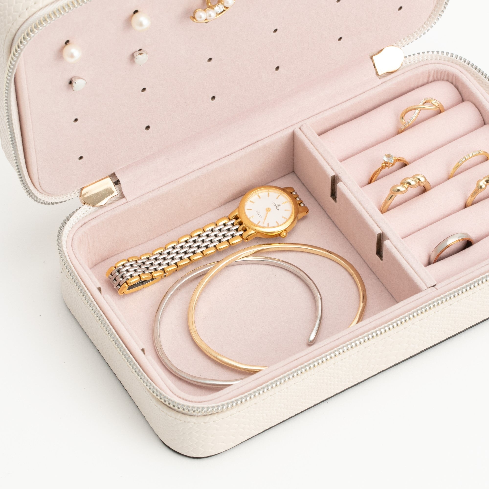 コンパクトですが収納力抜群のジュエリーボックスです。内側にピアスをはさむ板を入れたのでピアスの収納がしやすくなっています。仕切りが取れるので収納するものに合わせて調節できるのも嬉しいポイント。