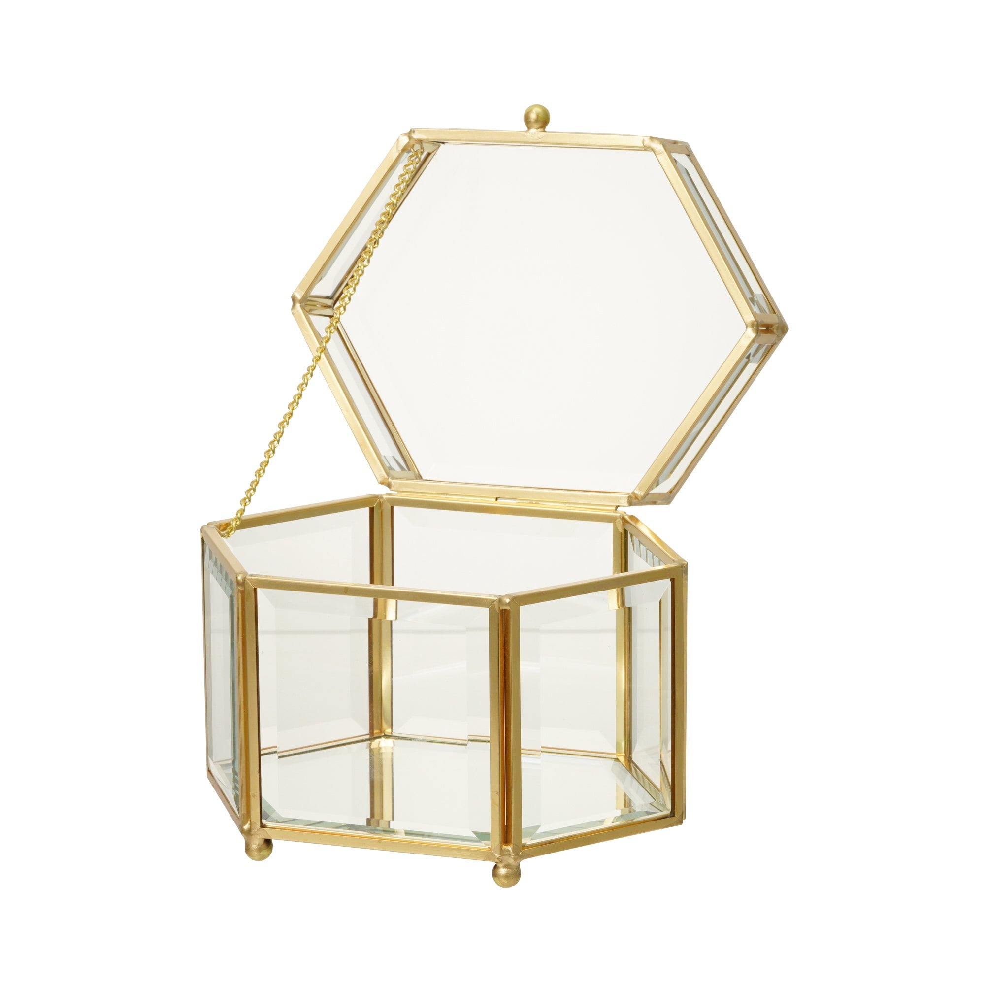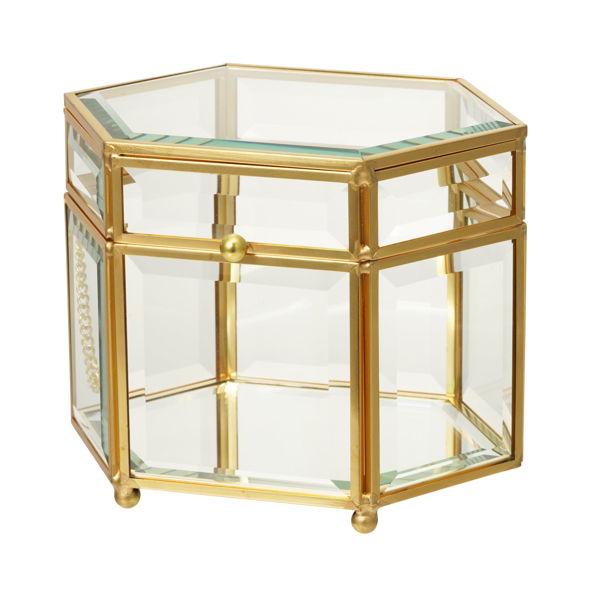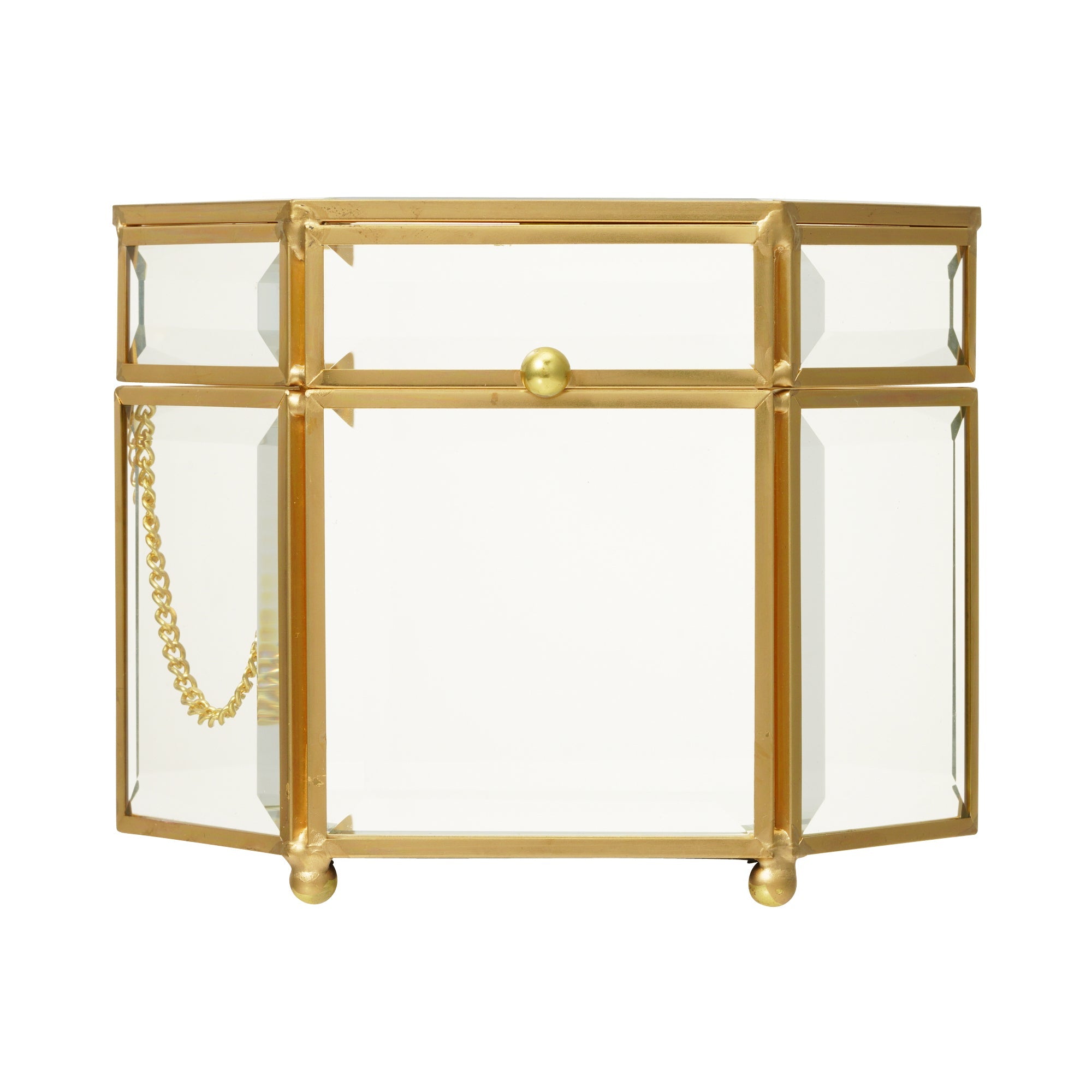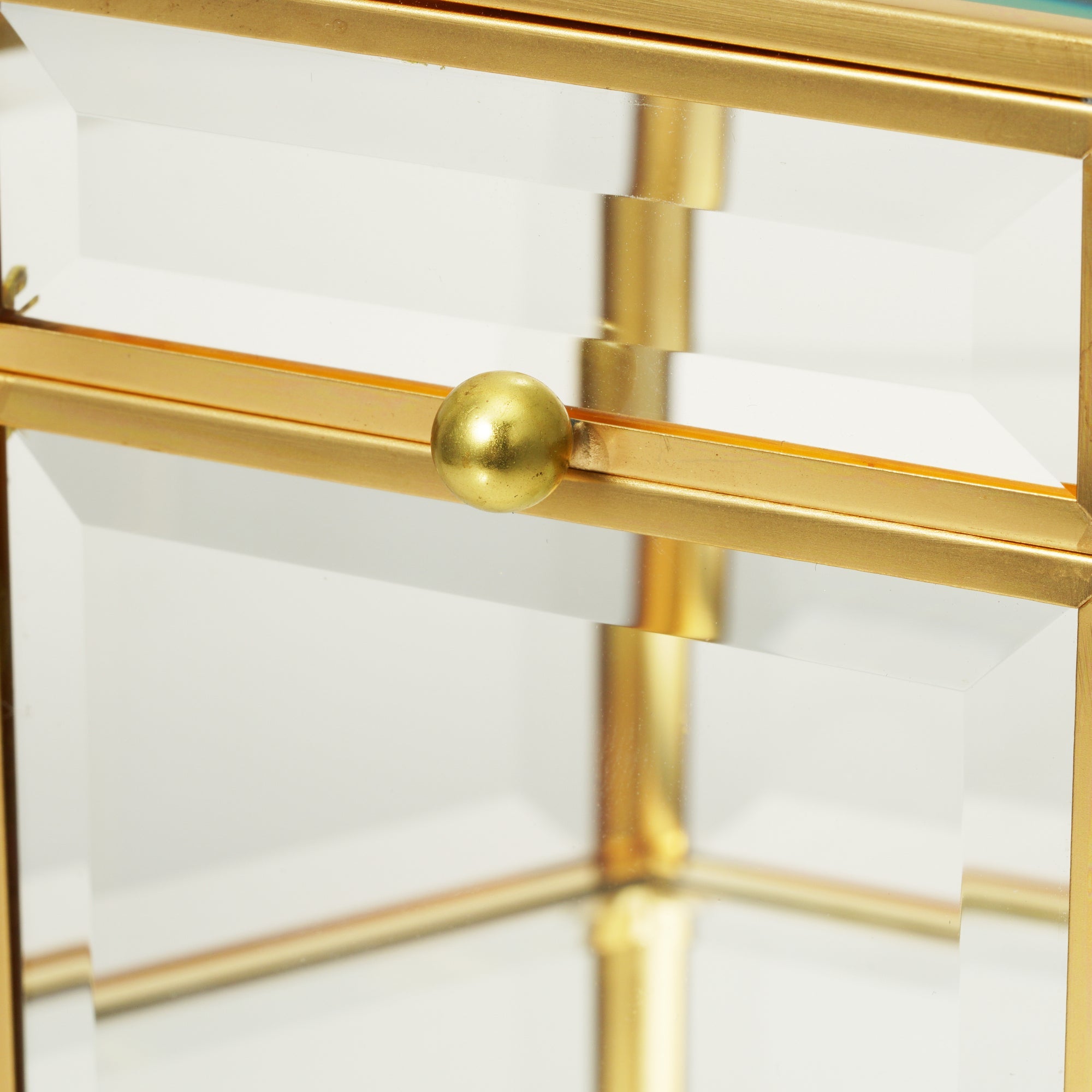 ゴールドのメタルフレームが高級感あふれる、上品なデザインの小物入れです。シンプルでありつつ、ガラスとミラーの輝きが素敵なアイテムです。ジュエリーケースとしてはもちろん、ポプリや香水をいれて飾るのもおすすめです。