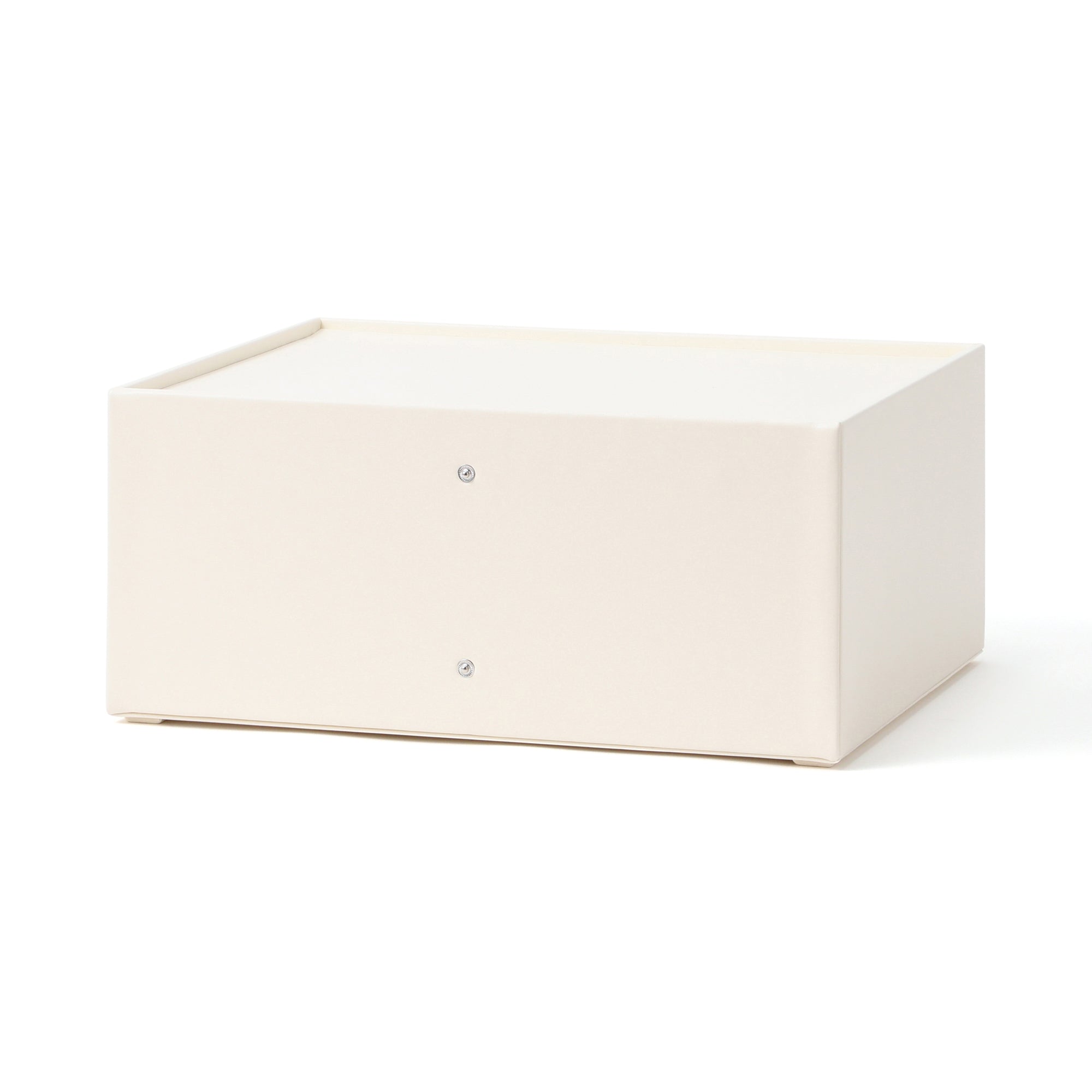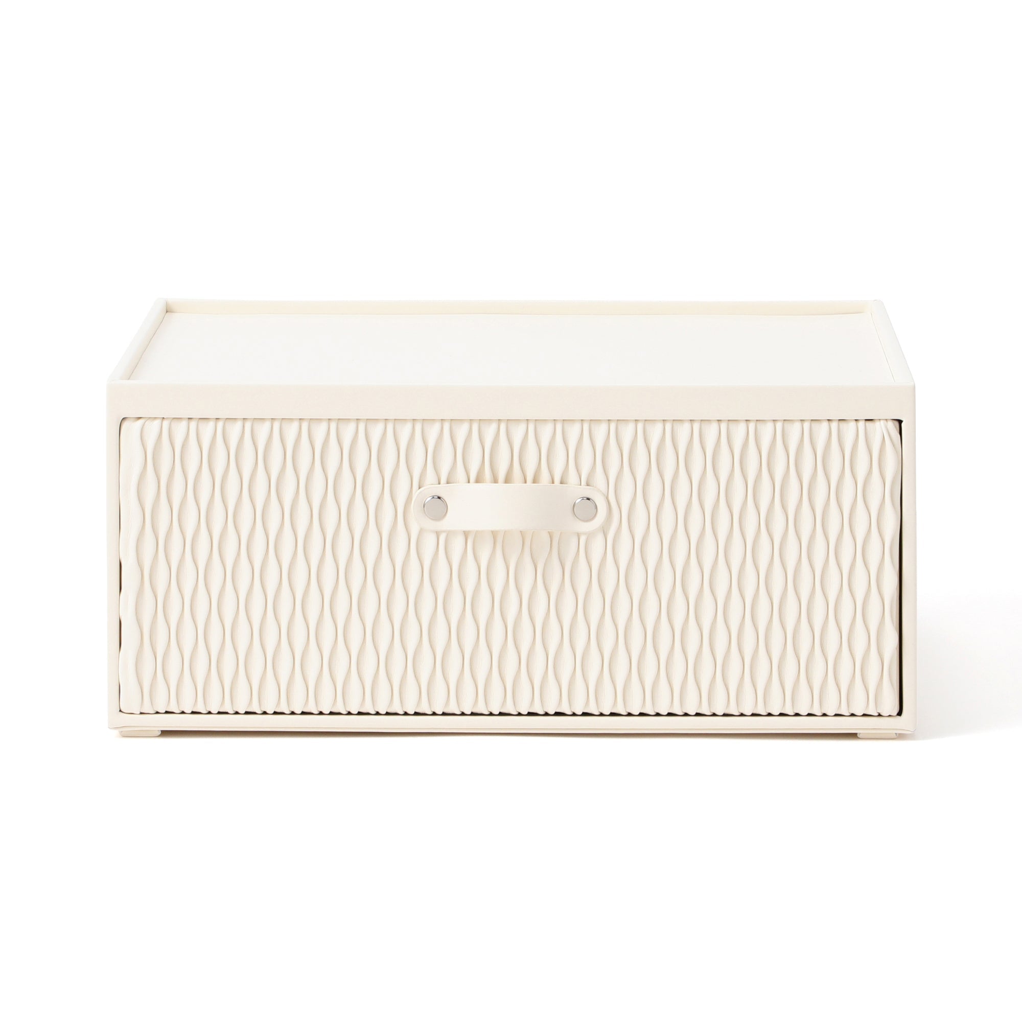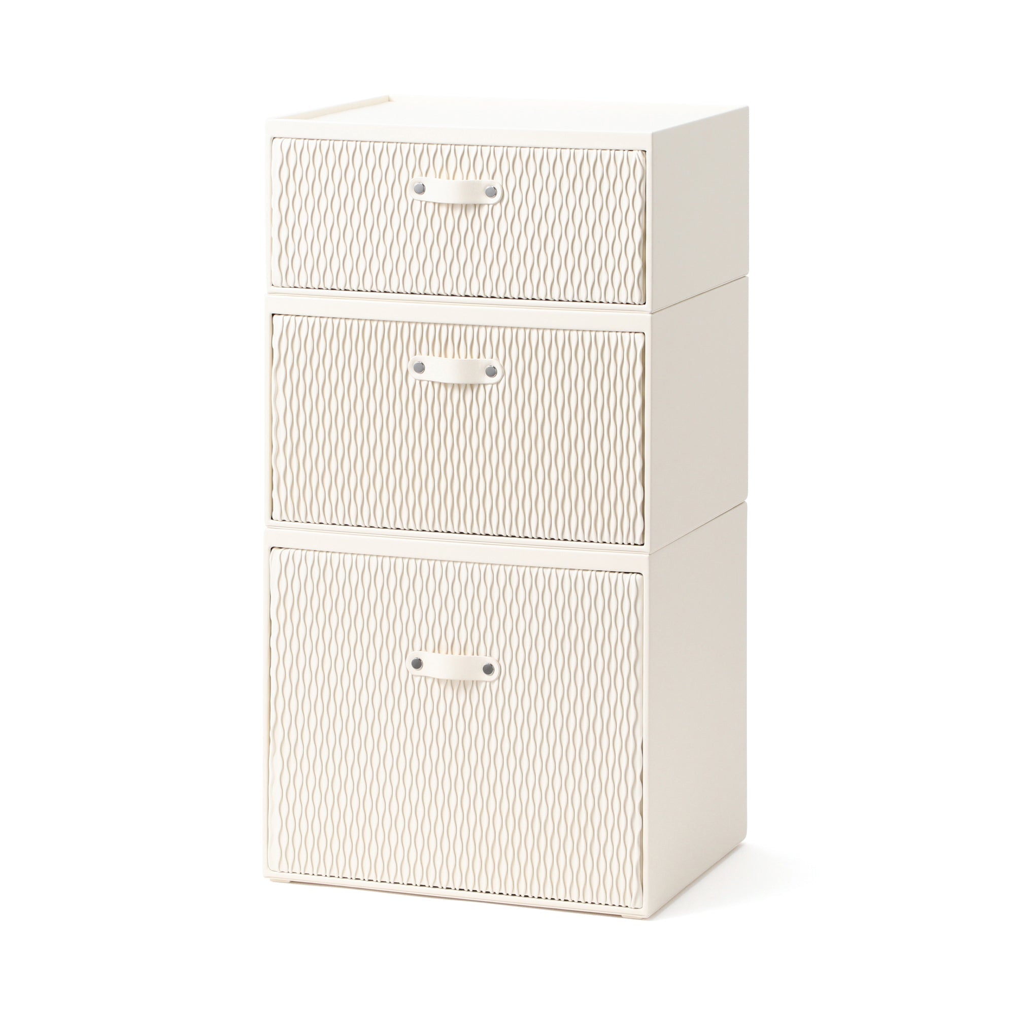 スタッキングできる引き出しタイプの収納ボックスです。表面のテクスチャーが特徴的でインテリアのアクセントになるデザイン。スタッキングドロワー同士を重ねることでまるでシェルフやサイドボードのように使えます。サイズの異なるスタッキングドロワーも自由に組み合わせられるので、使用シーンに合わせてお好みの高さの収納スペースを作ることが可能です(高さ65cmまで積み重ねてご使用いただけます)。大型家具を買わなくても気軽におしゃれに整理整頓ができるうえ、必要に応じて買い足していただくことでお引越しや模様替えにスムーズに対応できるのもうれしいポイントです。