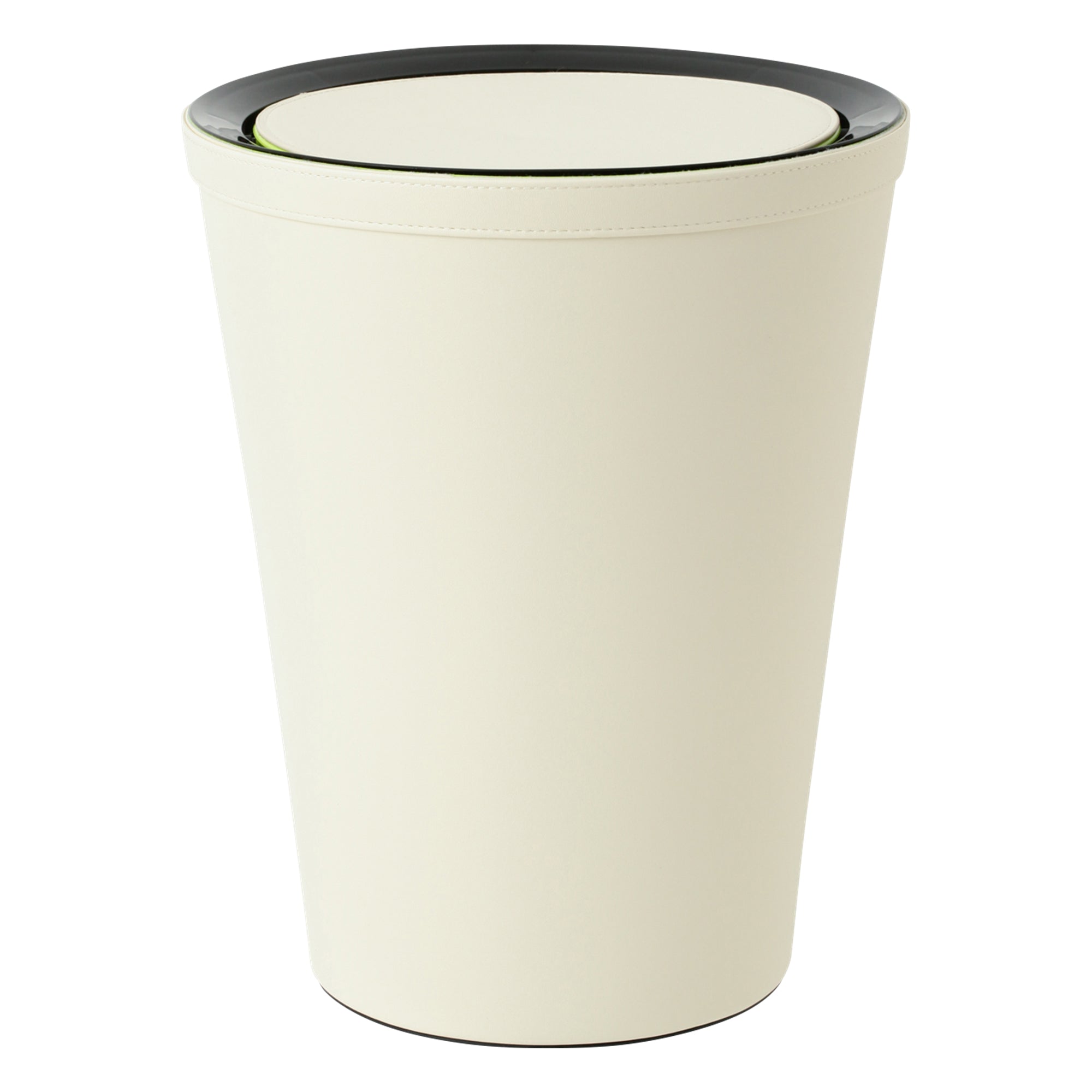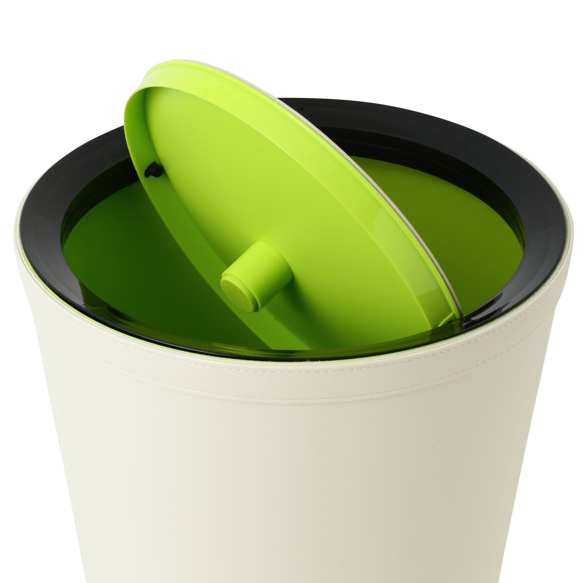 プラスチックと合皮の異素材MIXで生活感の出ないデザインのダストボックス。汚れ易い内側部分は水拭き可能なPP素材になっています。蓋は丸ごと取り外すことが出来、ぽんと押すとゆらゆらする構造になっているので、中身が見えたくない方にお勧めのアイテムです。ベーシックなホワイトにビビッドなグリーンがアクセントになっています。