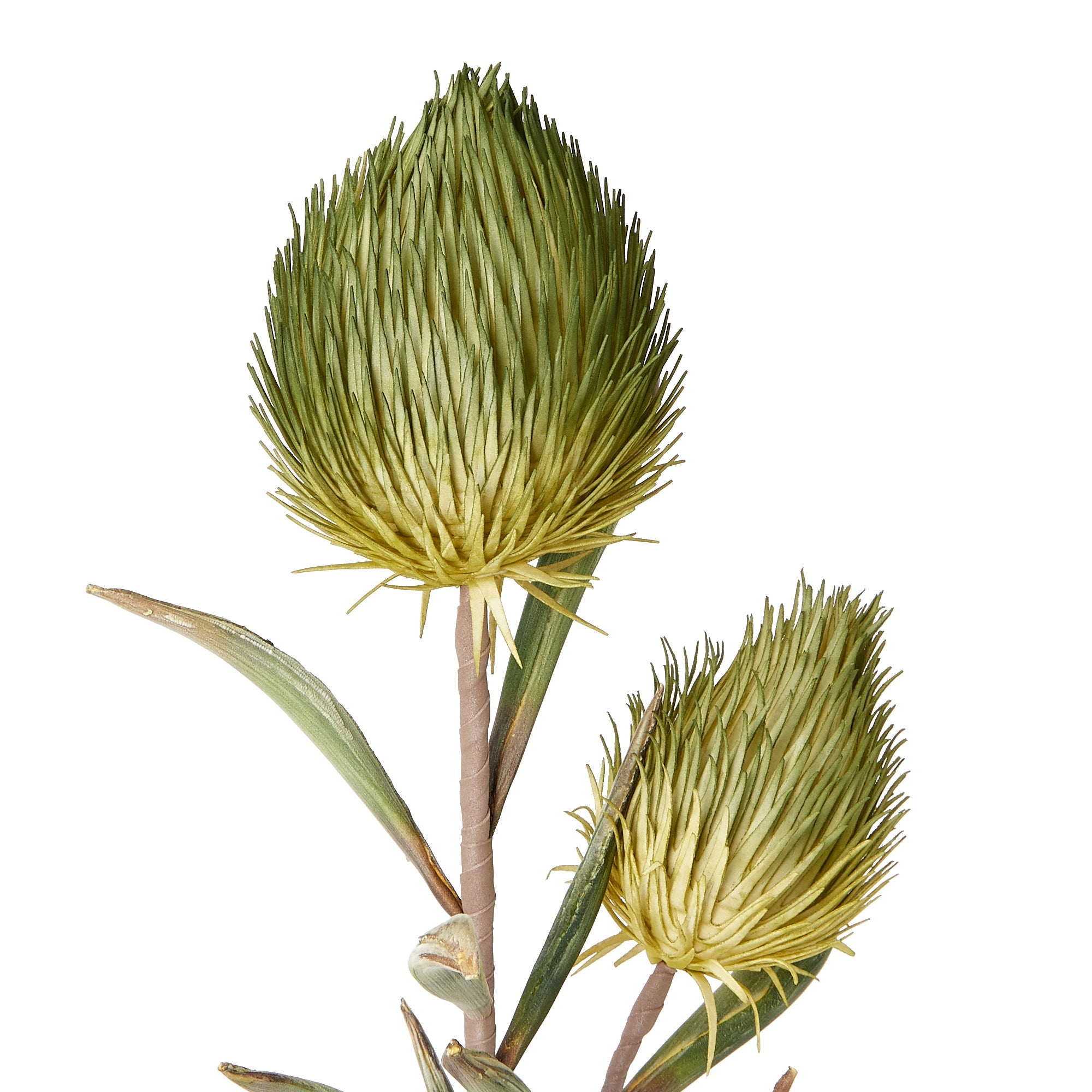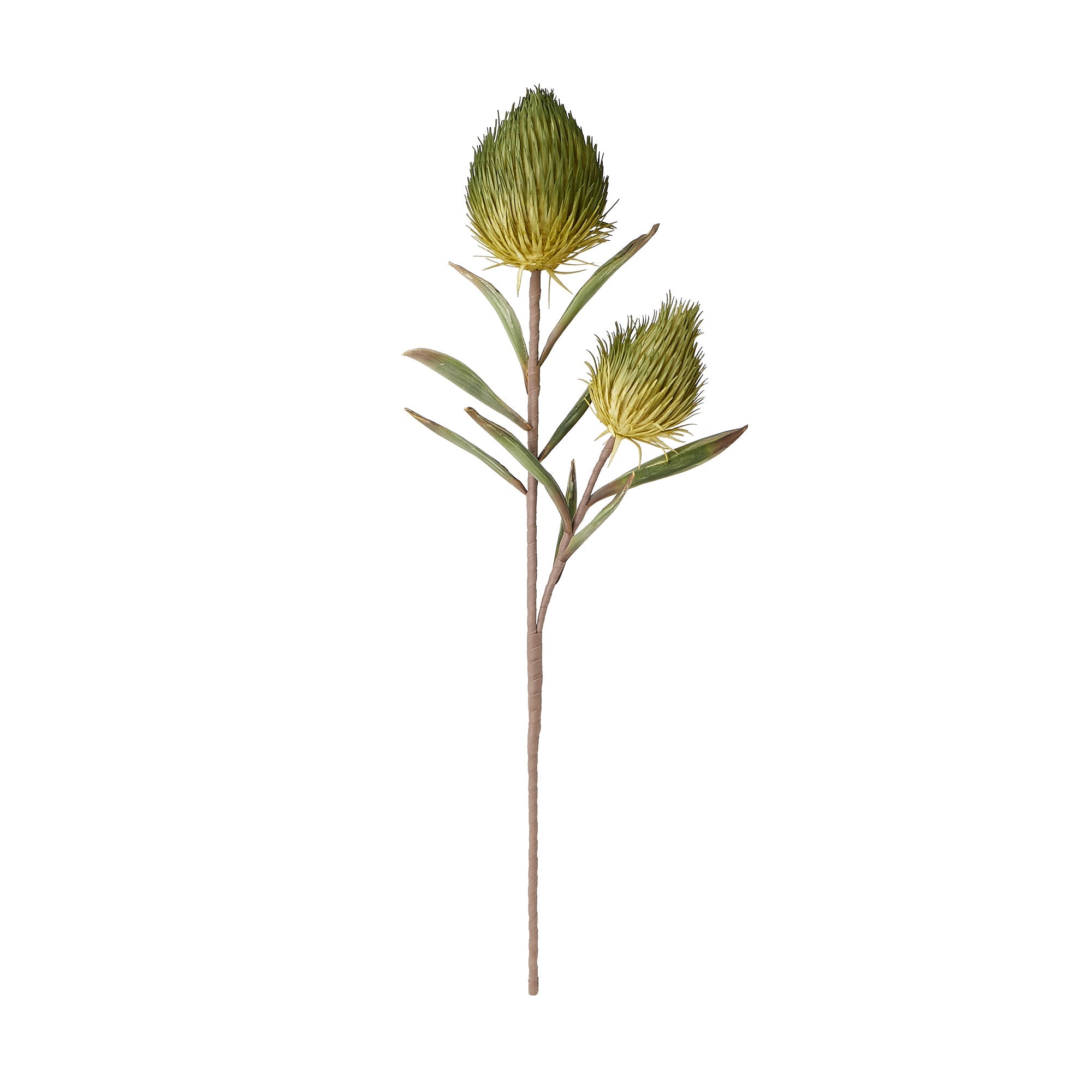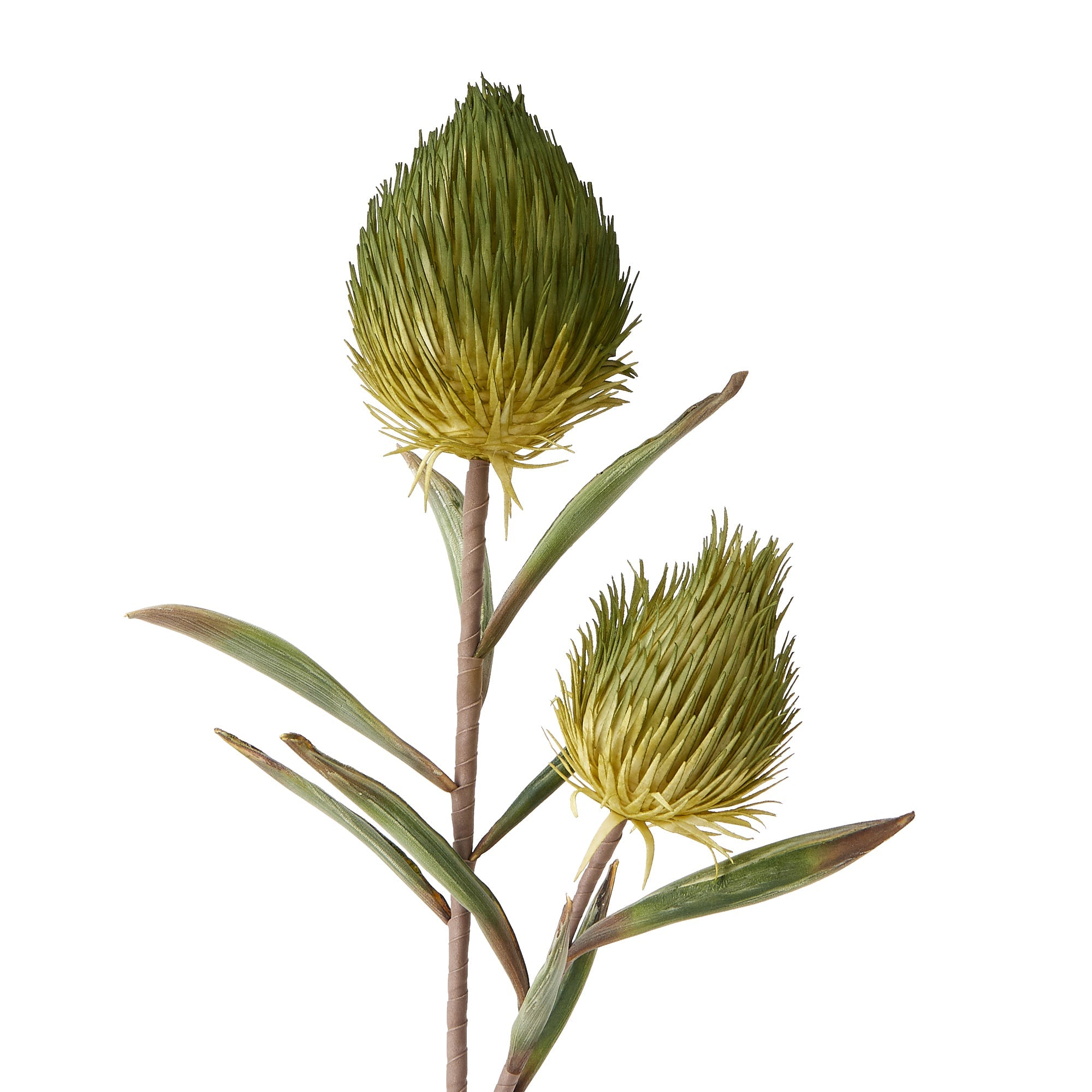 個性的なブラシのような花穂が特徴のバンクシアのアートプランツです。 珍しい植物もアートプランツなら気軽に取り入れられて、お部屋の雰囲気を一変できます。違うデザインでも同系色のものと合わせるとコーディネートがまとまりやすく、おすすめです。 個性的な姿が人気のバンクシアは、フェイクのアートプランツならお手入れなしで長く楽しめます。大きな緑のブラシのようなユニークな姿は、迫力がありインパクト抜群です。 サイズは、74センチと長めなので、大きめのフラワーベースや、バスケットに挿して飾ると迫力のあるコーナーに。飾るスペースは、テーブルやシェルフだけでなく、ベースを床に置いて飾ると、バンクシアの長さを活かした飾り方になります。大きめのフラワーベースがない場合は、好みの長さにカットすれば、通常サイズのベースに飾ることができます。 バンクシアは主役にもなる存在感ですが、華やかなアートプランツのフラワーとあわせて飾ると、トゲトゲとした質感が、アクセントのきいたアレンジに。ディスプレイの背景に飾ると、主張の強さがやわらぐので、インテリアの雰囲気になじみやすくなります。 短めにカットして、ボタニカルなオブジェのように飾ると、インパクトのあるディスプレイが楽しめます。 独特な形のバンクシアは、夏のディスプレイにも利用できます。観葉植物や、トロピカルな色のアートフラワーとアレンジすれば、南国テイストのインテリアに。コーディネートしだいで、さまざまなアレンジのバリエーションが広がります。 ▼あわせて使える花瓶はこちら 花瓶・フラワーベース一覧