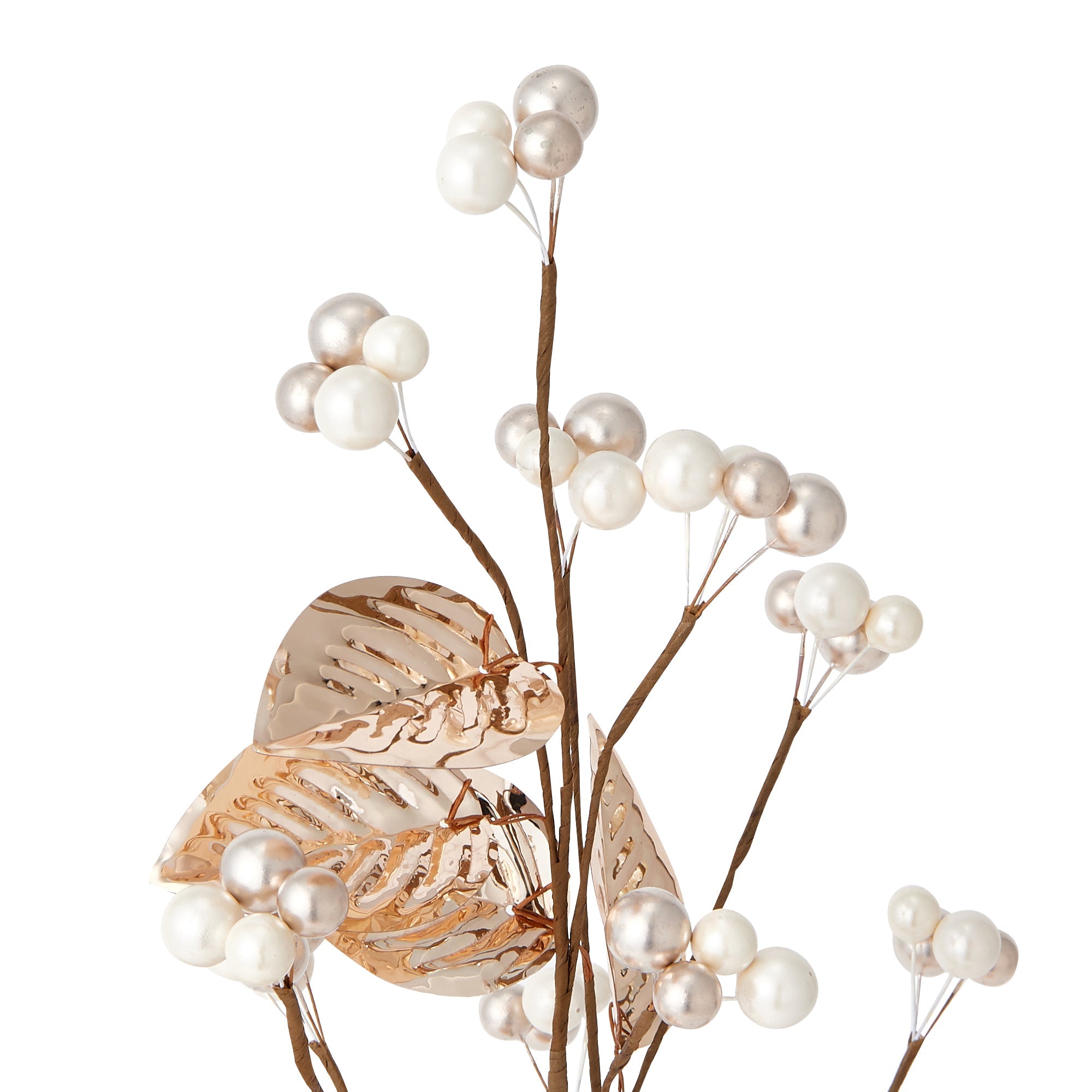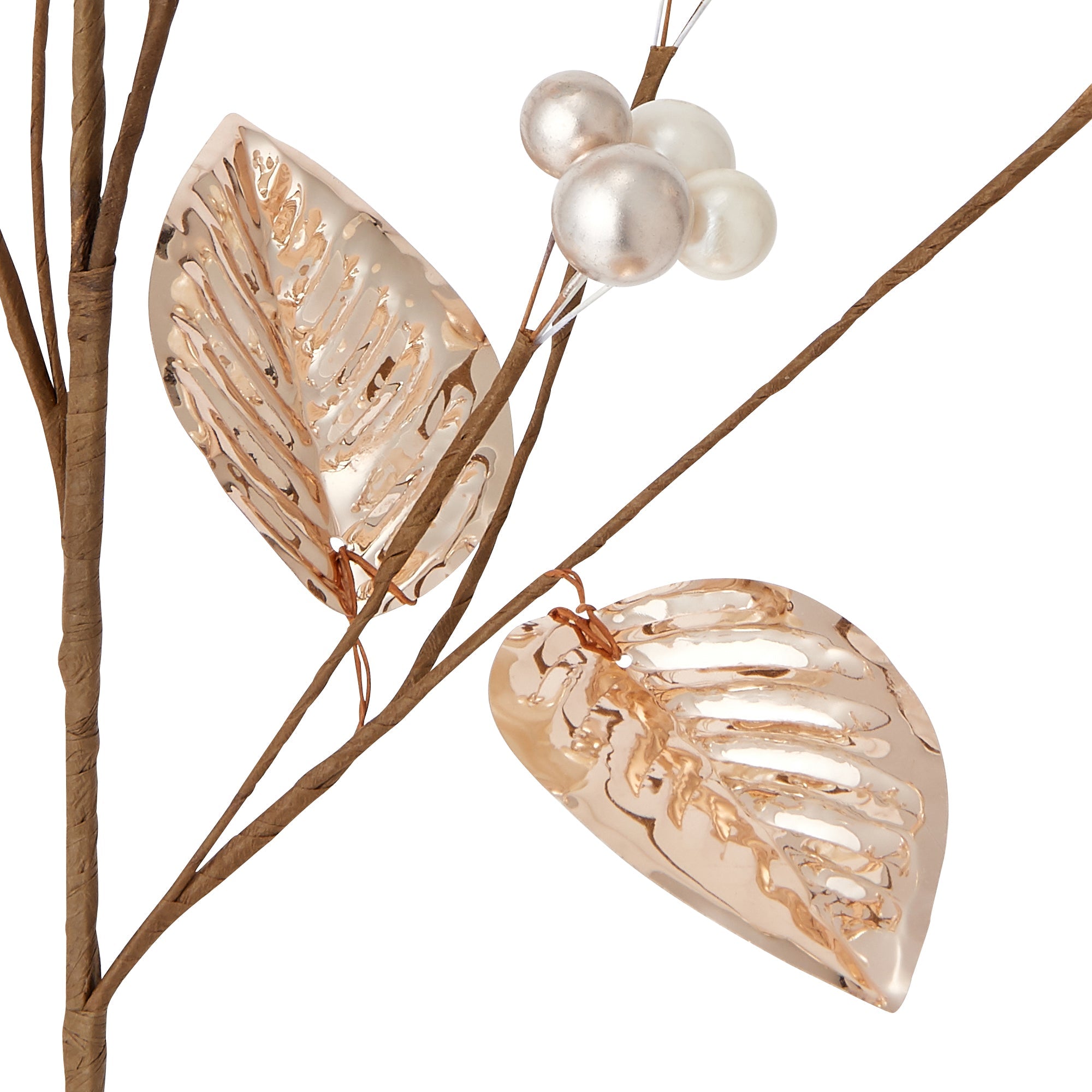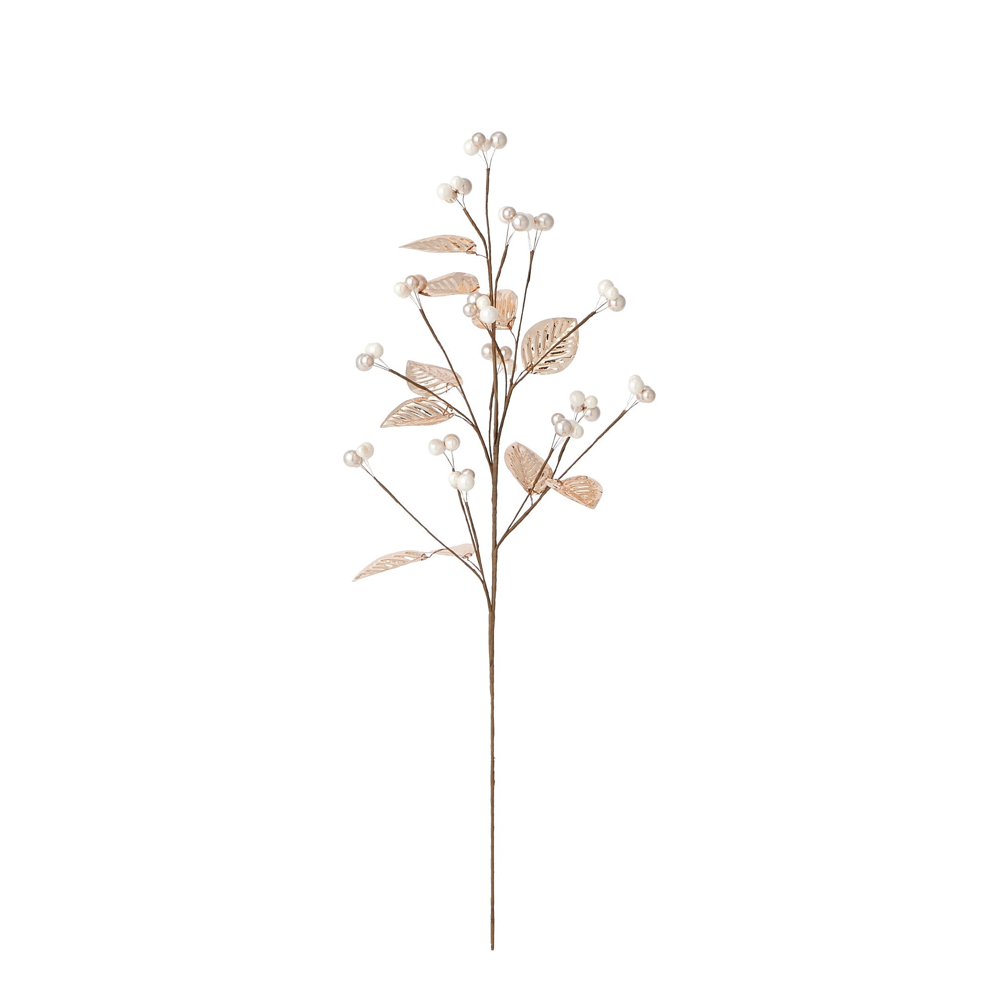 大人っぽいゴールドカラーが、秋冬の落ち着いたインテリアに映えるデザインのアートプランツです。 コーディネートに1本加えるだけで特別な空間を演出してくれます。リアルな植物にはないキラキラ感が、インテリアに非日常的なアクセントを与えてくれます。 細部にわたり精巧に作られたアートプランツは、ハイセンスなオブジェのような存在感です。シャイニーリーフのアートプランツは、光沢が美しいゴールドの葉がポイント。葉脈がほどこされた葉に、色が微妙に異なるパールをつけて、上品な大人の雰囲気に仕上げています。 アートプランツは生のお花のように水に挿したり、水を替えたりする必要もないので、どこにでも好きなスペースに飾ることができます。 アートプランツをお部屋に飾ると、華やかさグレードアップの豪華なインテリアに。ほかのアートプランツとブーケにしたり、短くカットしてディスプレイのオブジェにしたりと、お好みのアレンジが楽しめます。 また、ゴールドカラーが美しい葉は、クリスマスや冬のディスプレイにぴったり。クリスマスモチーフや、キャンドルなどと一緒に飾ると、ホリデー気分も盛り上がります。クリスマスツリーやリースにプラスすると、素敵なアレンジに。ゴージャスな見た目は、パーティーやイベントなどの装飾にもおすすめです。 シャイニーリーフのアートプランツは、ゴールドのほかにオーロラ色や、シルバーも用意しています。好みの色でインテリアの装飾やディスプレイにお楽しみください。 ▼あわせて使える花瓶はこちら 花瓶・フラワーベース一覧