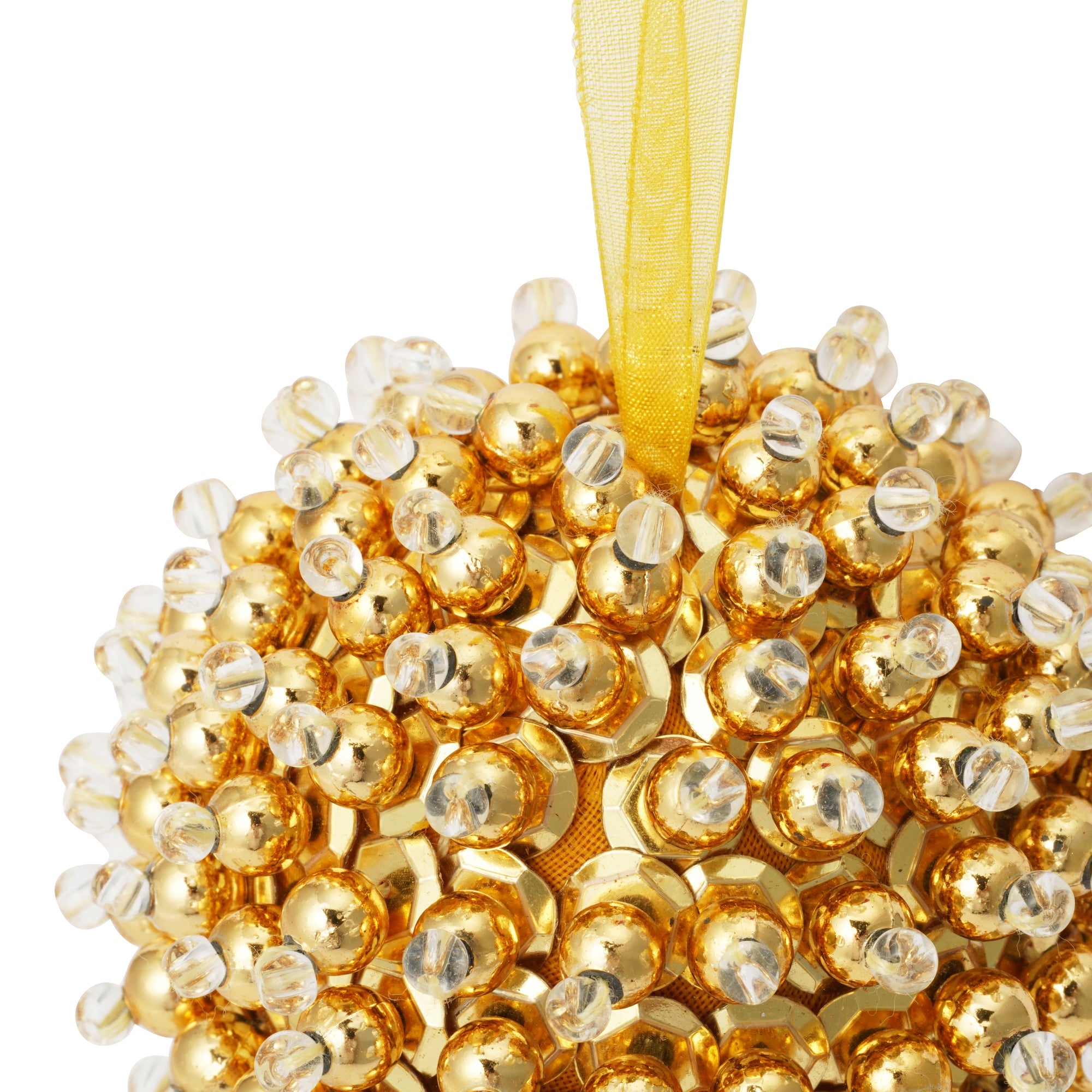 ゴールドのスパンコールをふんだんに使った、目を引くオーナメントです。
