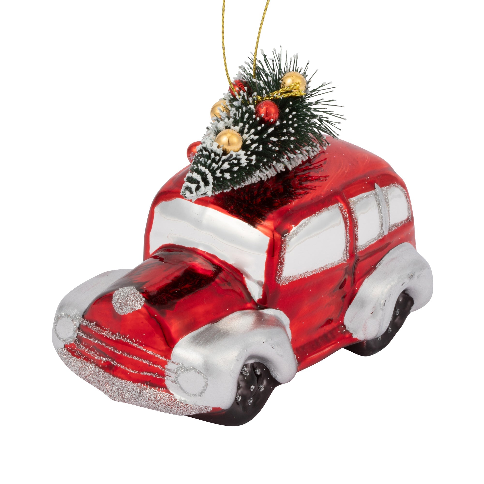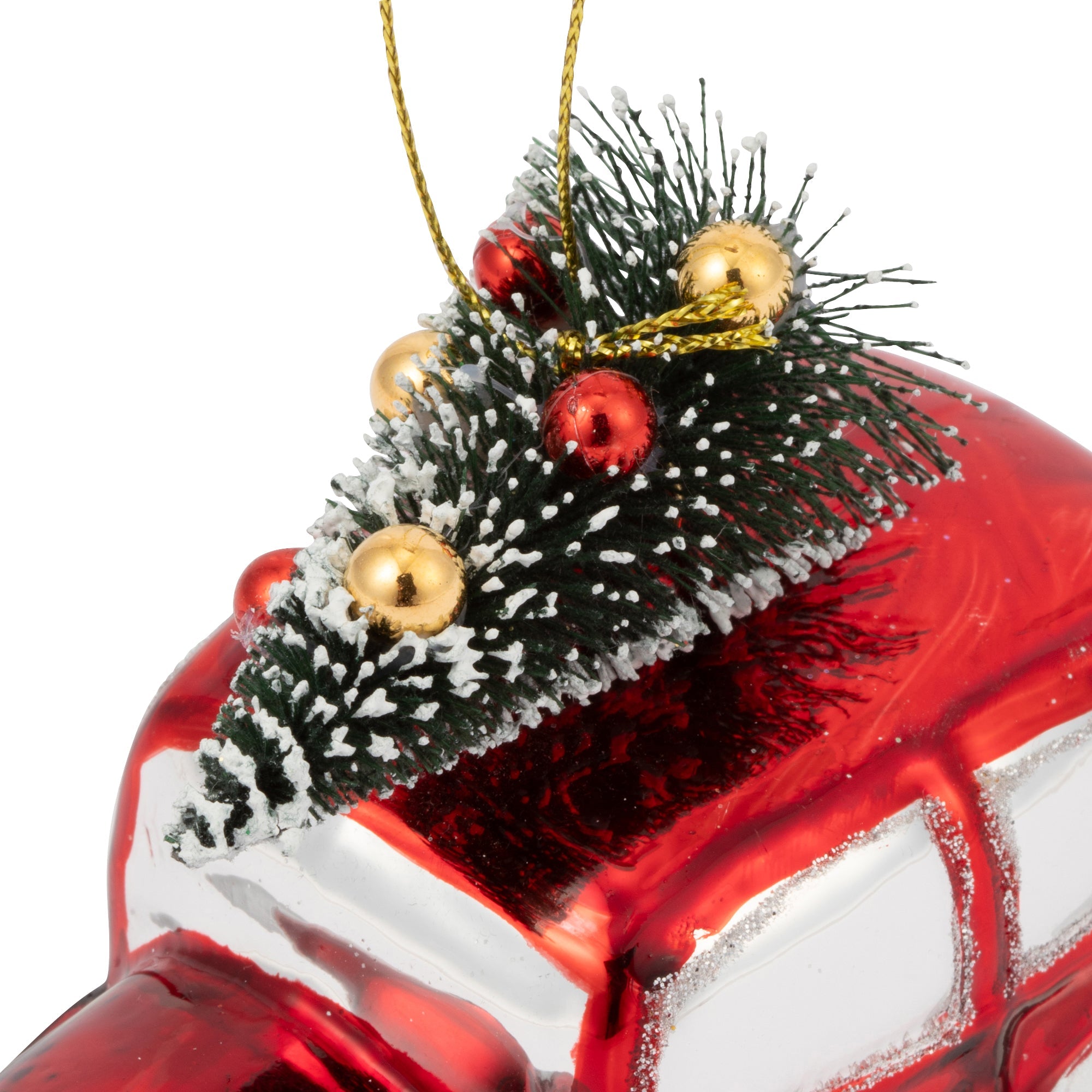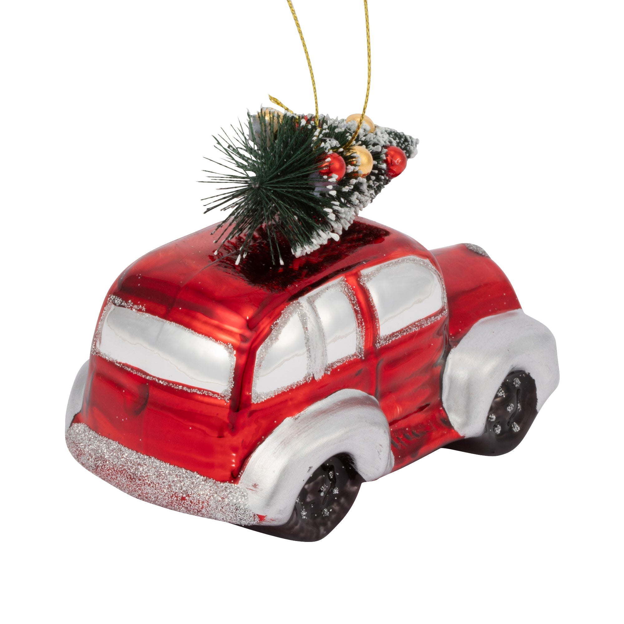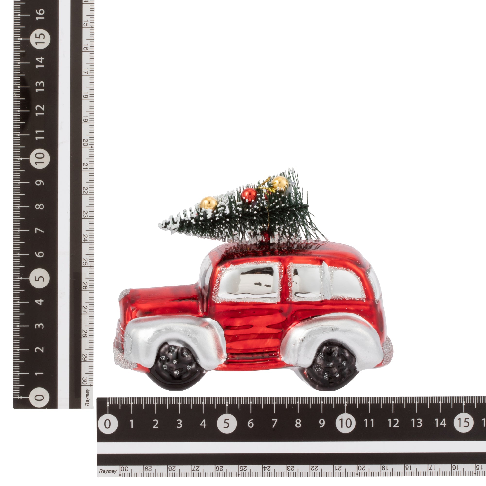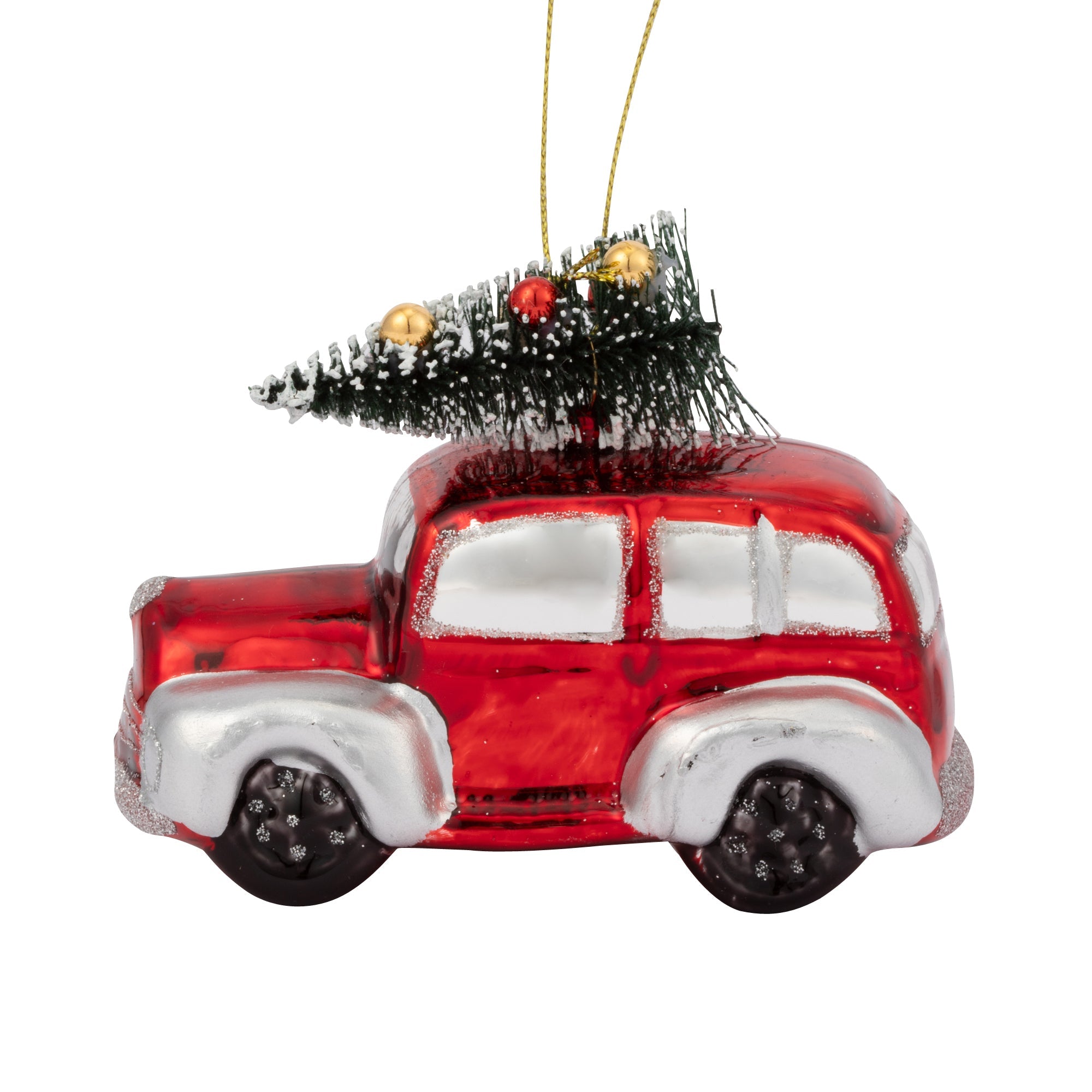 もみの木を運ぶ車がモチーフのガラスオーナメントです。 クリスマスらしいデザインでツリーとの相性もぴったりです。