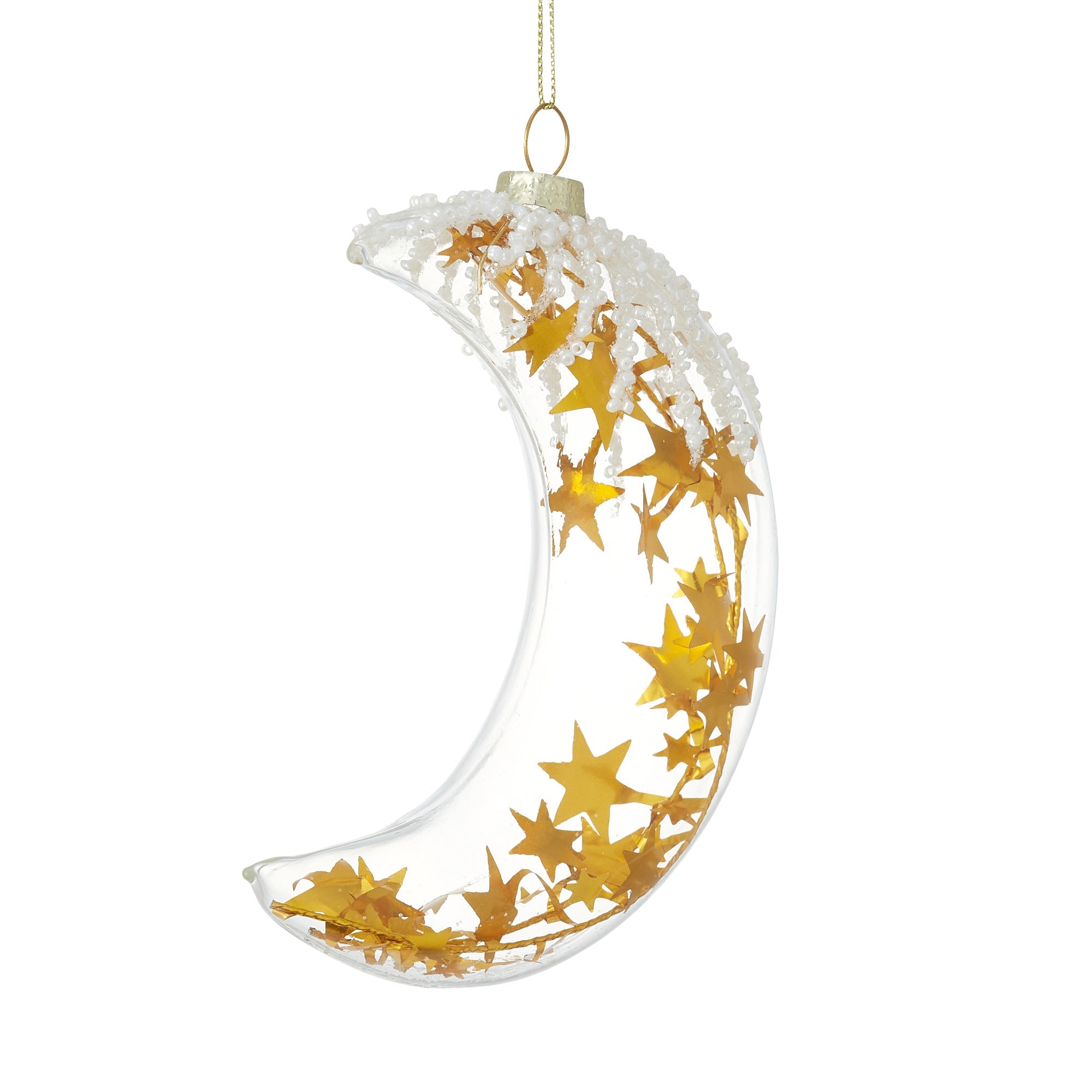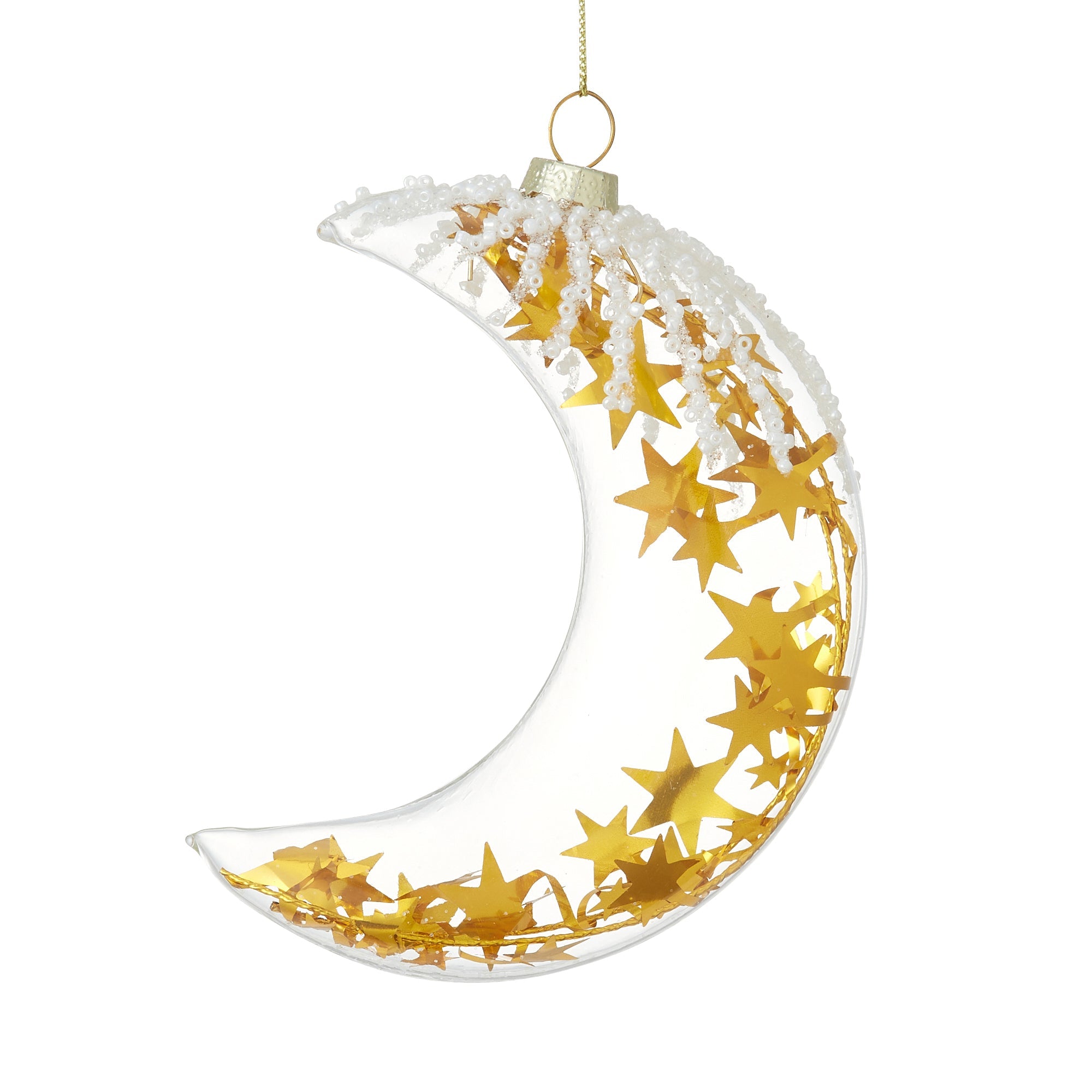夜空にきらめく月をイメージしたガラスオーナメントです。 ガラスの中に星モチーフのフィルムが入っており、遊び心のあるデザインです。