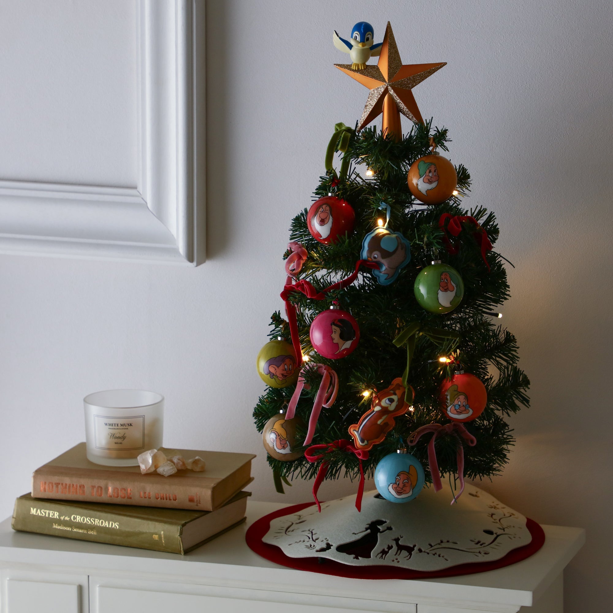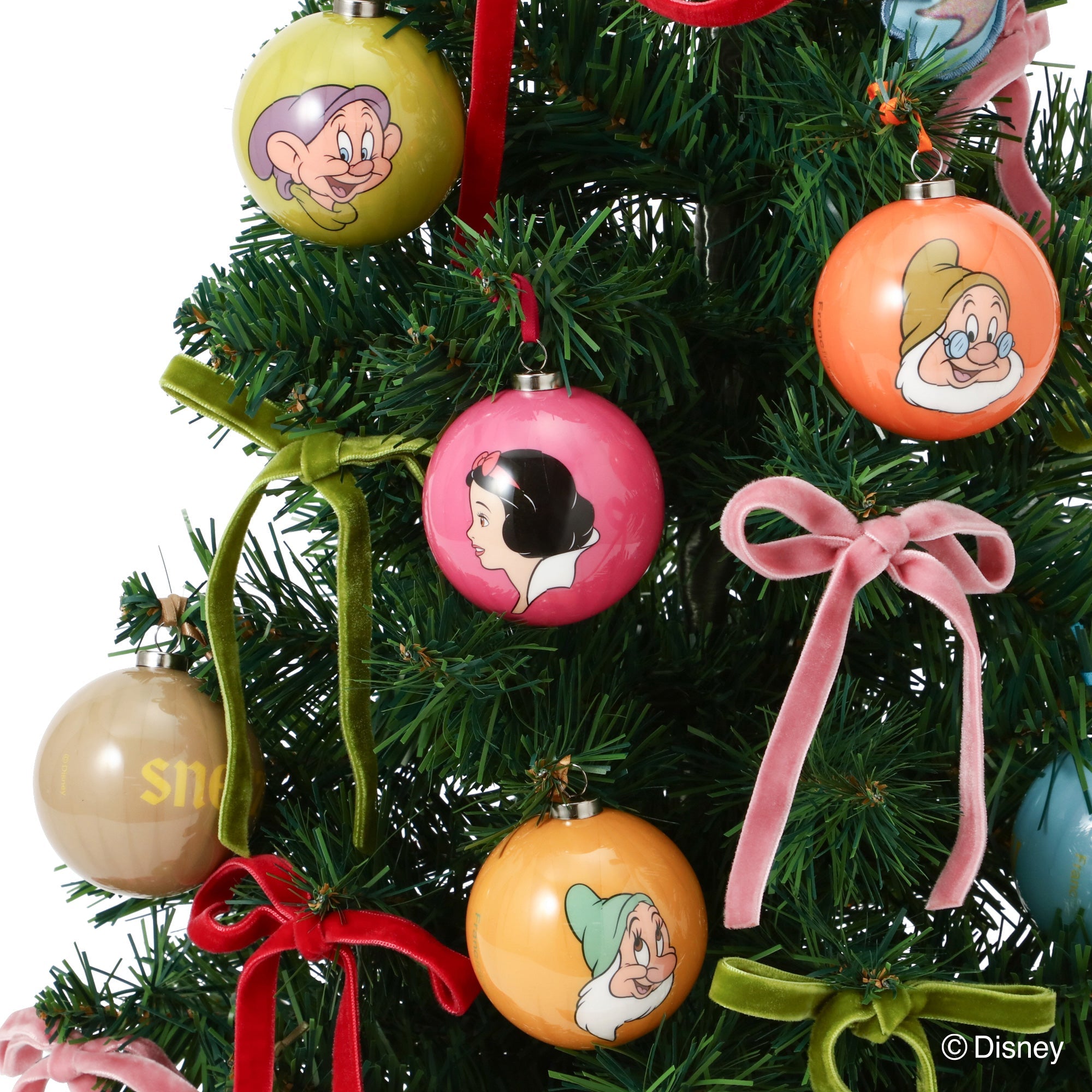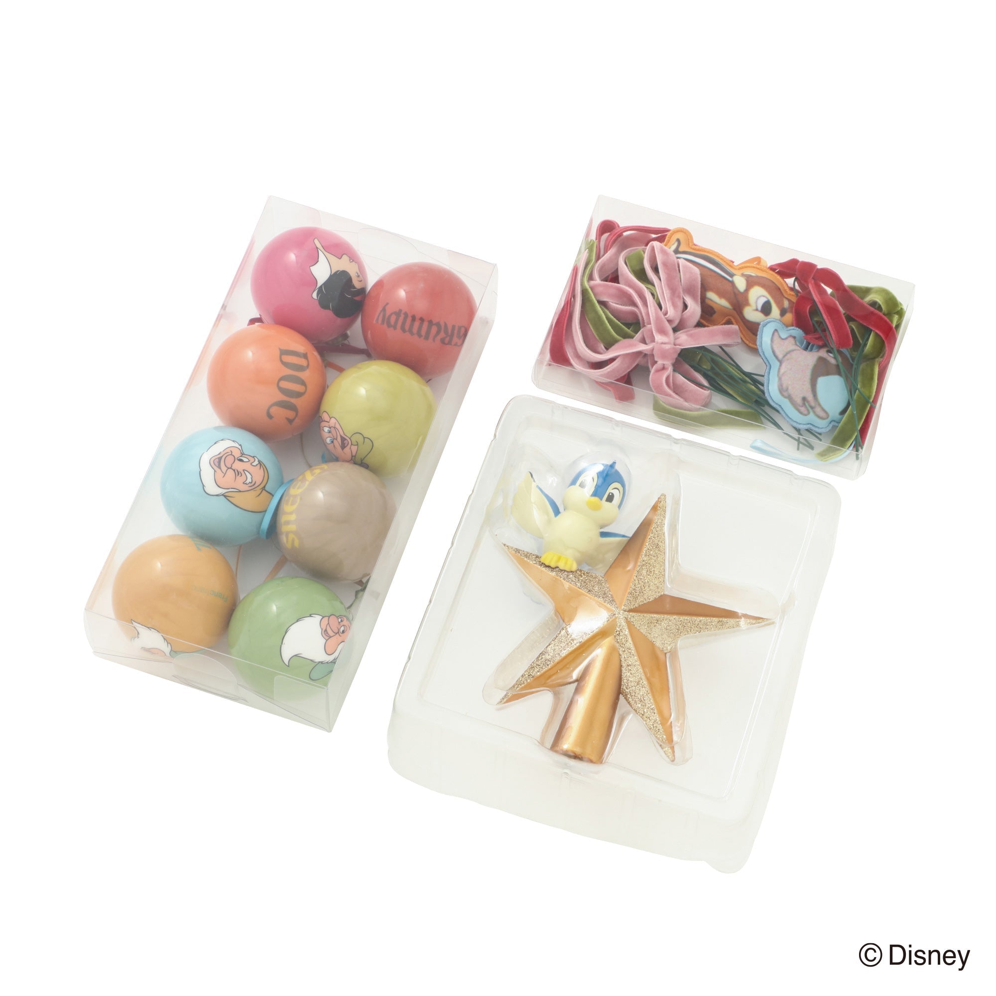 ディズニー映画『白雪姫』の物語から生まれたクリスマスツリースターターセットです。 ツリー、オーナメント、ツリースカート、ツリートップ、LEDライトをセットにしました。 クリスマスツリーのマストアイテムがすべて揃っているからバランスのとれたトータルコーディネートが簡単に叶います。 ツリー本体は「七人のこびと」をイメージして丸くナチュラルなフォルムに。 ツリーを飾るお手伝いをする動物たちや、表情豊かな「白雪姫」と「七人のこびと」のオーナメントが、心躍るホリデーシーズンをにぎやかに彩ります。カラフルなリボンをあしらい、トレンド感たっぷりに仕上げました。 LEDライトは温もり溢れるウォームカラーで8パターンの点灯機能を用意しています。 60cmタイプは玄関やTVボードなどの小スペースにも飾りやすいサイズ。お片付けも簡単だから、気軽にクリスマスデコレーションを取り入れられます。 まるで「白雪姫」になったような気分でクリスマスの準備をお楽しみください。