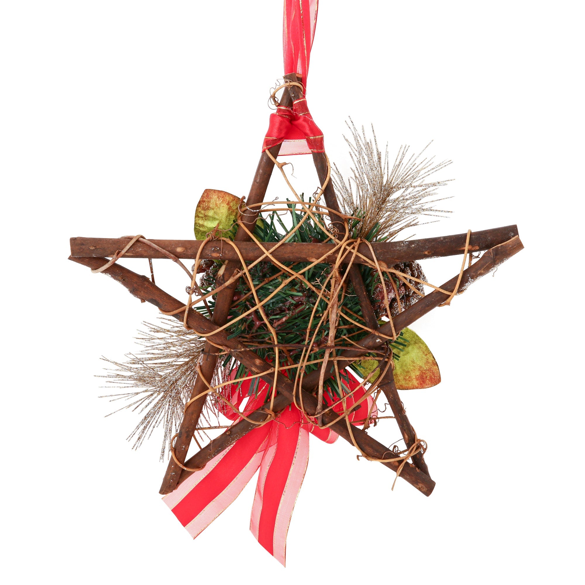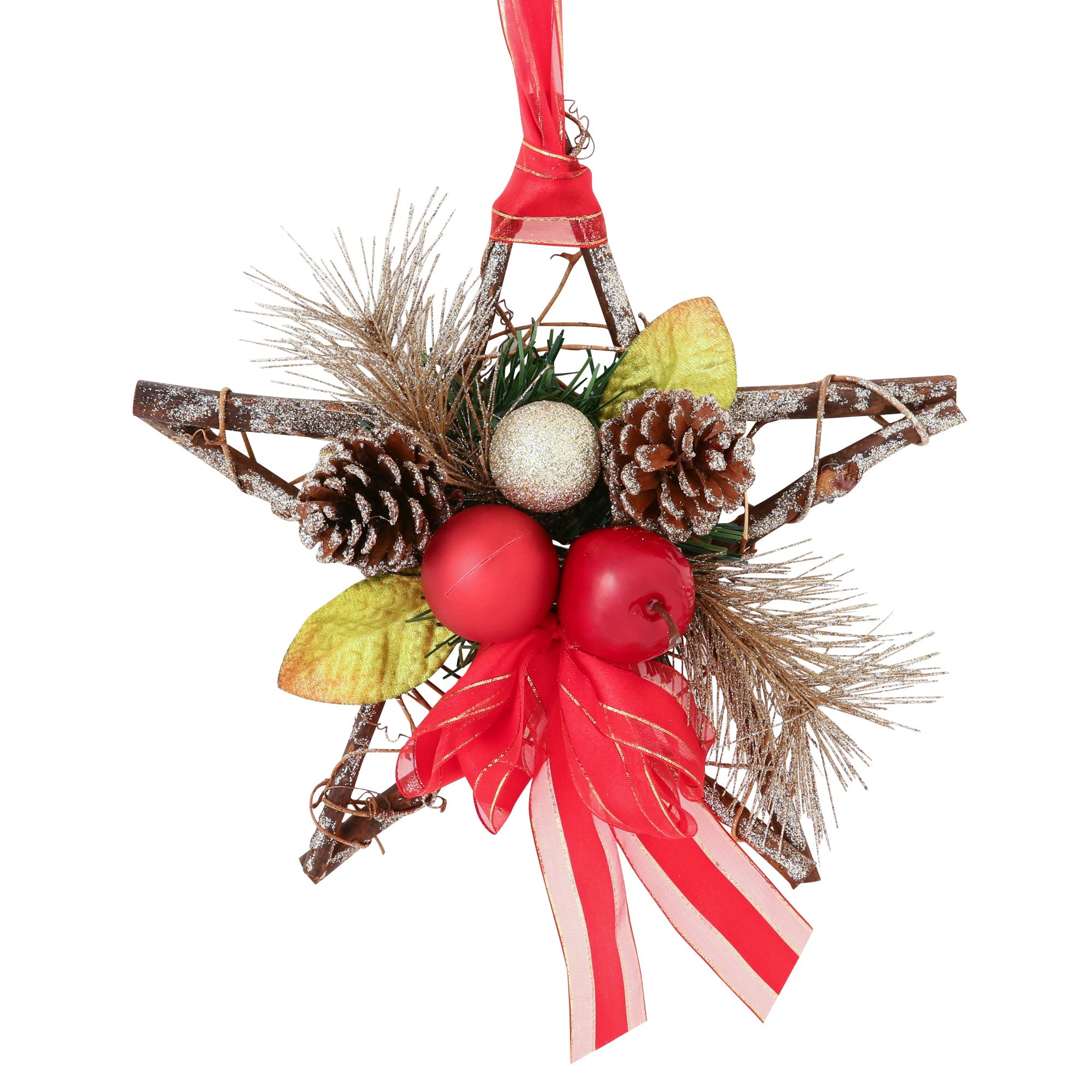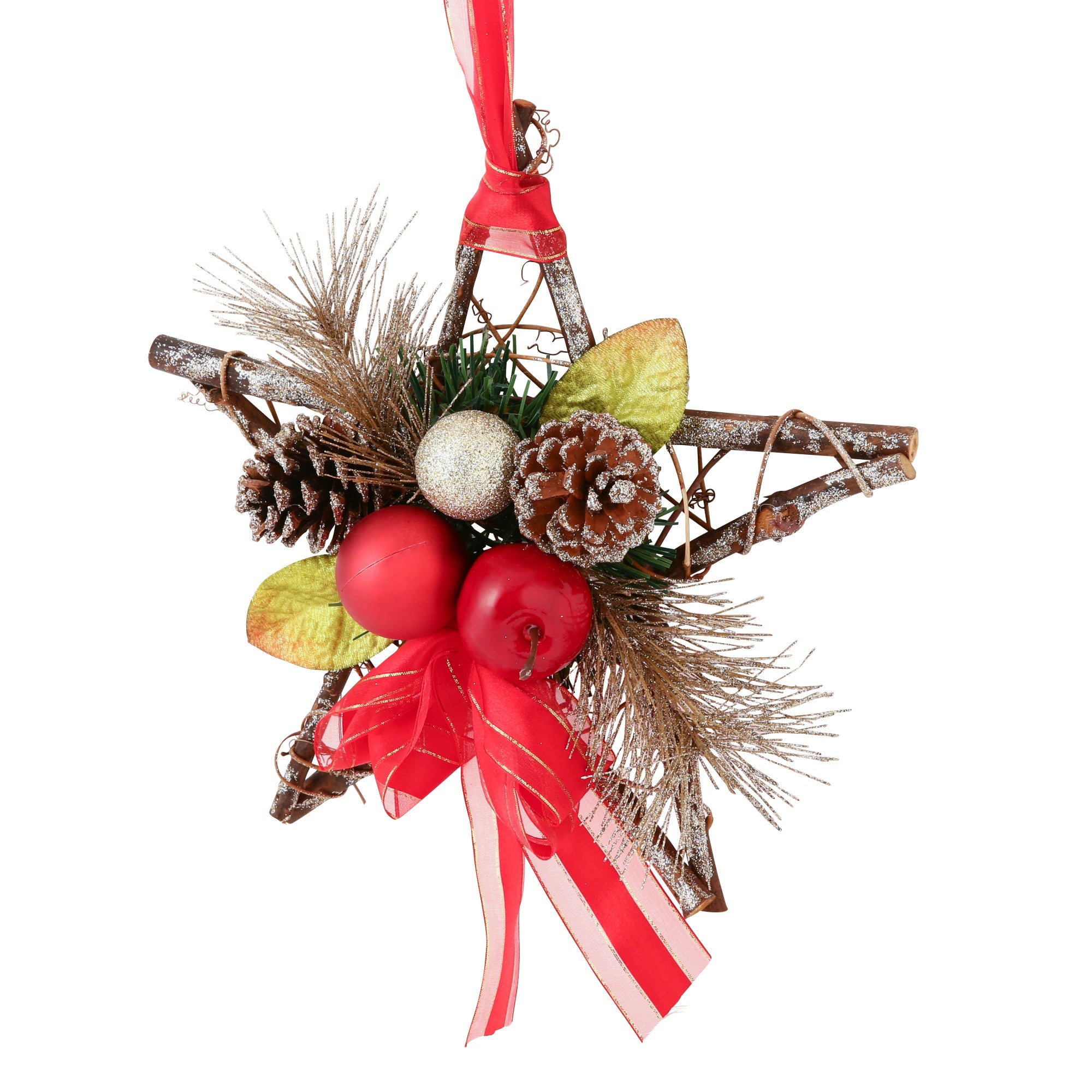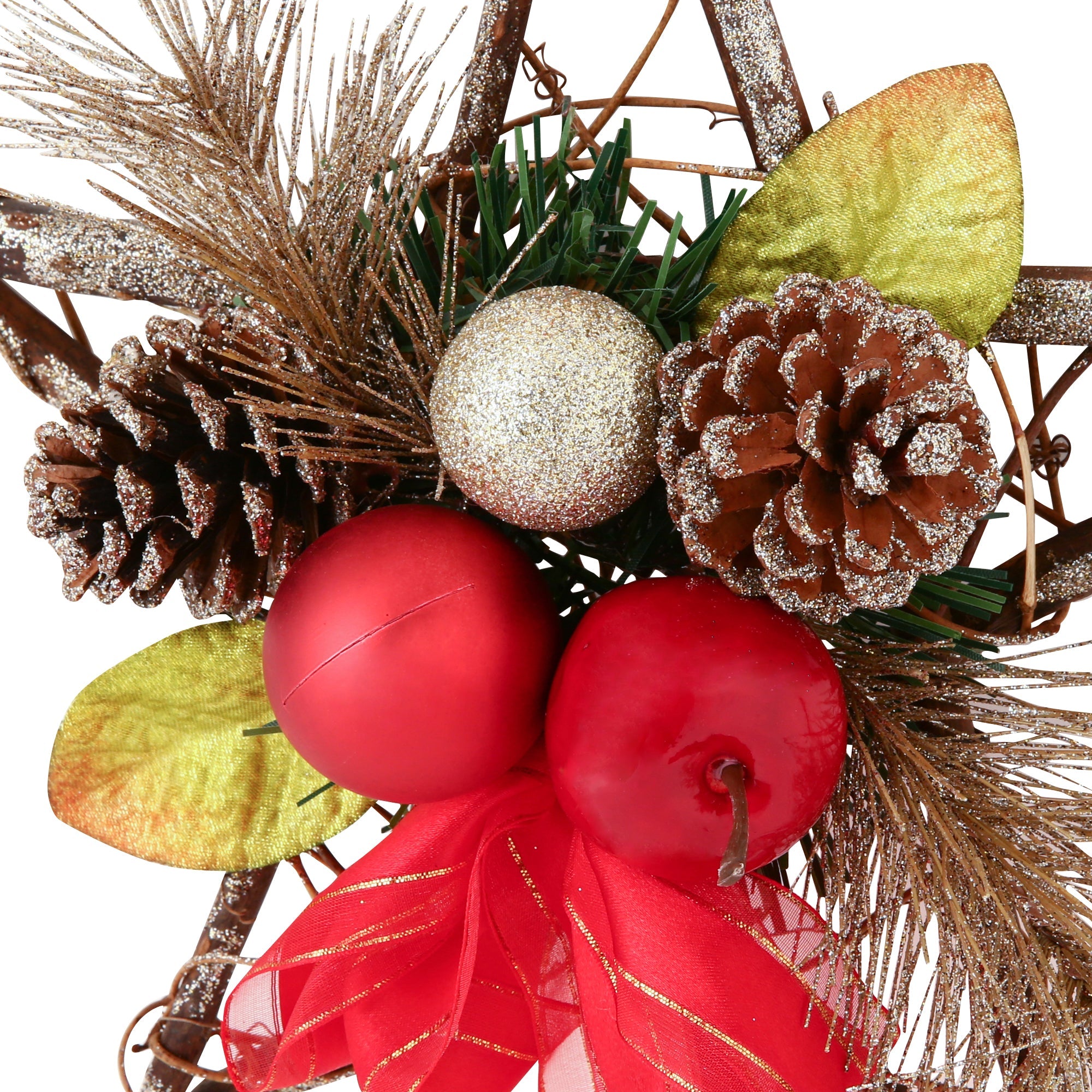 星形リースの中央に華やかなオーナメントをあしらった、おしゃれなリースです。 存在感があるので、ひとつ飾るだけでクリスマスらしさを楽しめます。 星形のリース本体にレッドやゴールドなど華やかなカラー使いで賑やかなデザインに仕上げています。