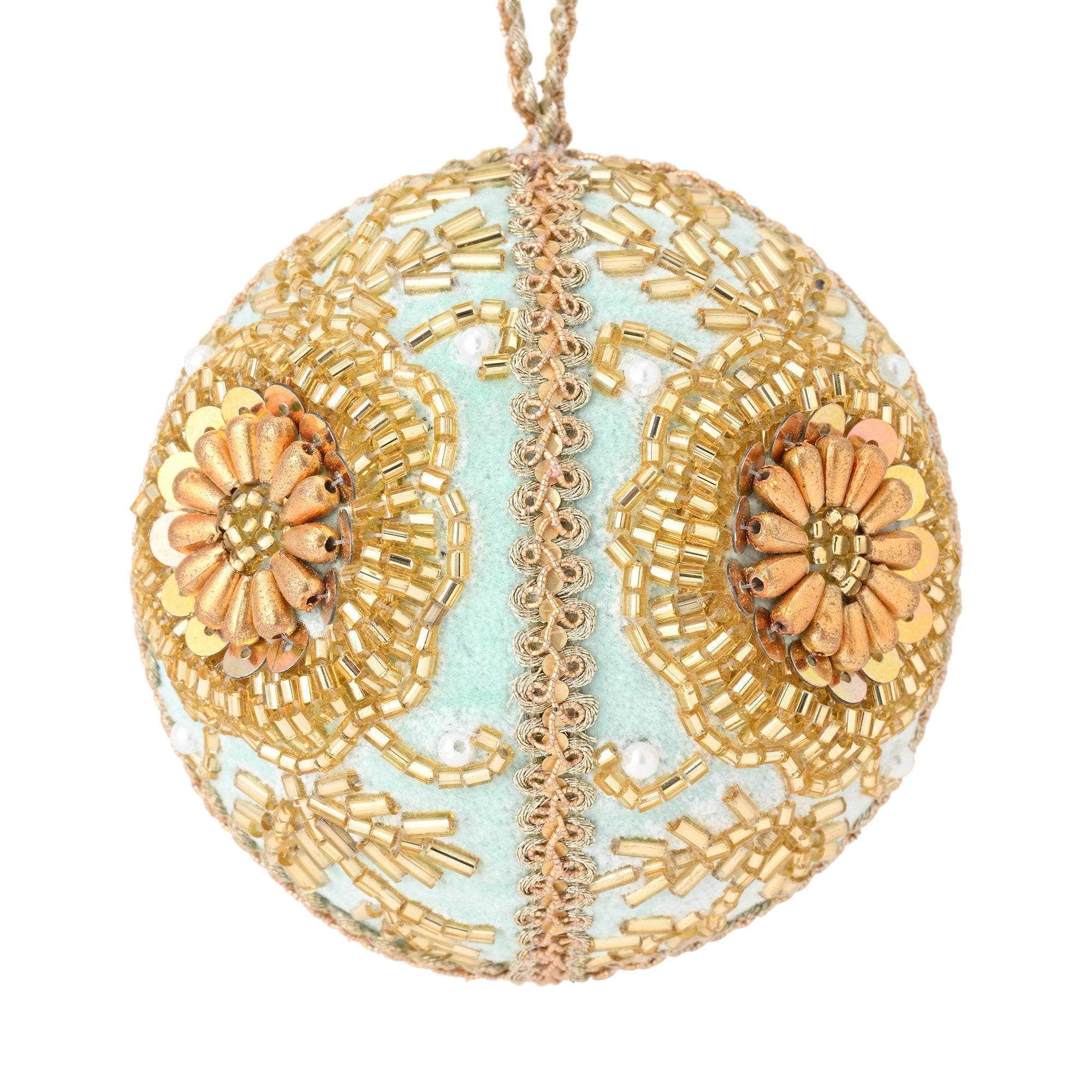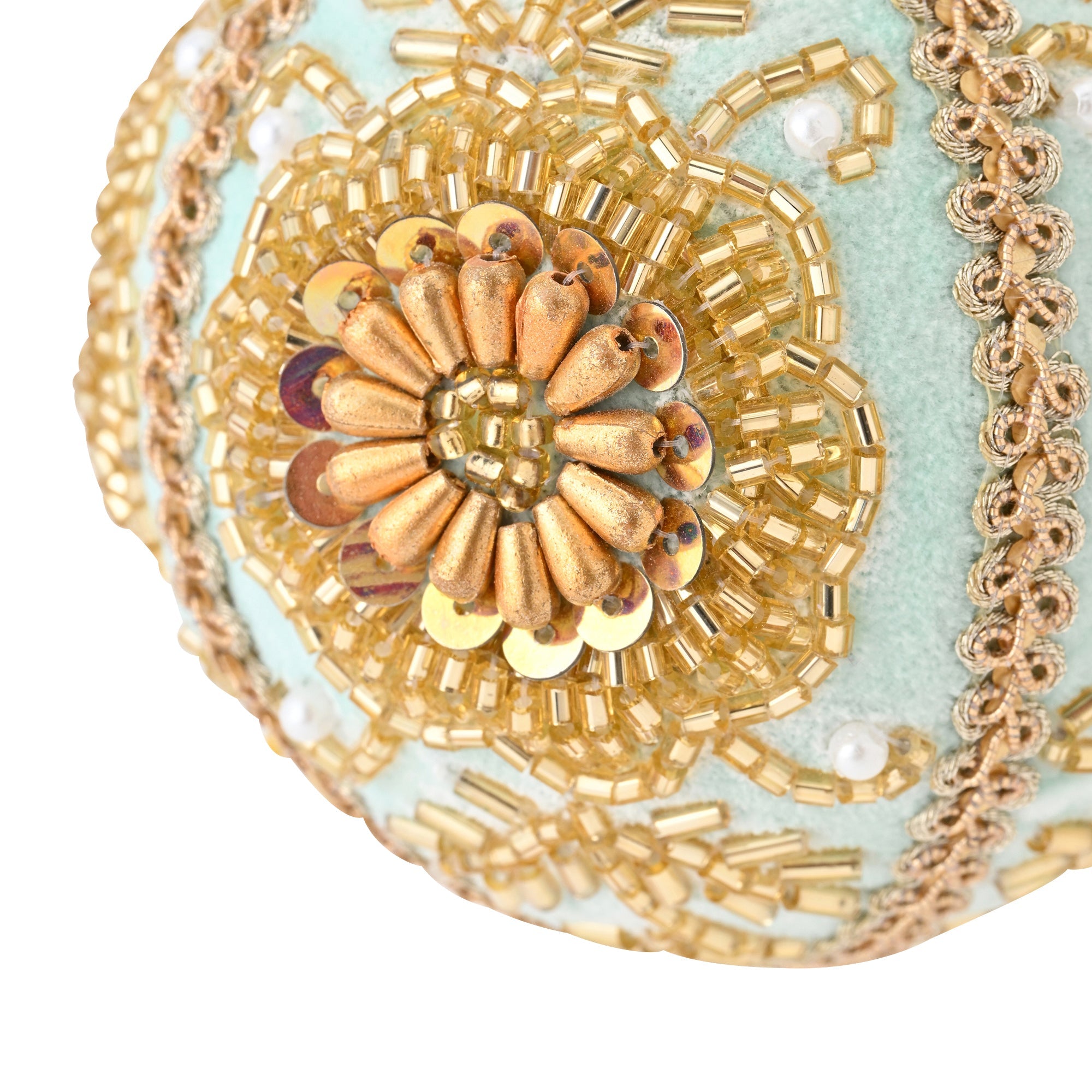 明るいブルーの生地にお花のビーズがついているオーナメントです。