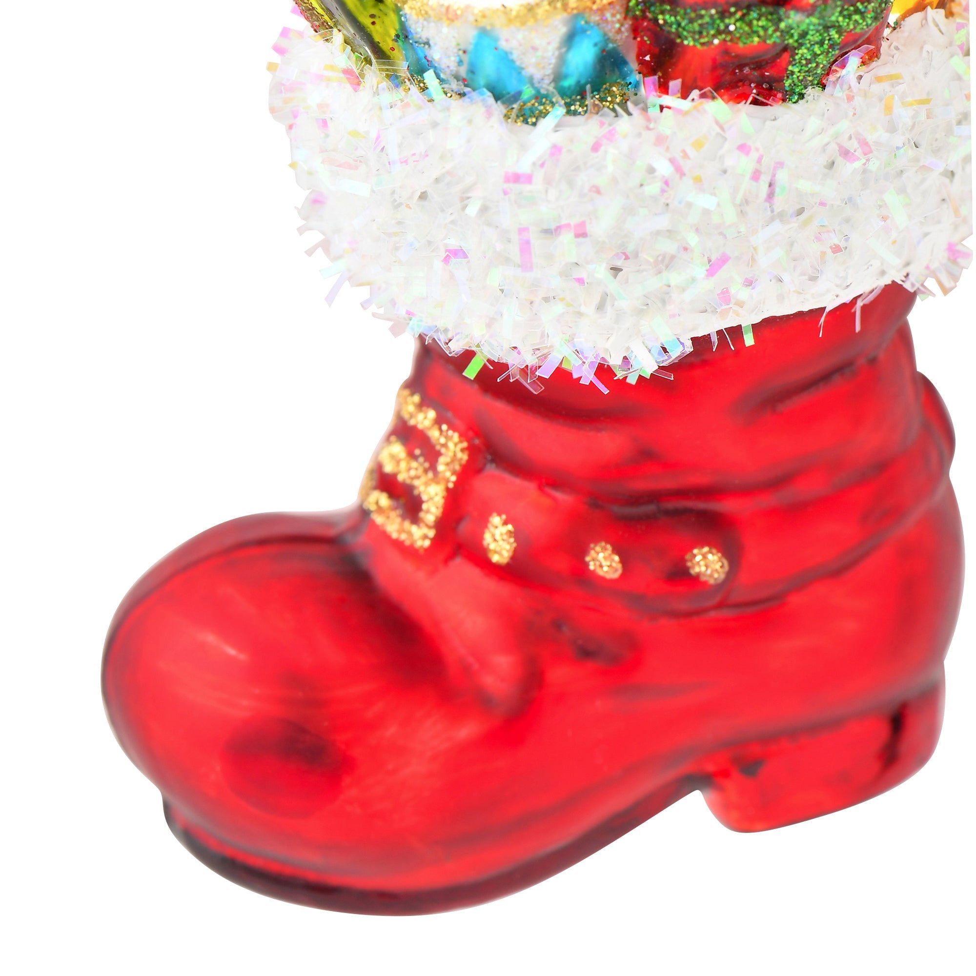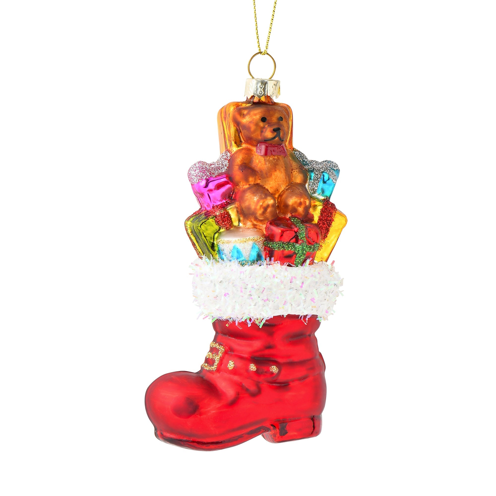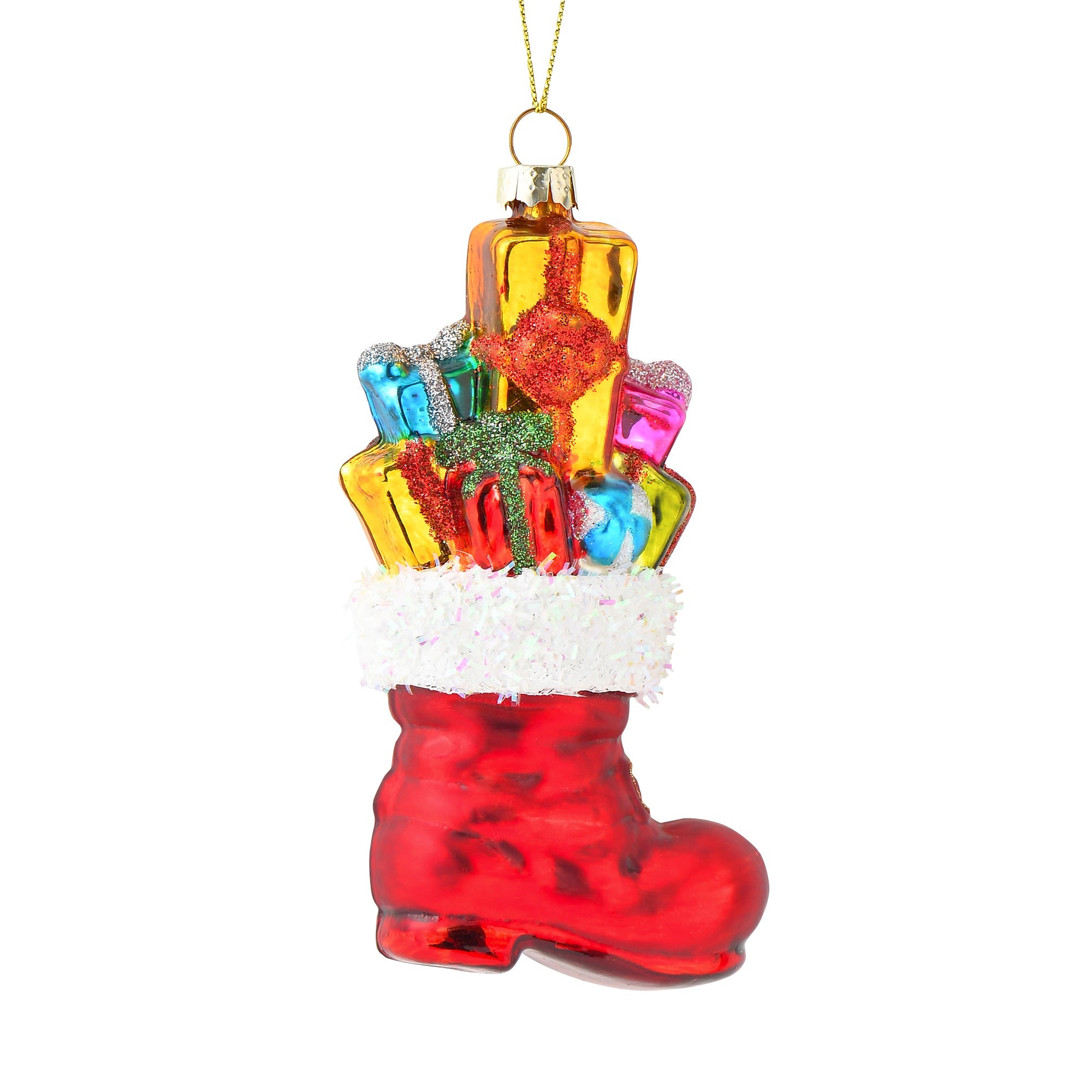プレゼントがいっぱいのブーツをモチーフにした、ガラスオーナメントです。