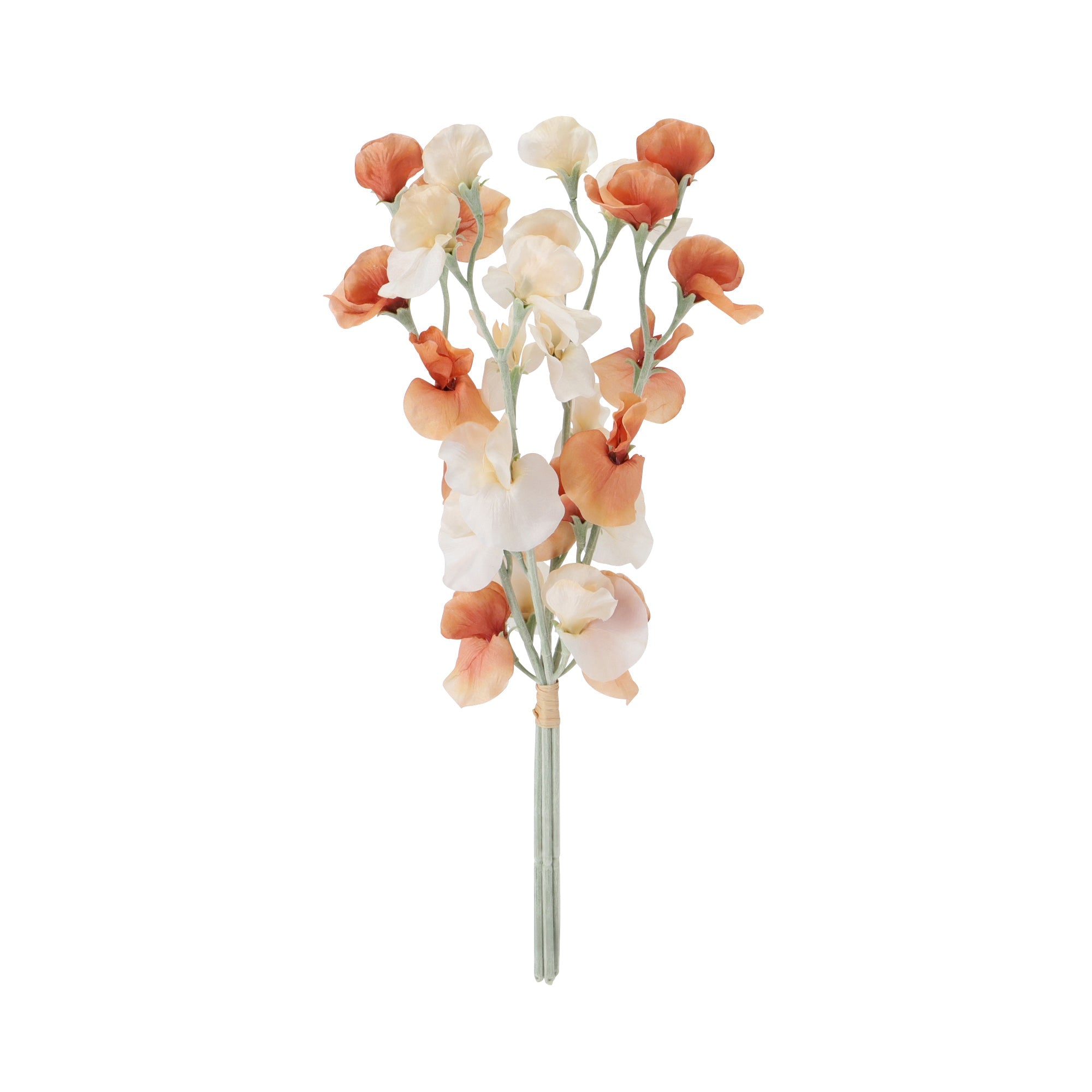 スイートピーのアートフラワーのブーケです。そのまま飾れてお手入れ要らず、綺麗なお花をずっと楽しむことができます。高さ18~20cm程度の花瓶に飾るだけで素敵なアレンジメントが完成します。ブラウンとクリームの落ち着いたカラーで、レッドやオレンジなど秋を感じるカラーのアートフラワーとの組み合わせもおすすめです。
