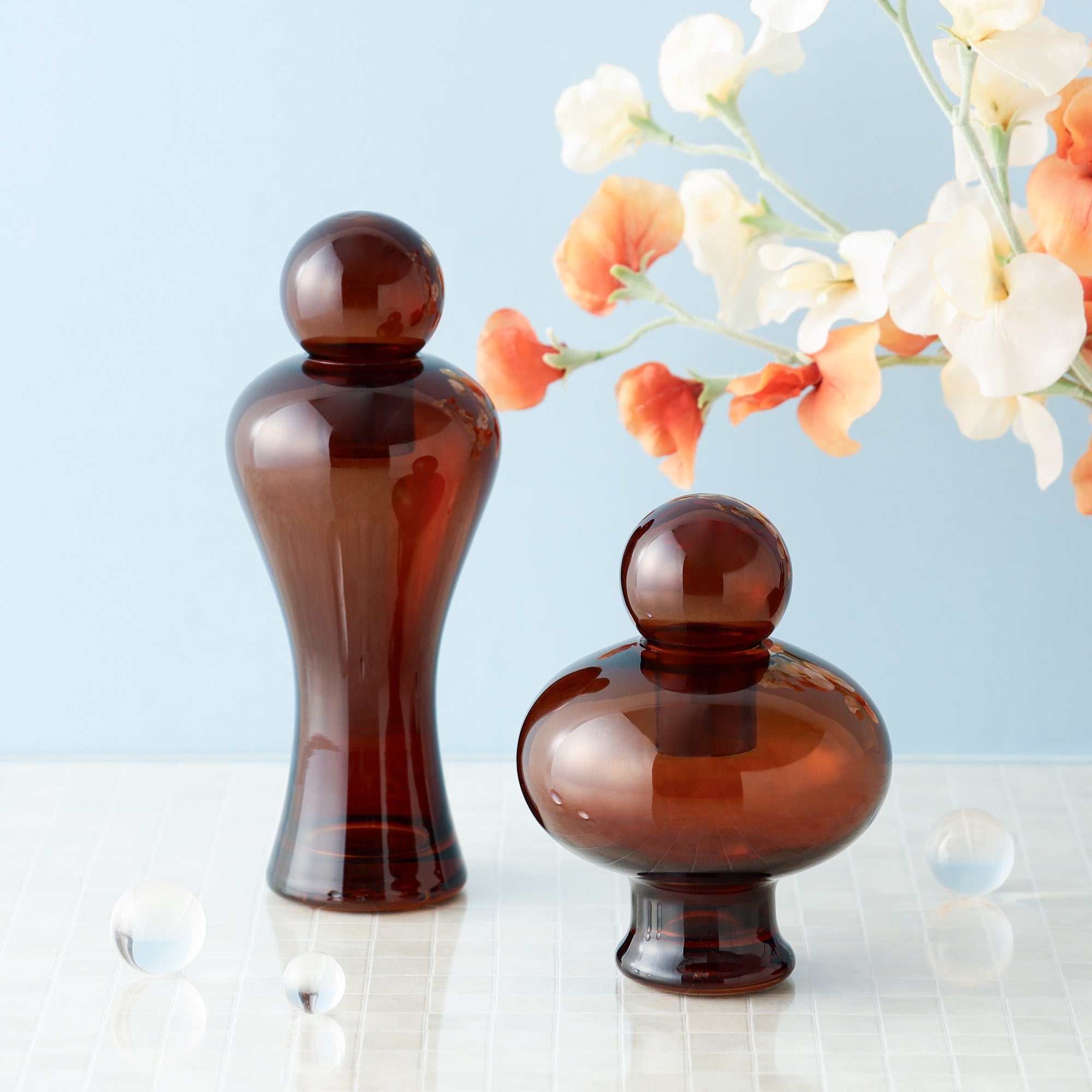 香水瓶のような蓋つきのガラスオブジェです。蓋を付けたままオブジェとして飾ったり、蓋を外してフラワーベースとしても使用いただけます。高さの異なる2種を並べて飾ると動きのあるインテリアアイテムとなりオススメです。