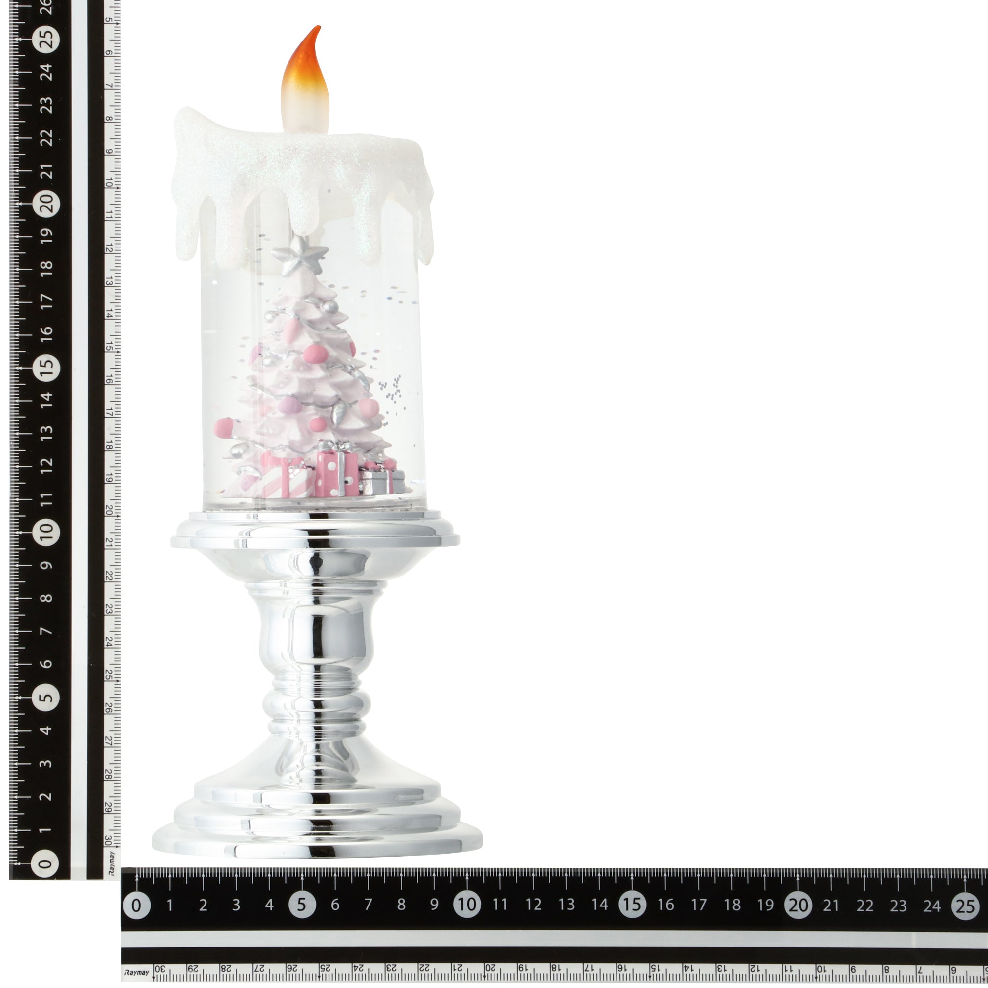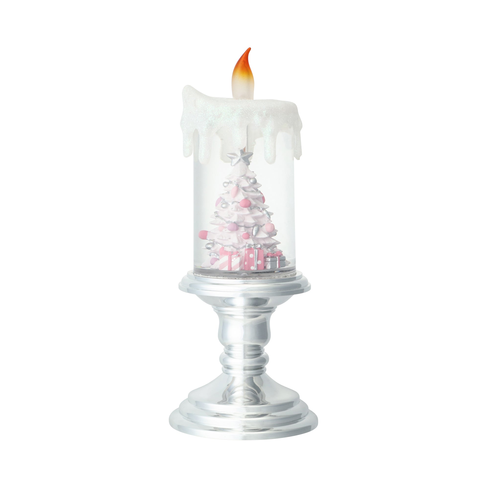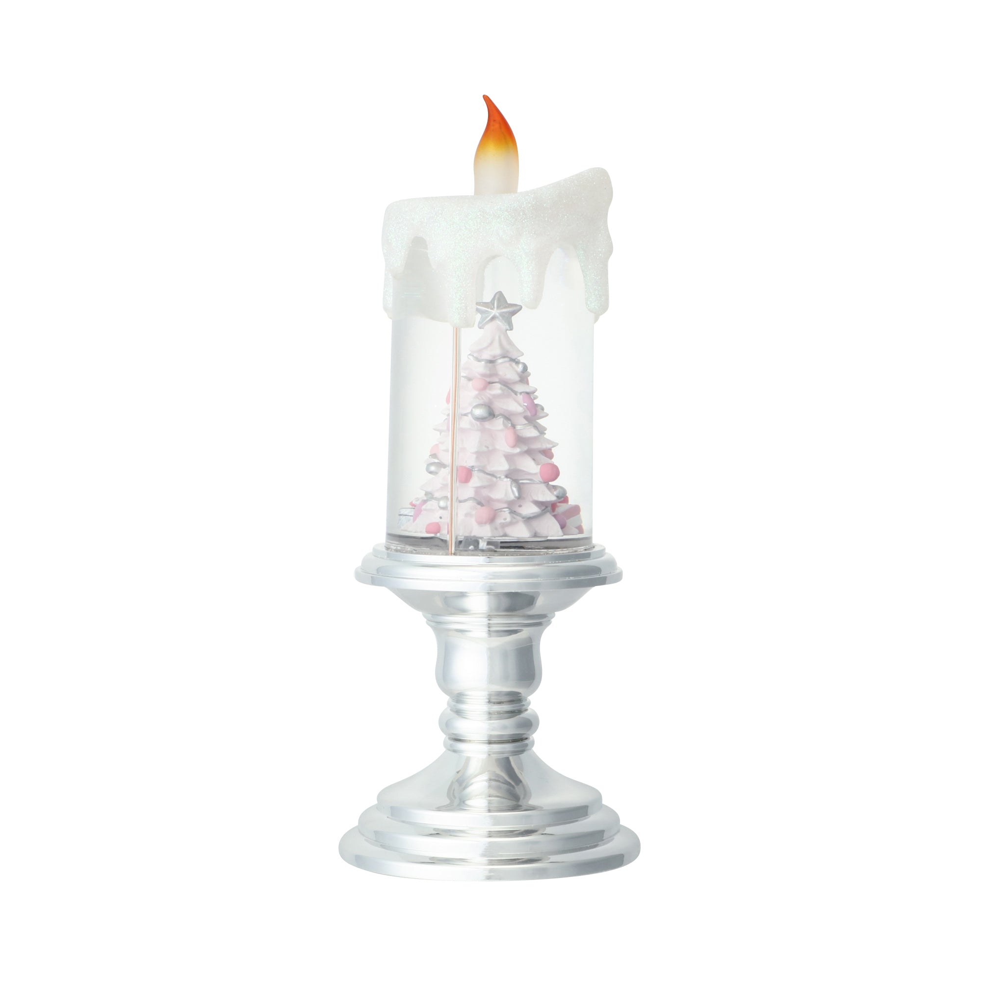 自動回転式のキャンドル型スノードームです。キャンドルの中にはピンク色のキュートなクリスマスツリーのミニチュアが入った可愛らしいデザイン。スイッチを入れると、積もっていたシルバーのラメがいちめんにパッと舞い上がりキラキラ輝く光景は幻想的です。自動で回転する機能が付いているので、優雅に回るスノードームがお部屋を楽しく彩ります。