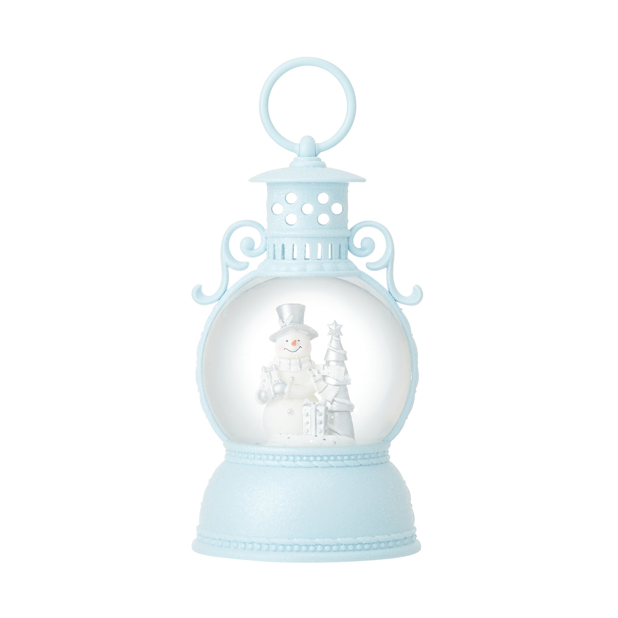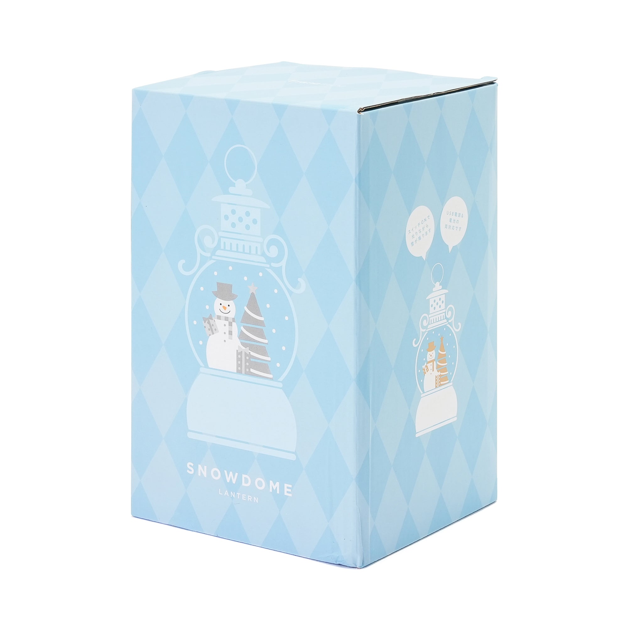 自動回転式のラウンドランタン型スノードームです。シルバーと白のツートーンのスノーマンとツリーのオブジェが輝く、可愛い中にも大人っぽさがあるデザインです。スイッチを入れるとライトが点いて、自動的にラメが舞い上がります。ラメがライトに照らされキラキラ輝く光景はクリスマスシーズンにぴったり。スノードームを置いた場所にも光が映って幻想的な雰囲気をお楽しみいただけます。