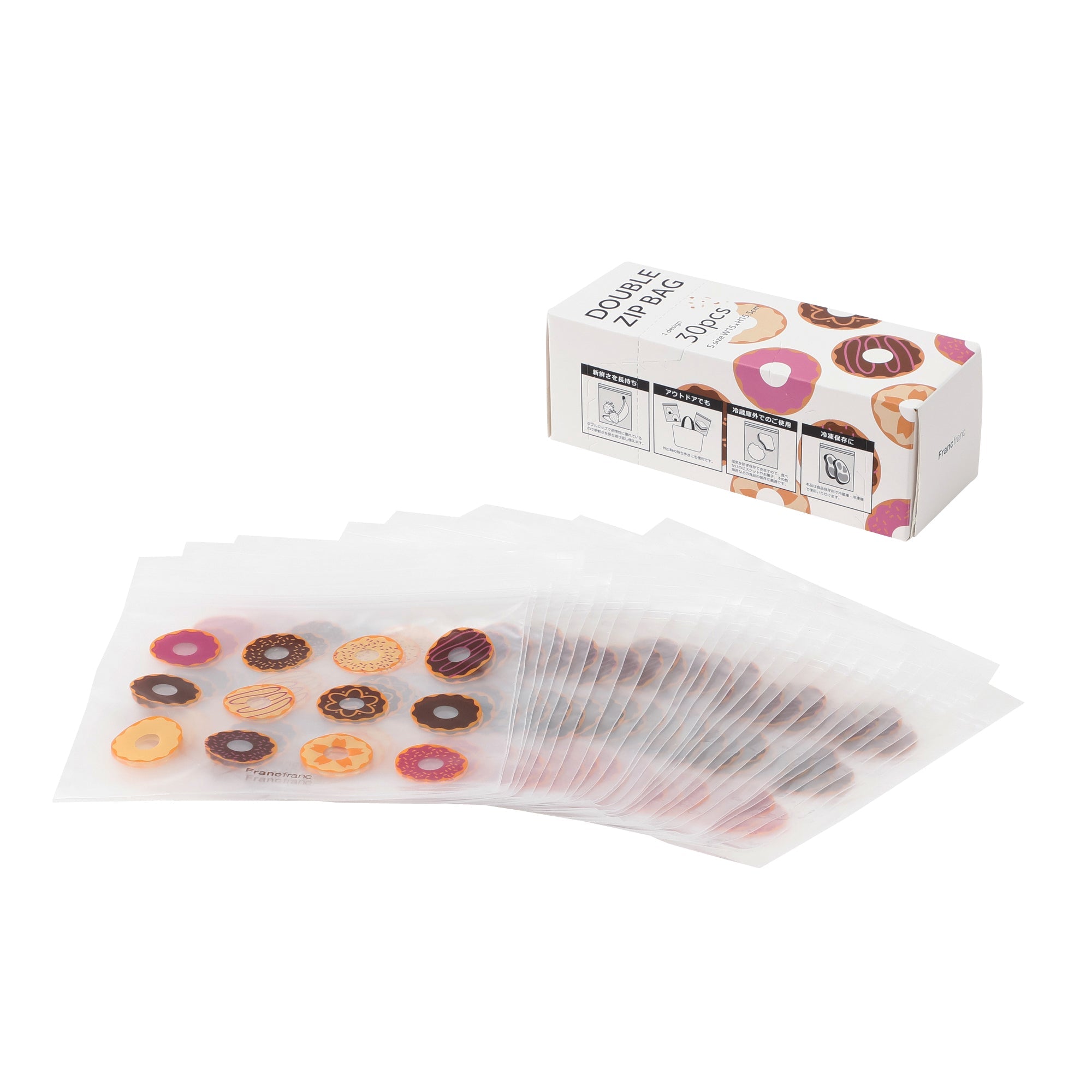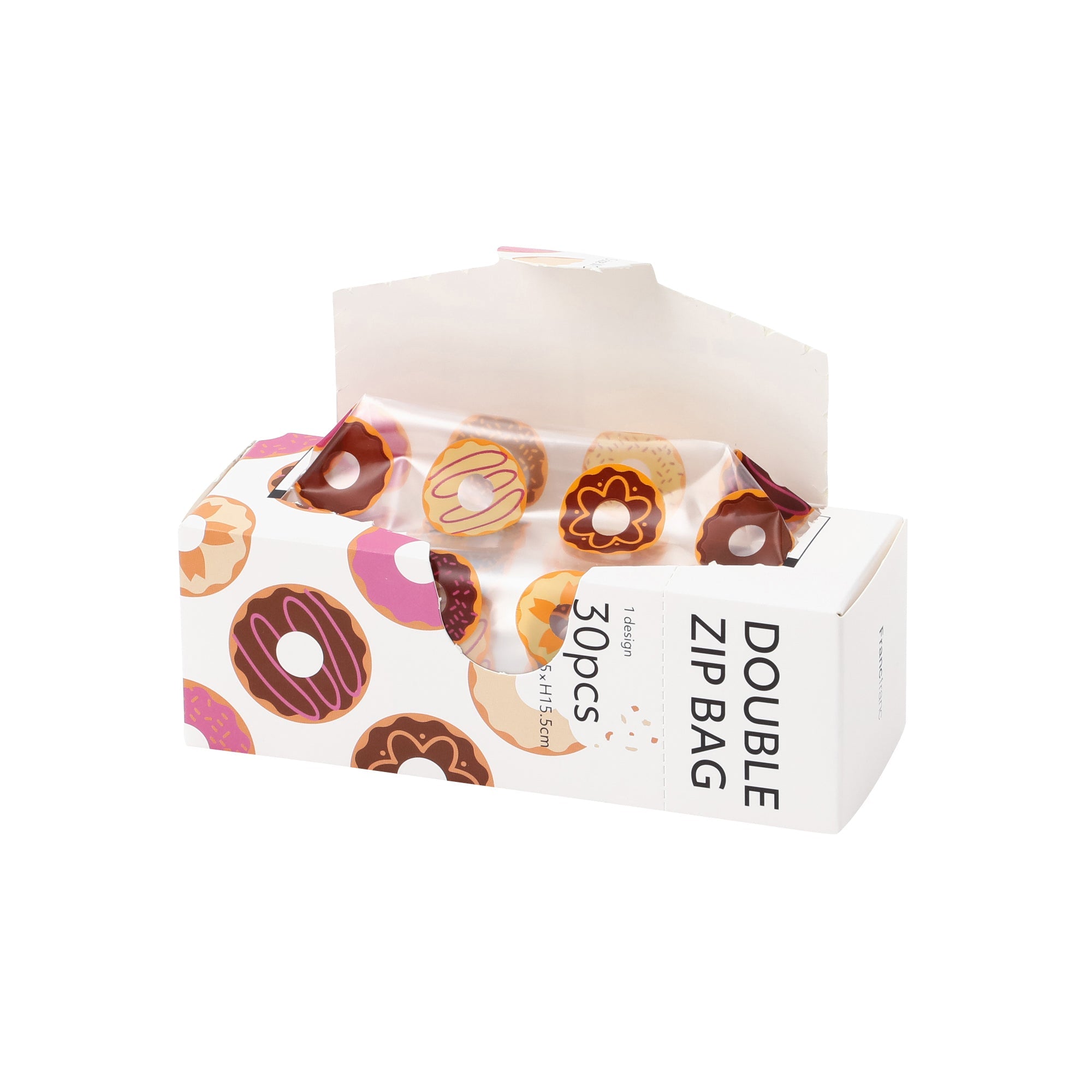 おしゃれで便利、機能性に優れたダブルジップバッグです。 1柄30枚入りのお買い得なセット。 密封性が高い2重のジップで、お料理の保存だけではなく小分け袋や雑貨の収納袋としても楽しくお使いいただけます。 箱は横からも開けられます。