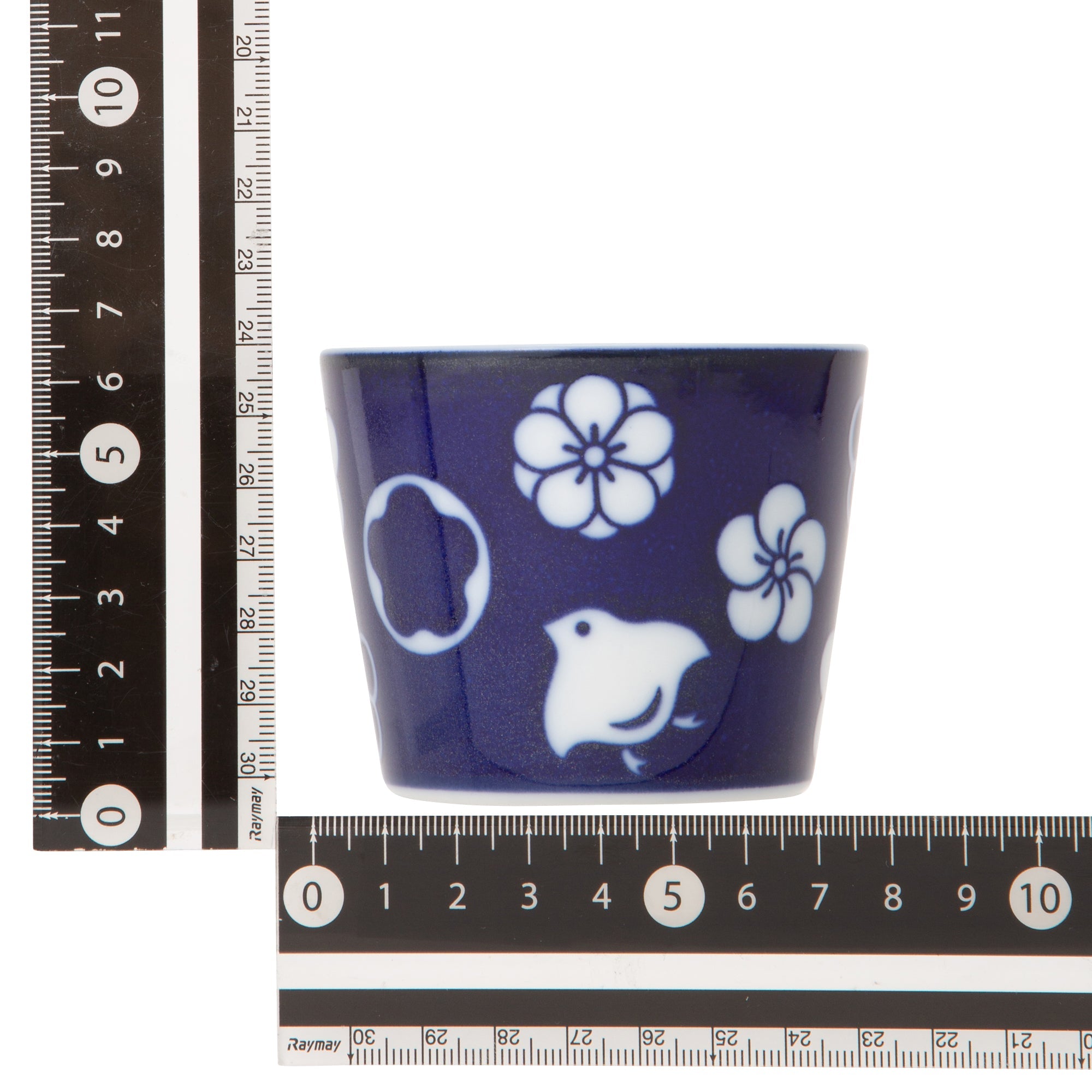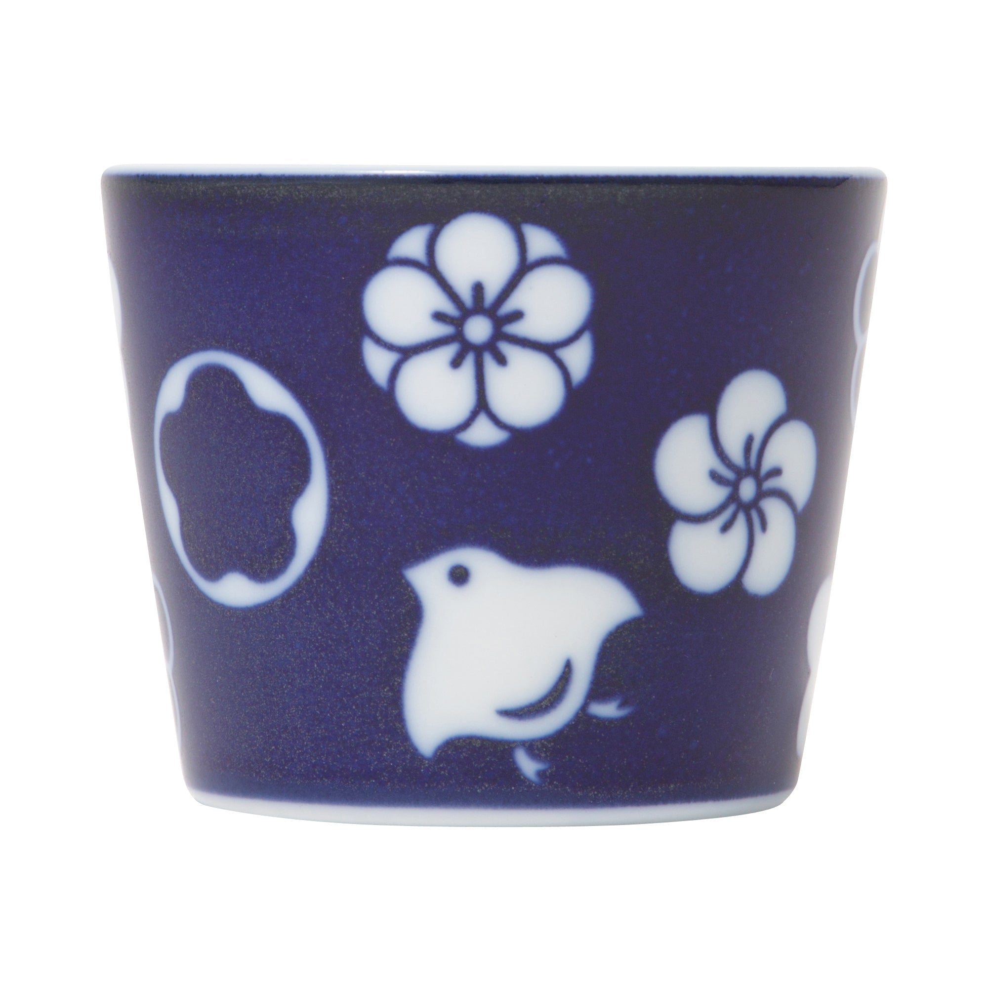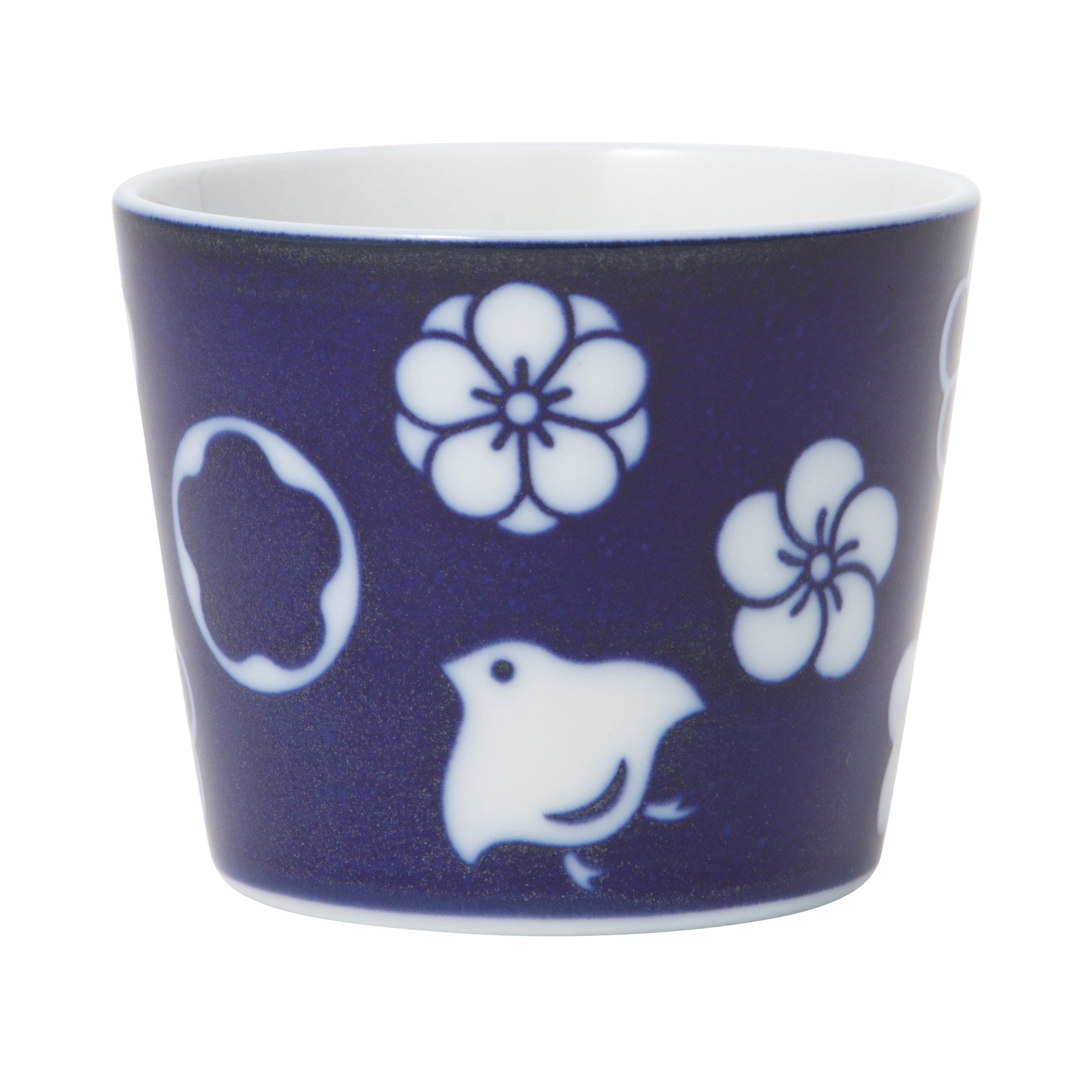 日本の伝統柄を用いた定番な形状の蕎麦猪口です。梅と千鳥の縁起の良い組み合わせの柄と白地に濃い藍色が映えた美しい仕上がりになっています。蕎麦猪口としてはもちろん、小料理やソースなどの取り分けや、アイスや寒天のデザートカップとしてもお使いいただける、使い勝手の良い食器です。