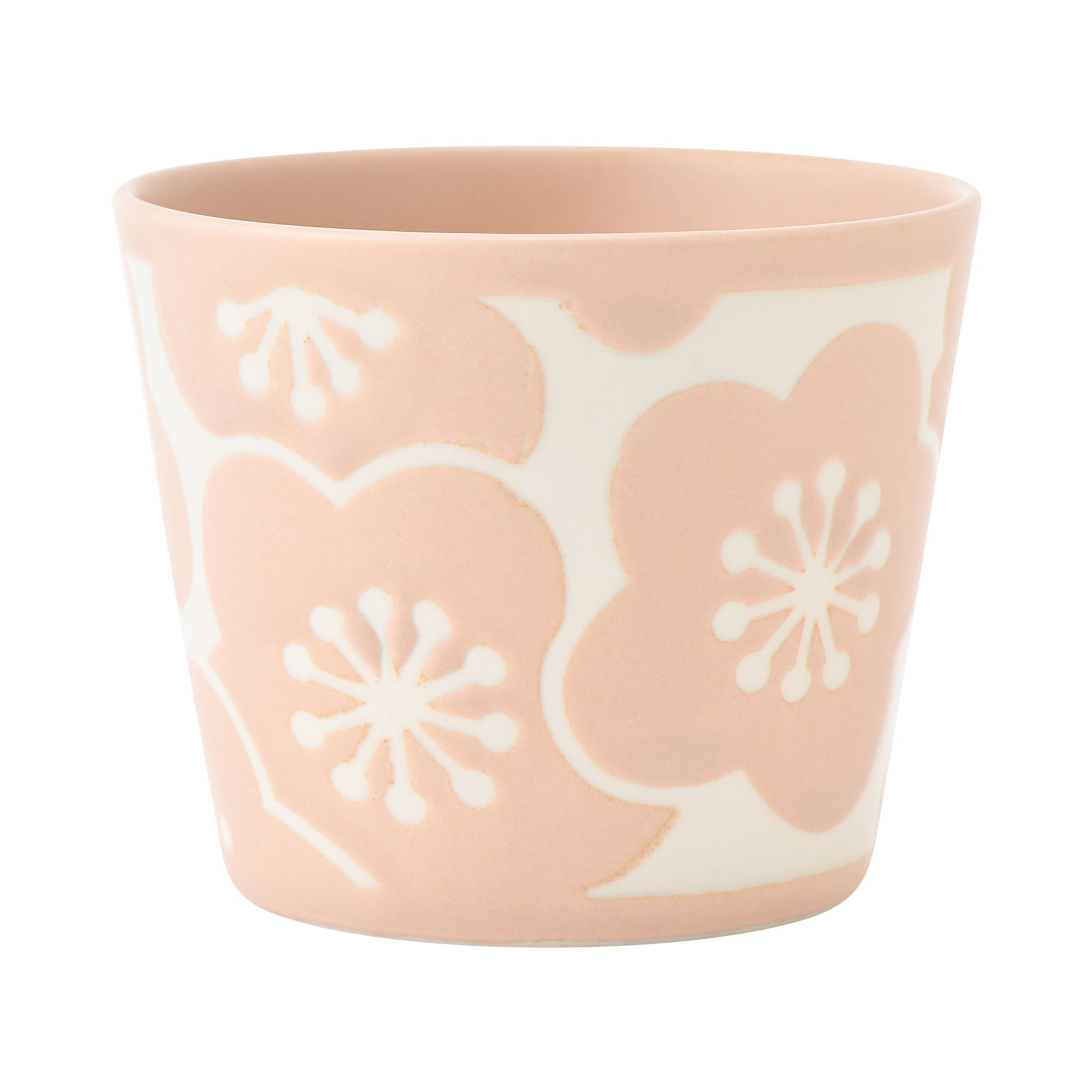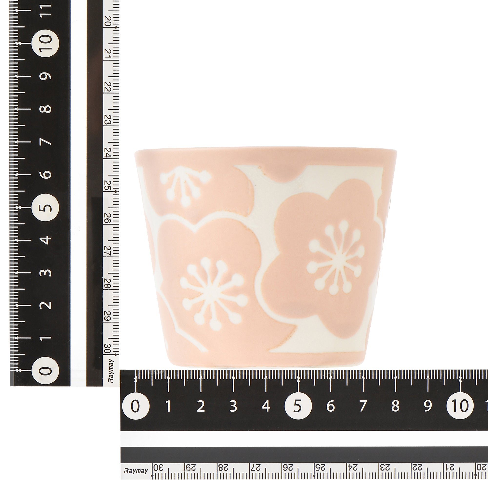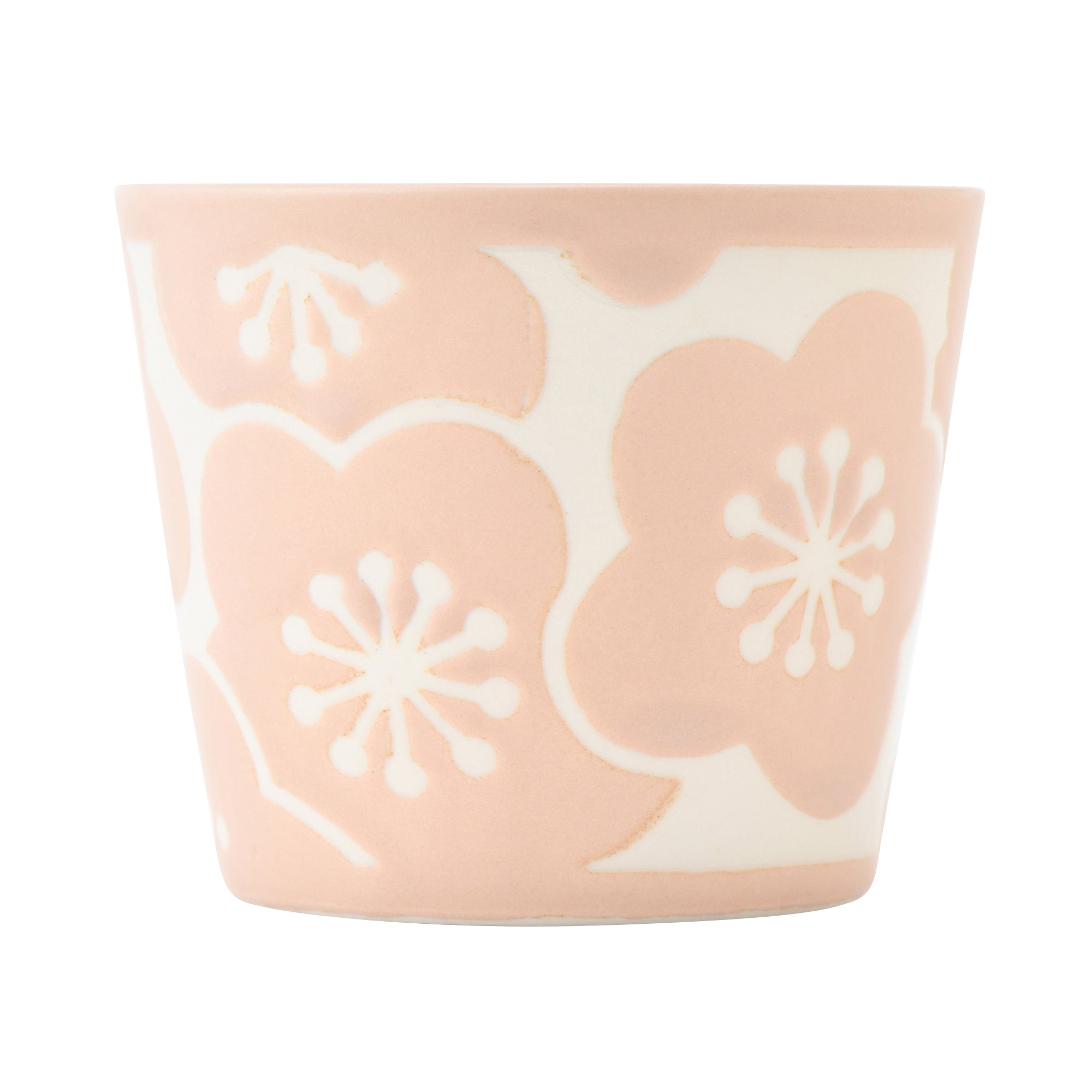 おおまかな梅の花の柄がレトロでかわいらしい蕎麦猪口です。 マットな質感で手馴染みがよく、使いやすい定番の形状です。蕎麦猪口としてはもちろん、小料理やソースなどの取り分けにもお使いいただける使い勝手のいい器です。 同シリーズの薬味皿とセットでのご使用もおすすめ。薬味皿と柄を合わせても、あえて違う柄を合わせても楽しめます。 ※こちらの商品は焼き物のため、色、サイズ、風合いに個体差があります。ご了承ください。