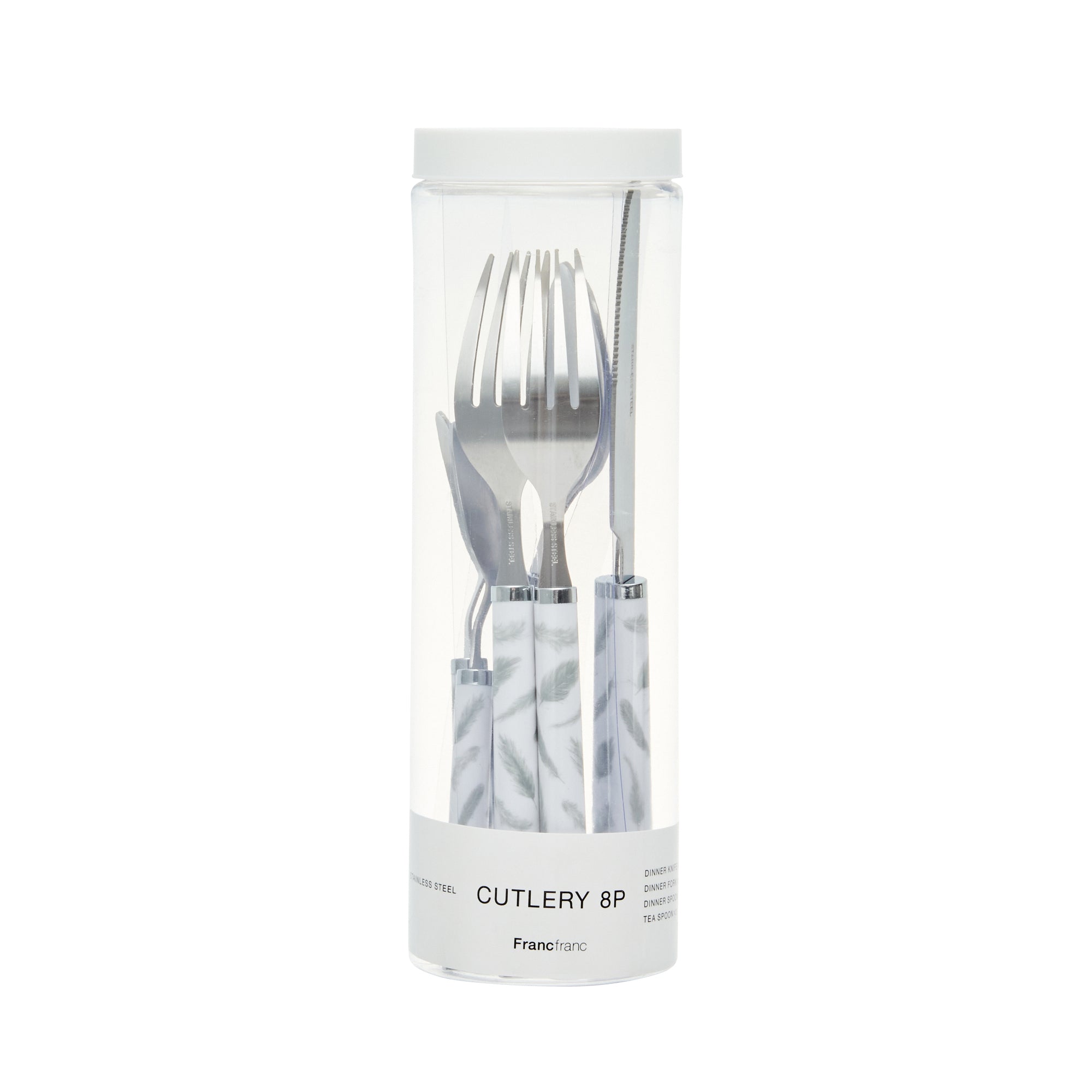人気の羽根モチーフが上品なデザインのカトラリーセットです。ディナースプーン、フォーク、ナイフ、ティースプーンが各2点ずつ入っており、必要な種類がまとめて揃います。新しい生活を始める方への贈り物としてもおすすめです。