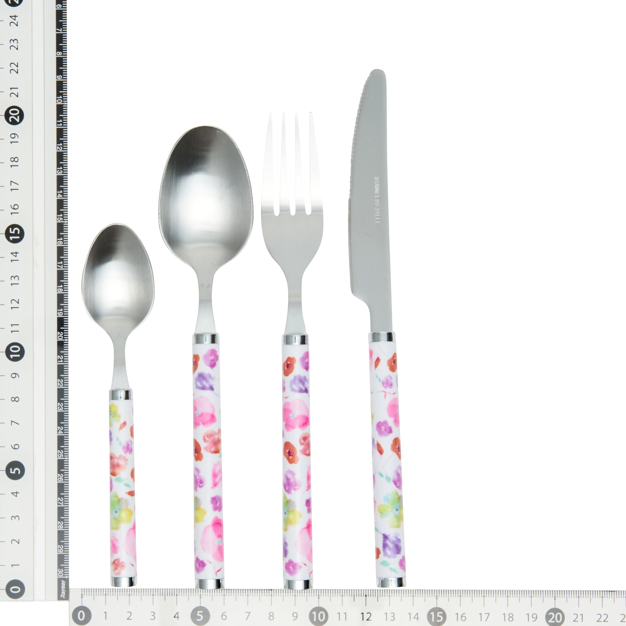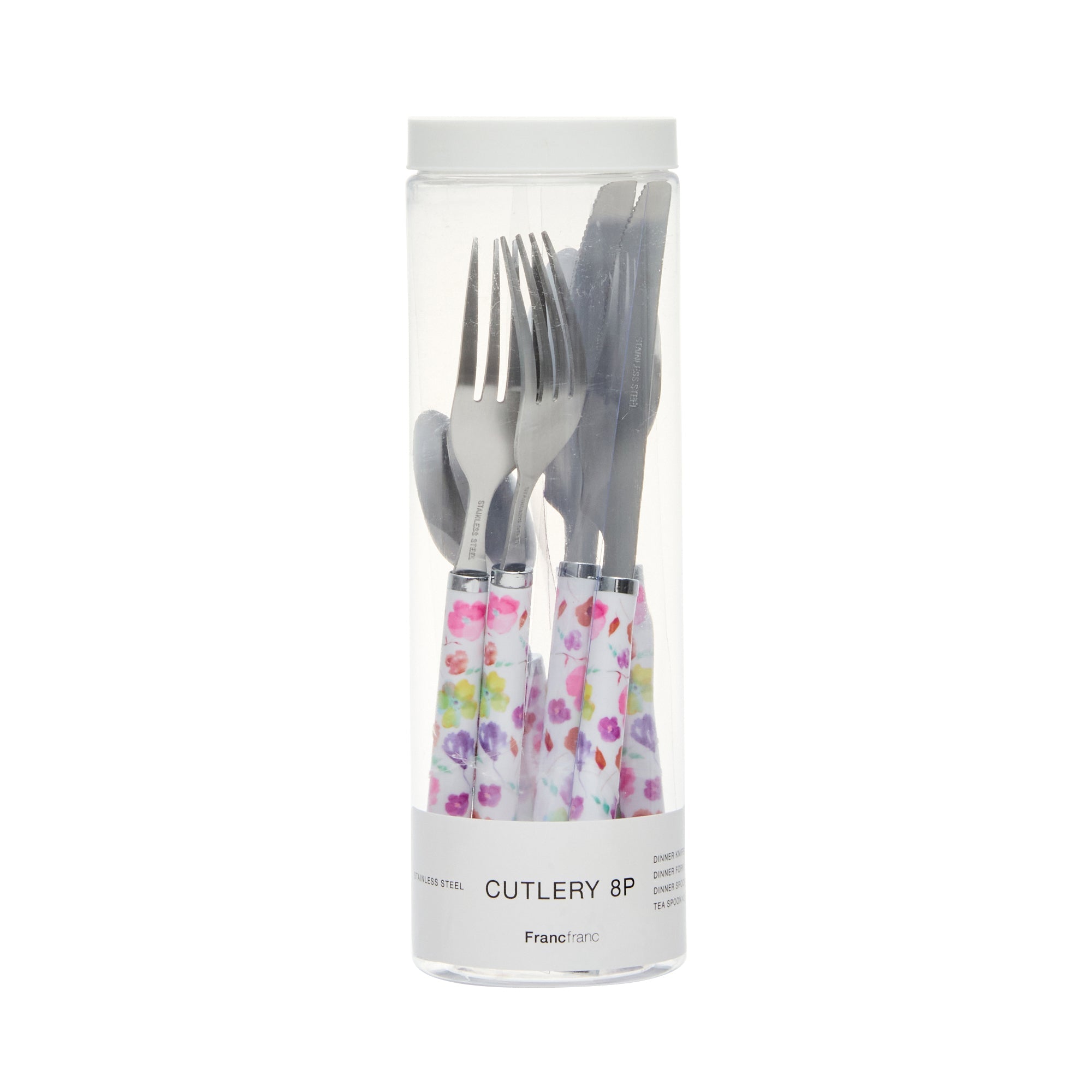 水彩のような花柄がフェミニンなデザインのカトラリーセットです。ディナースプーン、フォーク、ナイフ、ティースプーンが各2点ずつ入っており、必要な種類がまとめて揃います。新しい生活を始める方への贈り物としてもおすすめです。