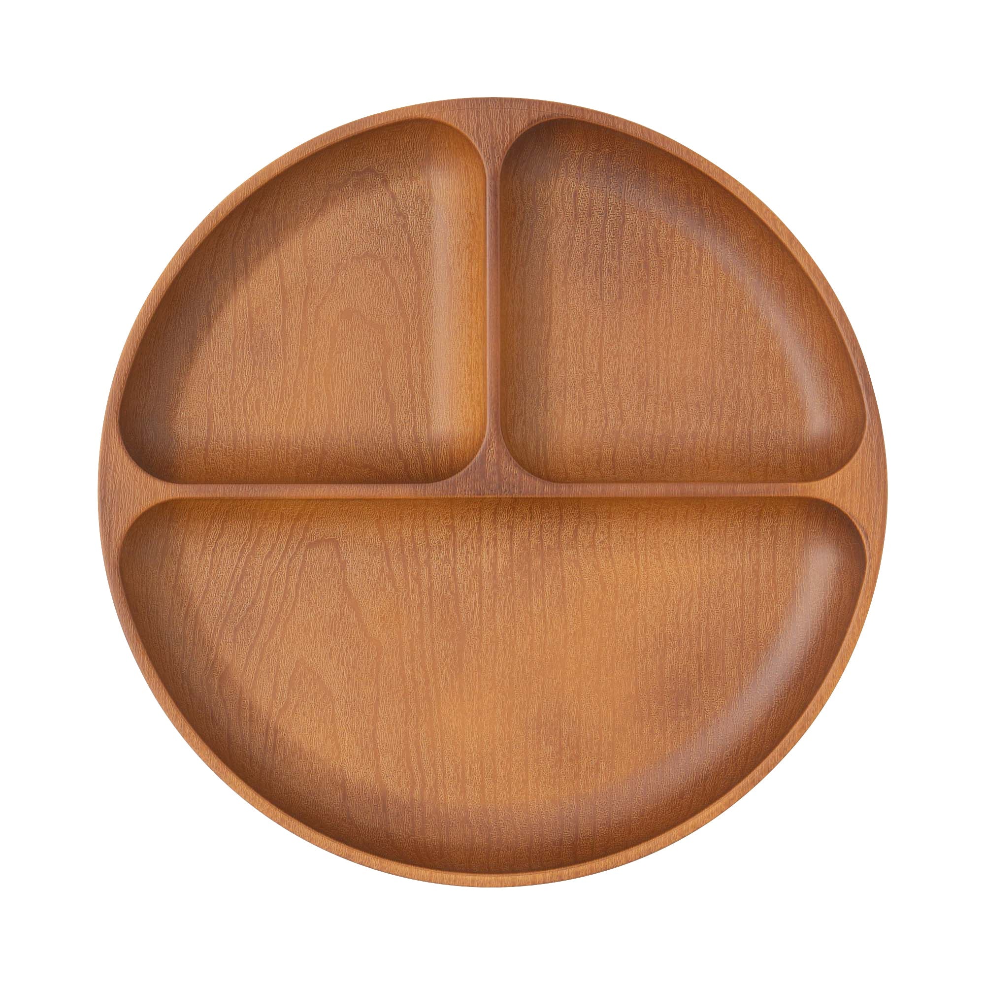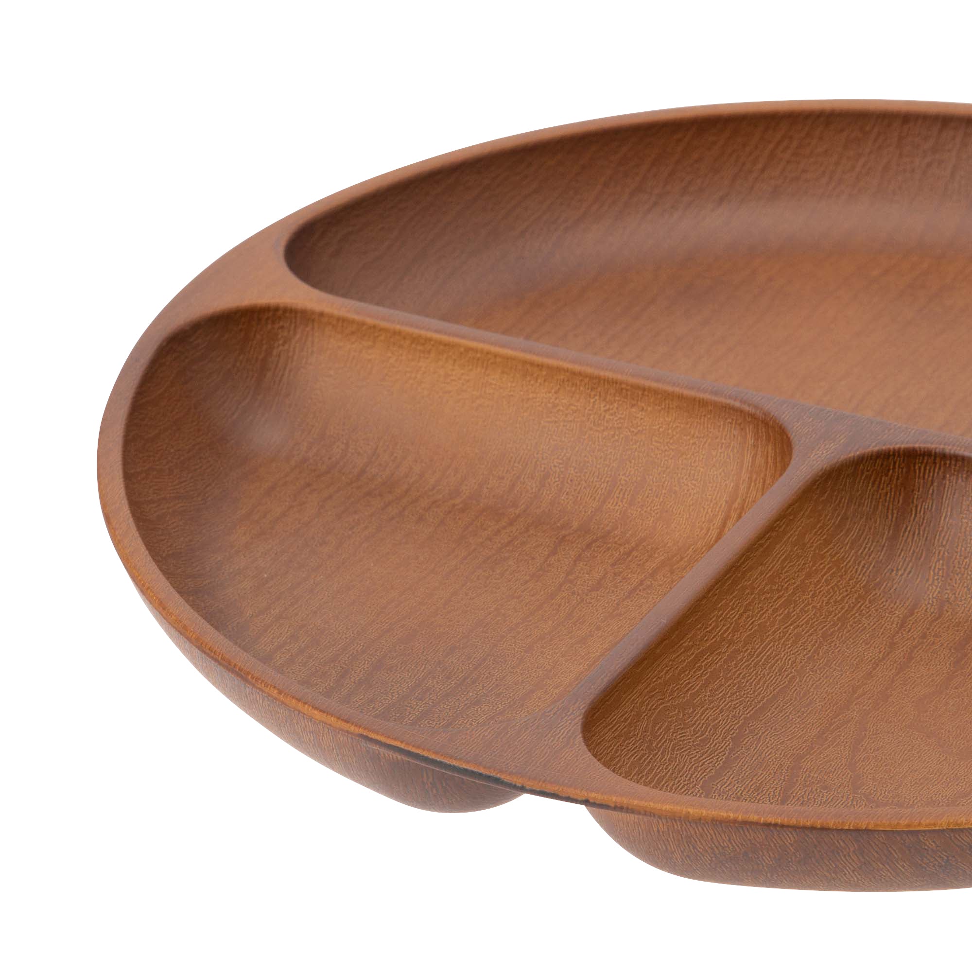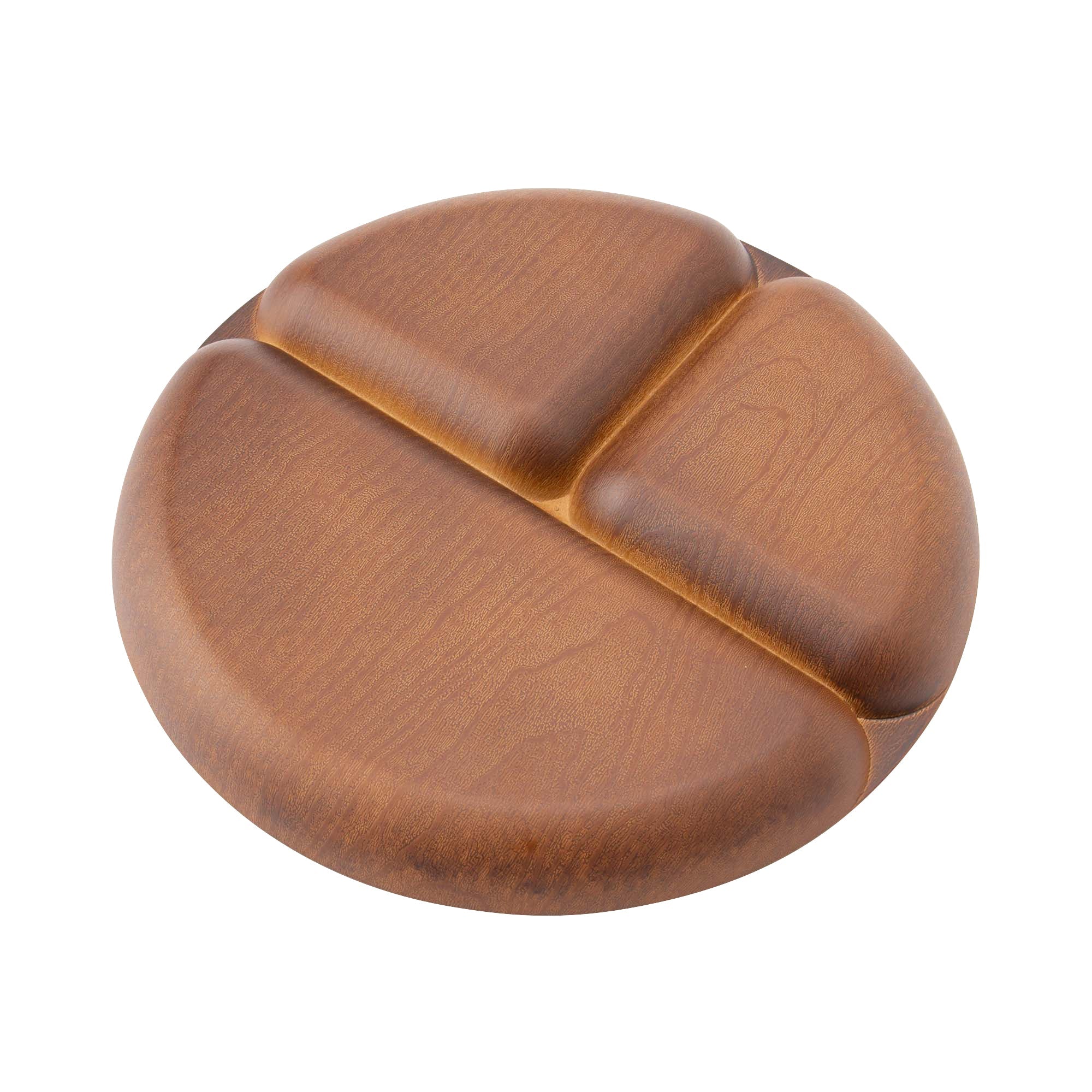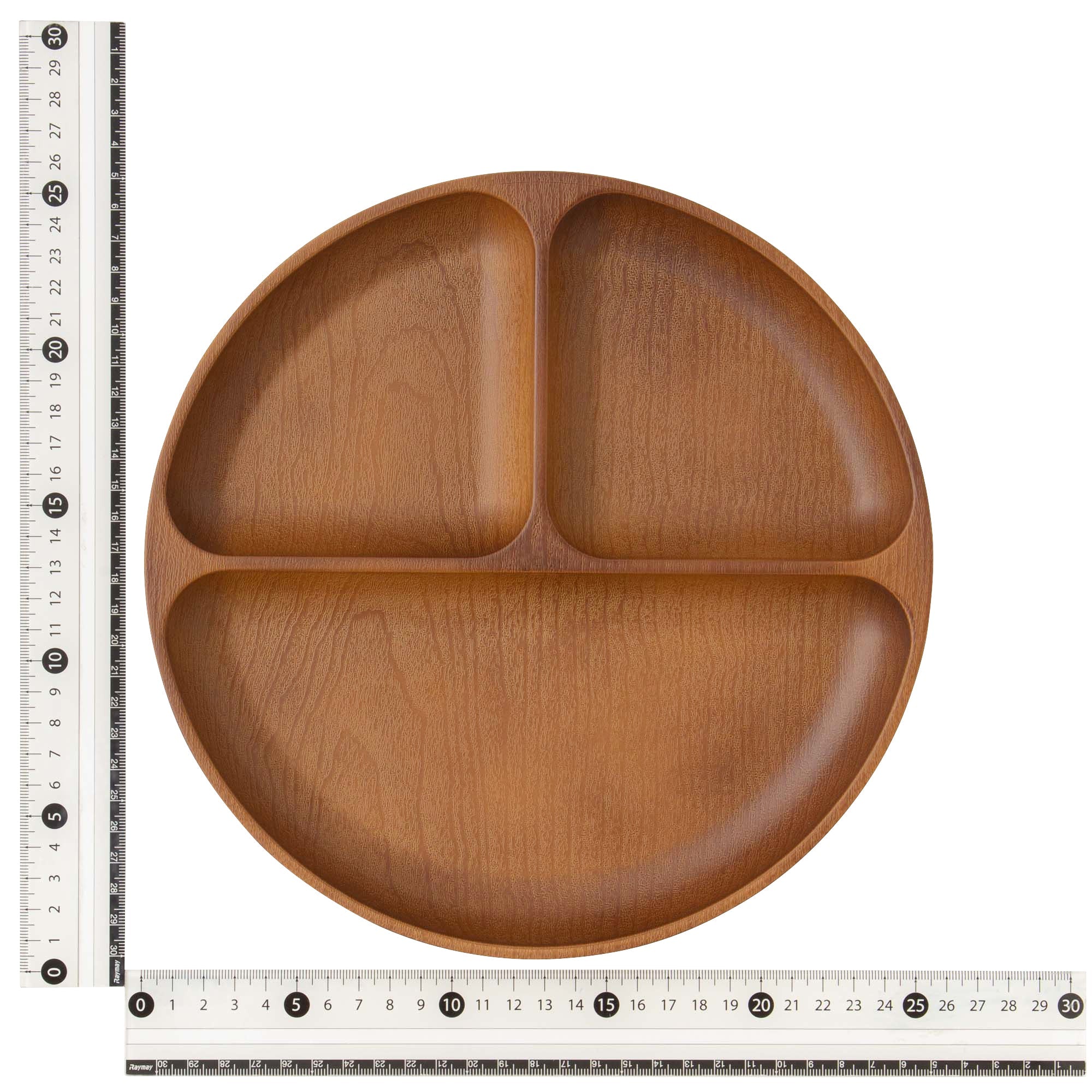 リアルな木の模様が美しいお手軽便利な樹脂製のセパレートプレートです。日本製の上、軽くて割れにくいので安心してお使いいただけます。電子レンジも食器洗浄機も使えて、普段使いにぴったりです。スタッキングもできて収納スペースの節約ができるので、アウトドアで使うときの持ち運びにも便利。食器の表面の木目模様は全て職人さんの手仕事です。技術の高い職人さんによりリアルな木目模様を施してもらいました。