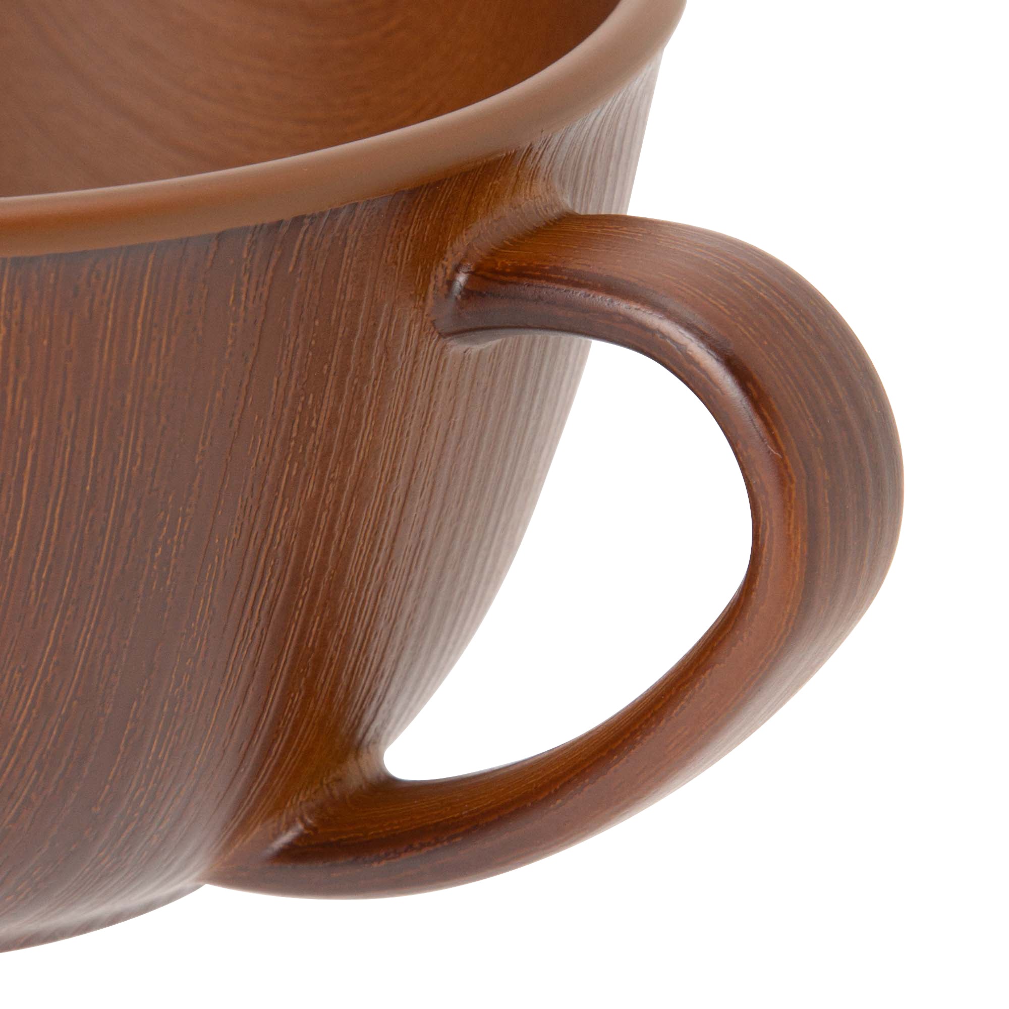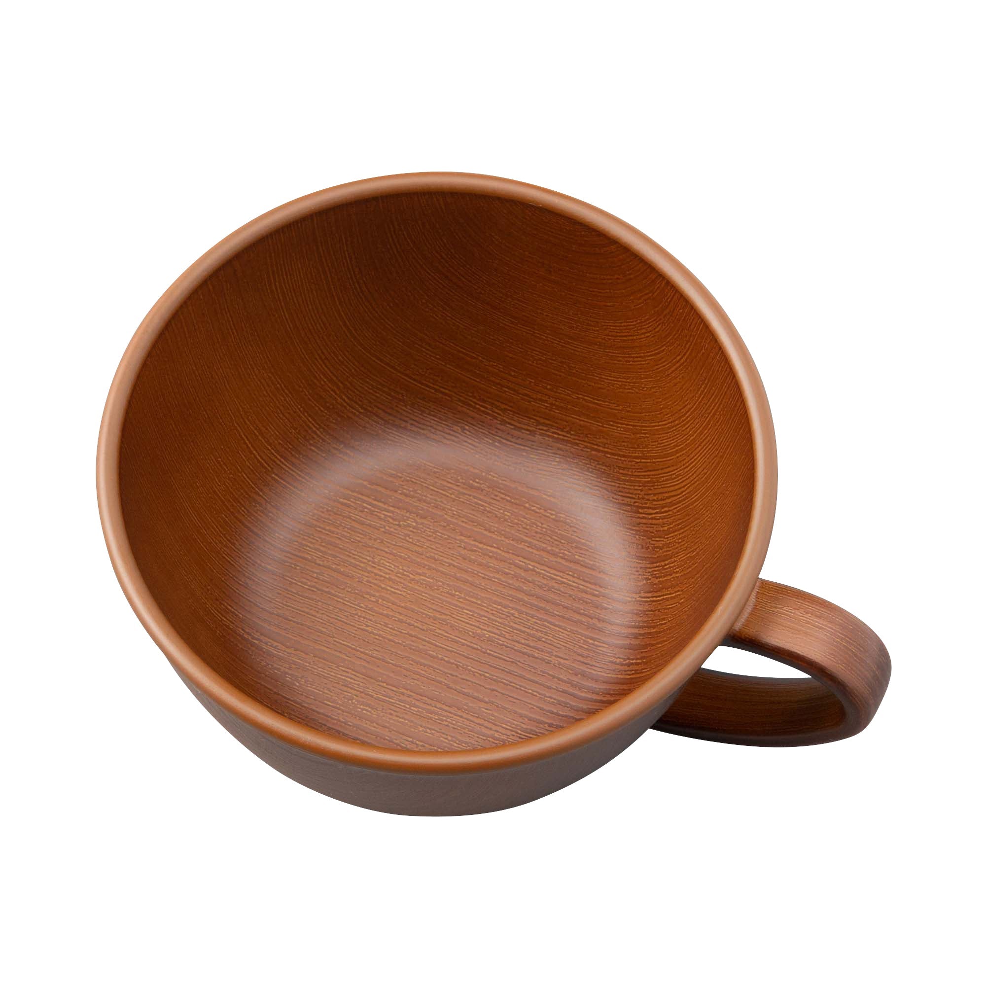リアルな木の模様が美しいお手軽便利な樹脂製のスープマグです。日本製の上、軽くて割れにくいので安心してお使いいただけます。電子レンジも食器洗浄機も使えて、普段使いにぴったりです。食器の表面の木目模様は全て職人さんの手仕事です。技術の高い職人さんによりリアルな木目模様を施してもらいました。