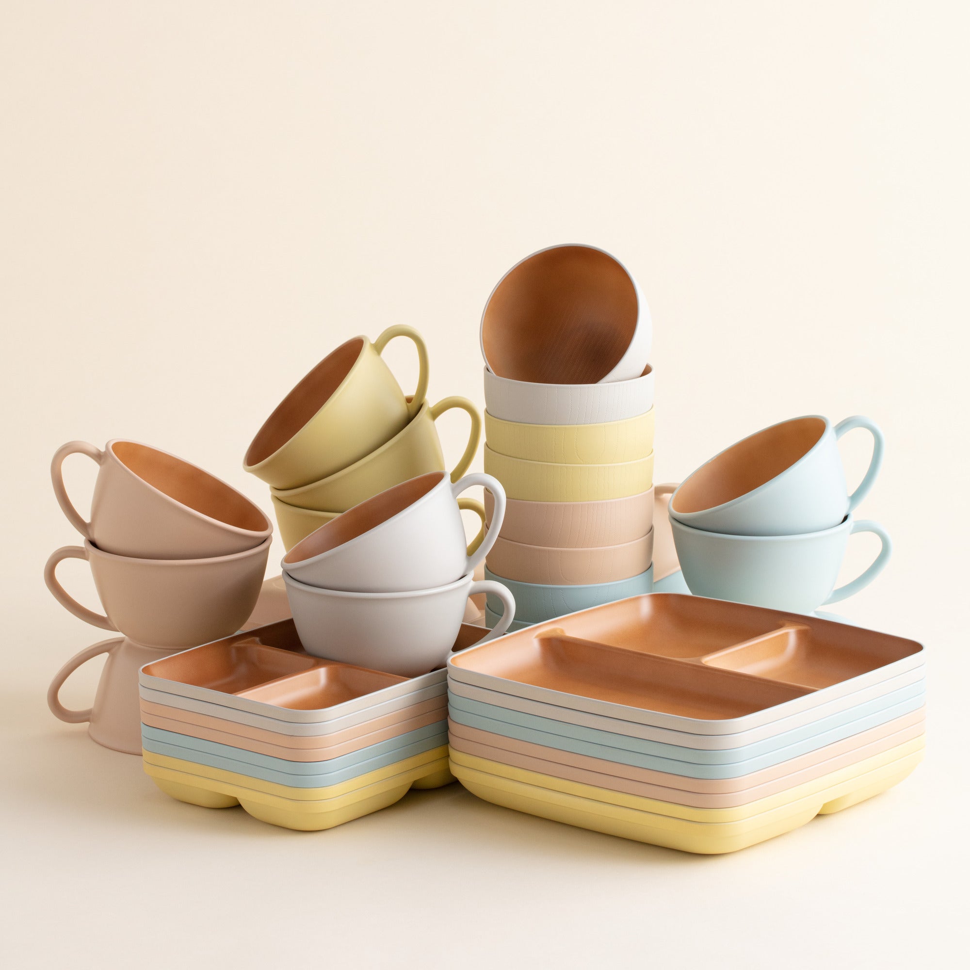 マット調のくすみカラーがかわいい、樹脂製の汁椀です。日本製の上、軽くて割れにくいので安心してお使いいただけます。うっすら見える木目調の模様がナチュラルな印象をプラスしています。手になじみやすいフォルムとサイズで使い勝手がよく、電子レンジも食器洗浄機も使えて、普段使いにぴったりです。セパレートプレートとのセット使いがおすすめです。
