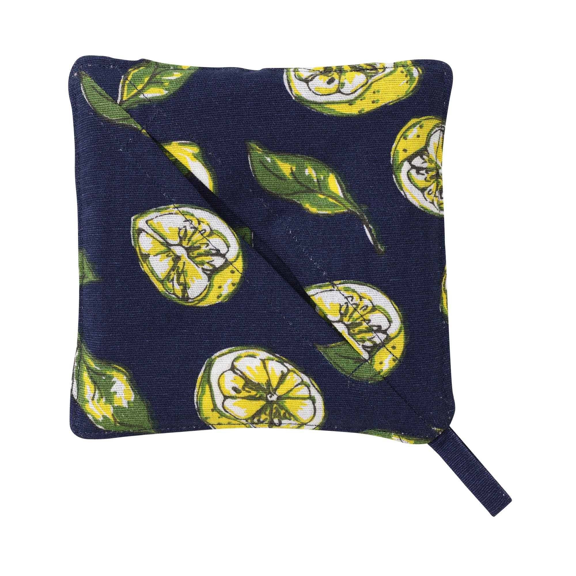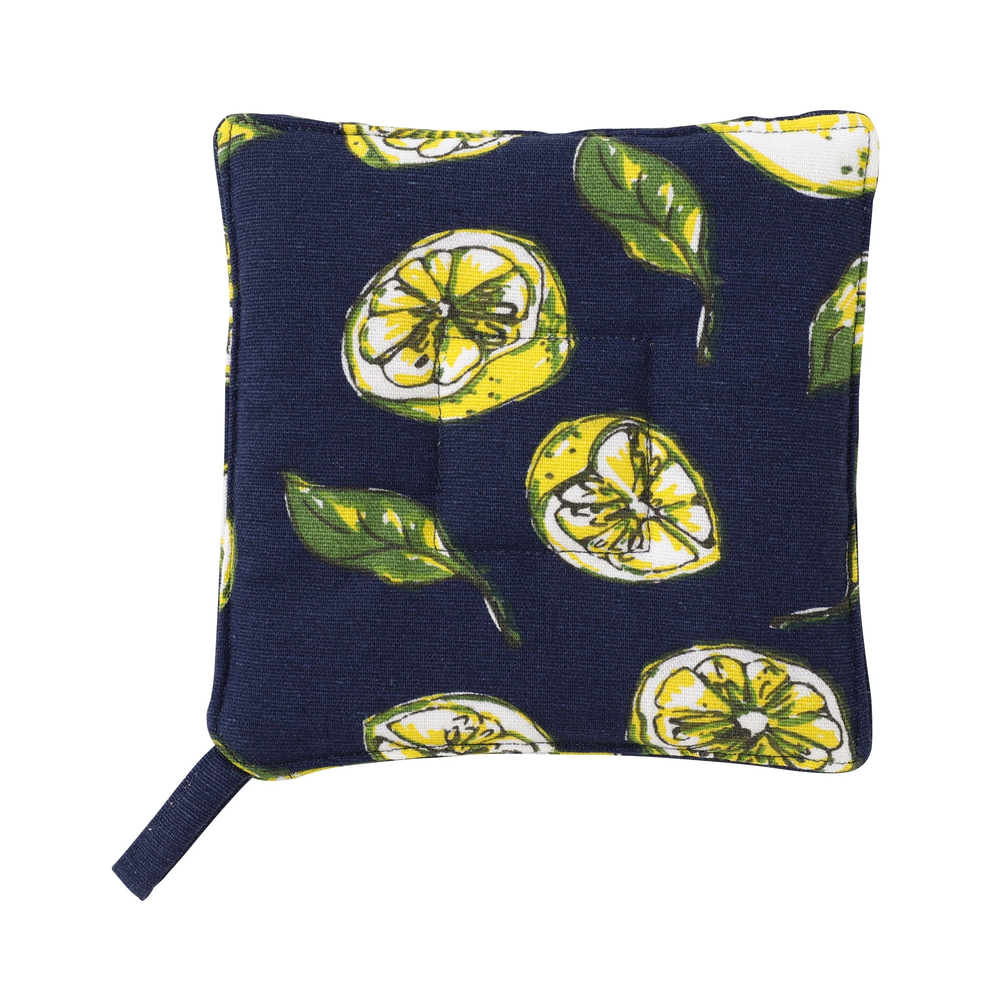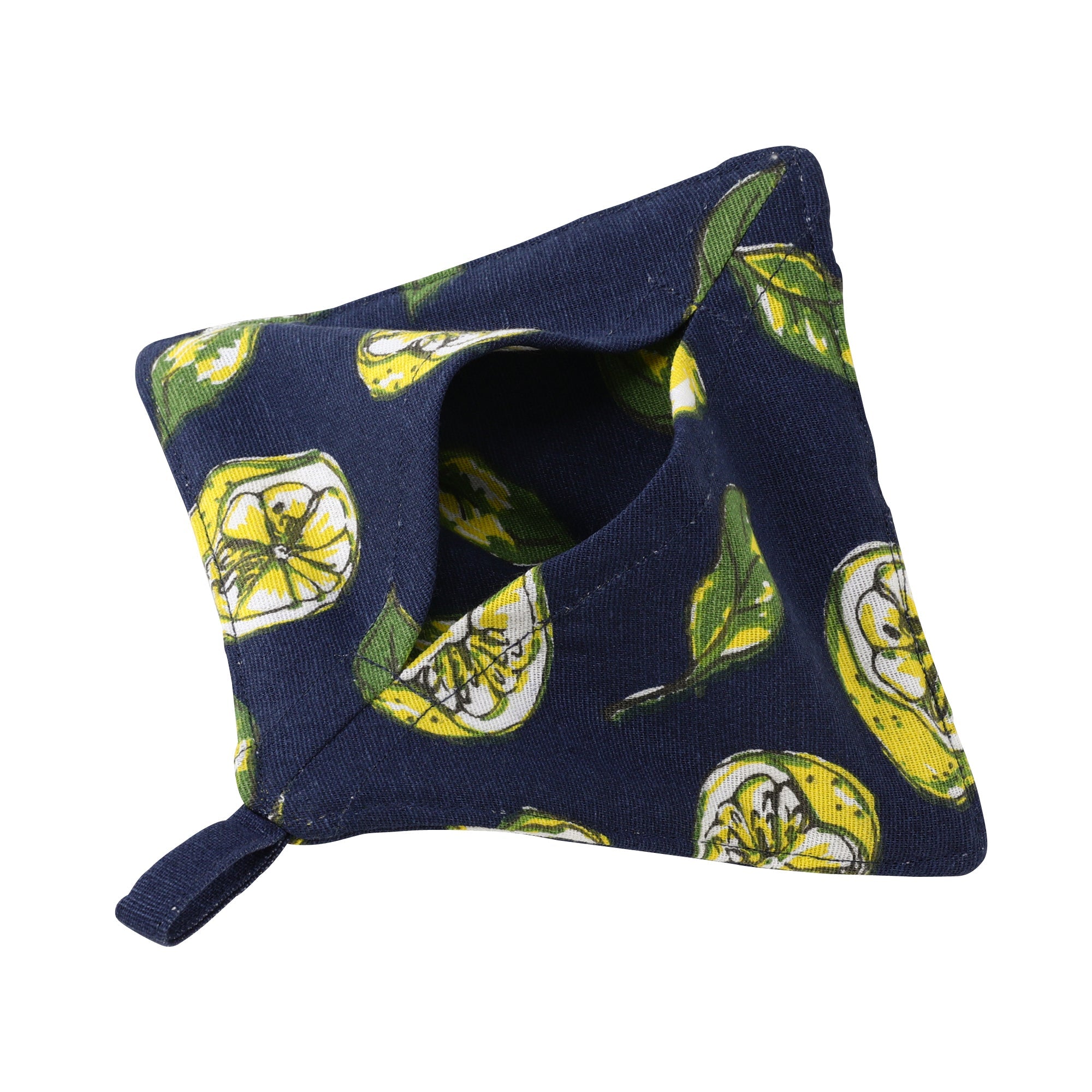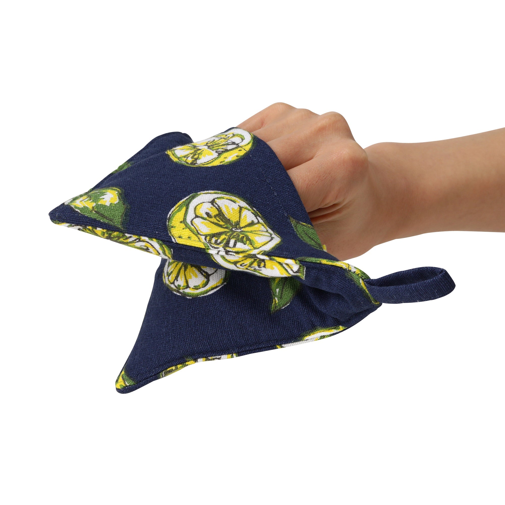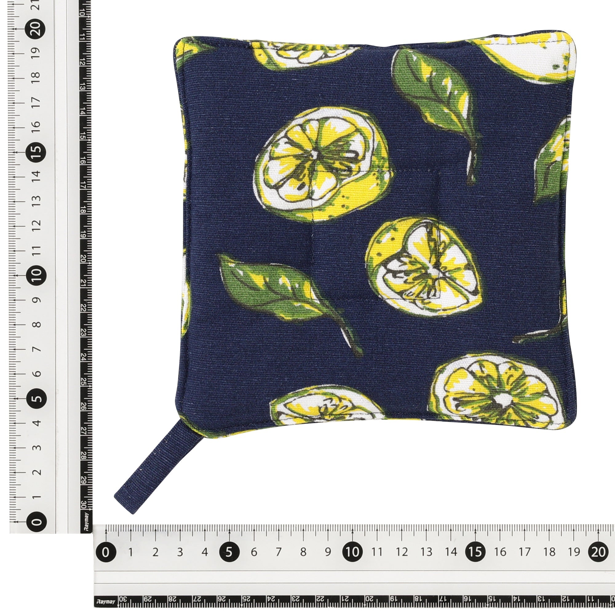 爽やかなレモンを手書き風のタッチで仕上げた、ポットホルダーです。ポットを置いたり、鍋つかみに使ったり、一つ持っていると大活躍のアイテムです。同じ柄でエプロンとミトンもご用意しました。セットでのギフトにもおすすめのアイテムです。