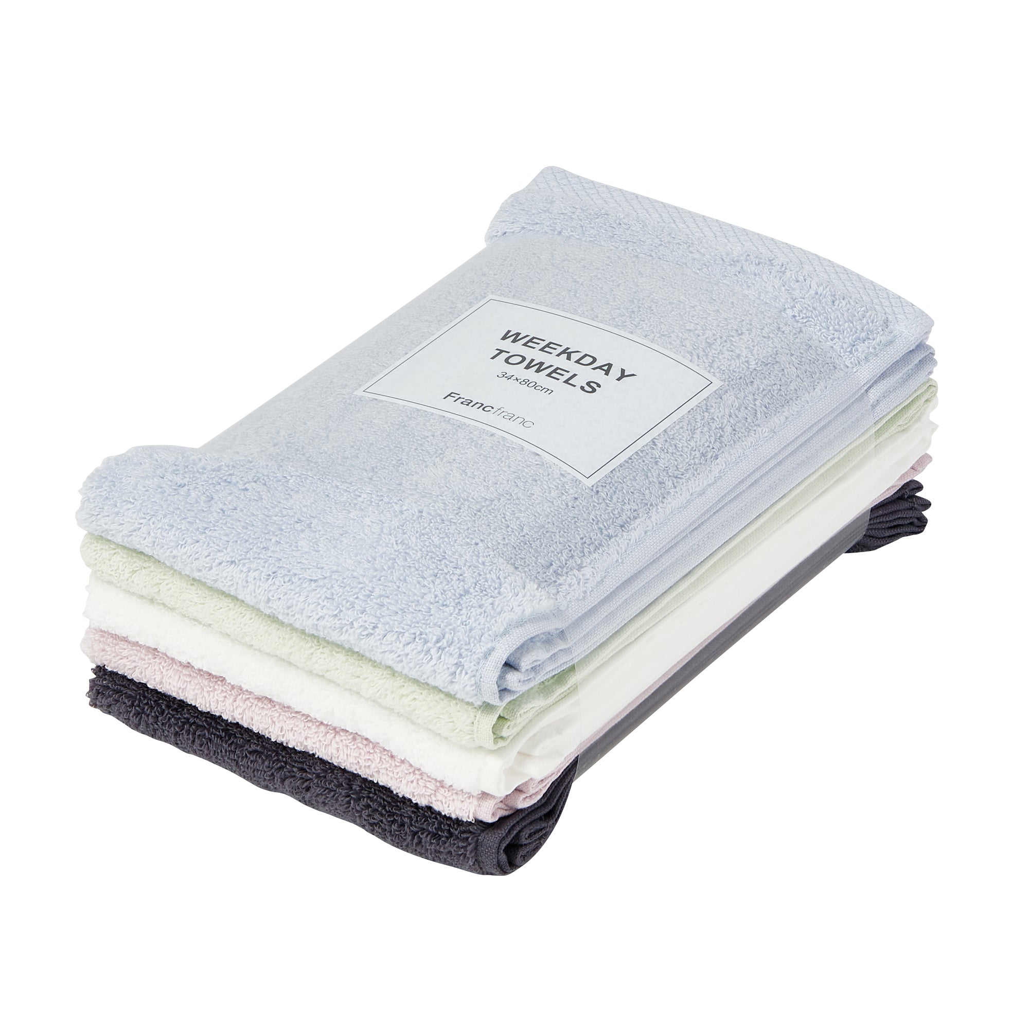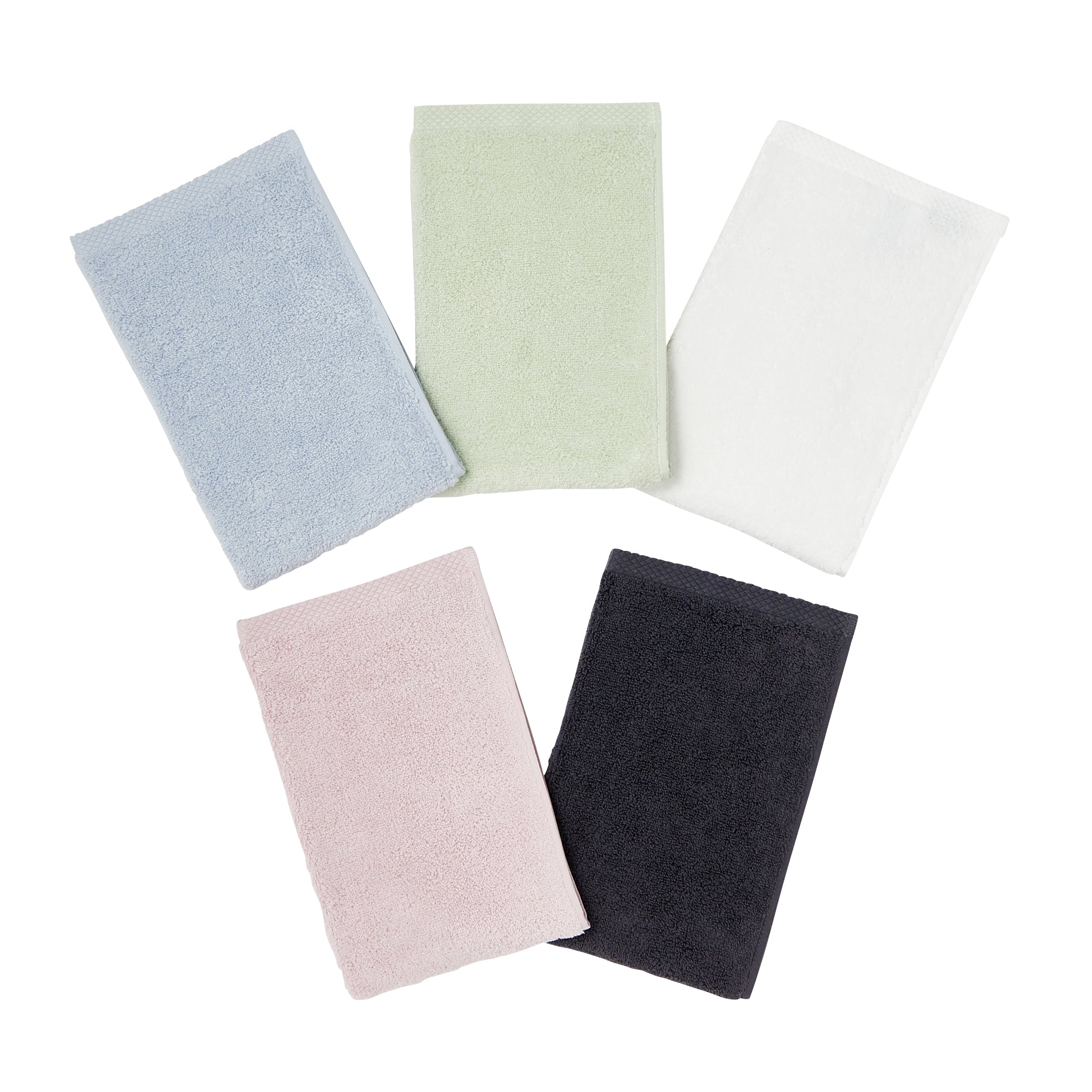 コットン5枚セットタオルです。表面は無撚糸パイルで肌触りがふんわりやわらかで、裏面は普通糸パイルを使用しているので表裏で肌触りの違いを楽しめます。厚みのあるボリュームと贅沢な質感の5枚セットはお買い得感があります。5枚あるので洗い替えもでき、気分に合わせて色を選べます。全て異なる5色なので、家族それぞれお気に入りの色を使用できます。