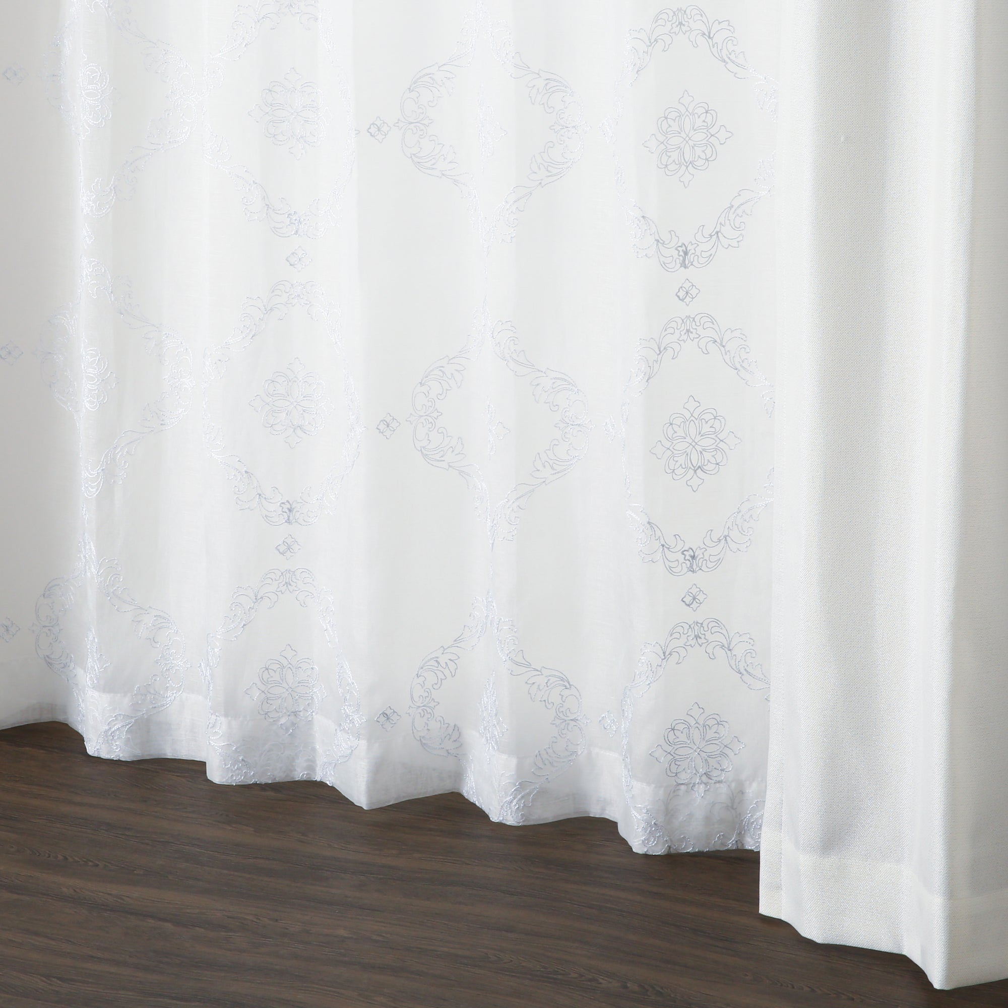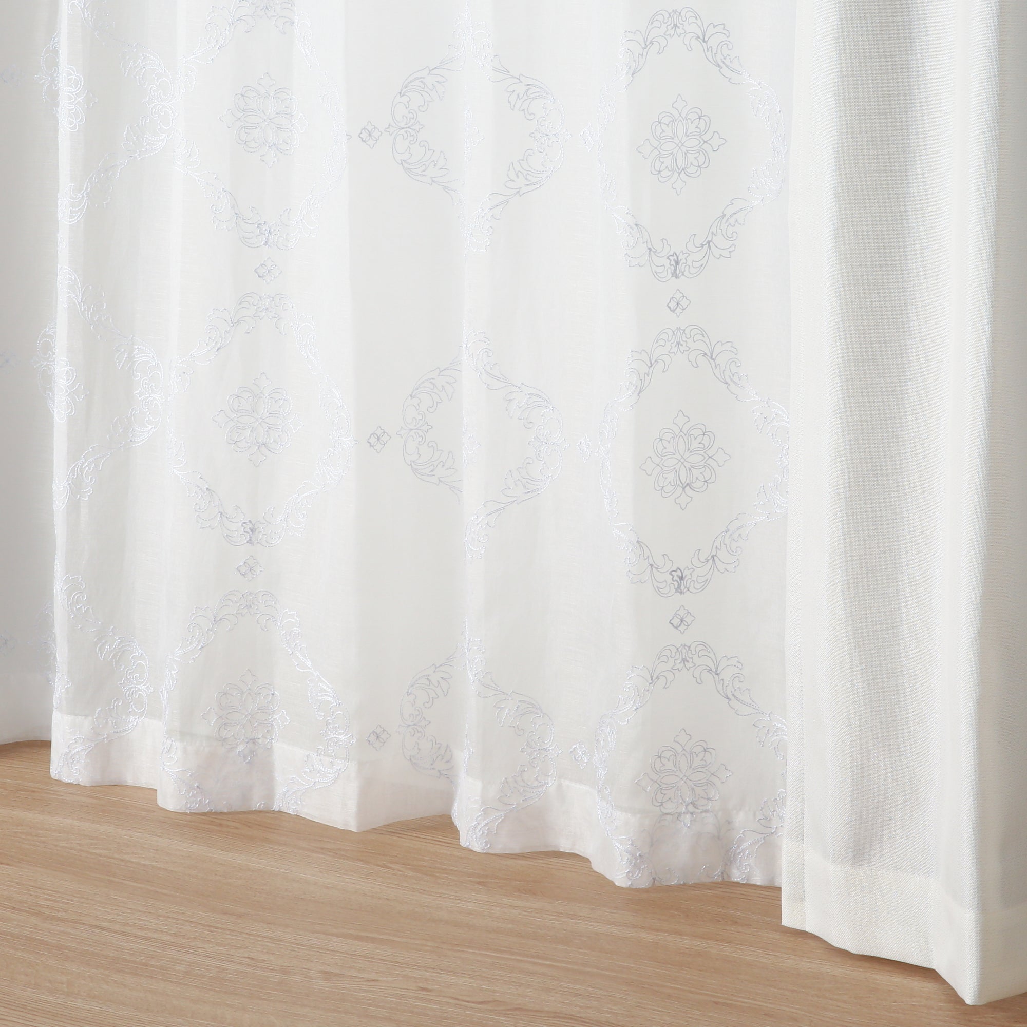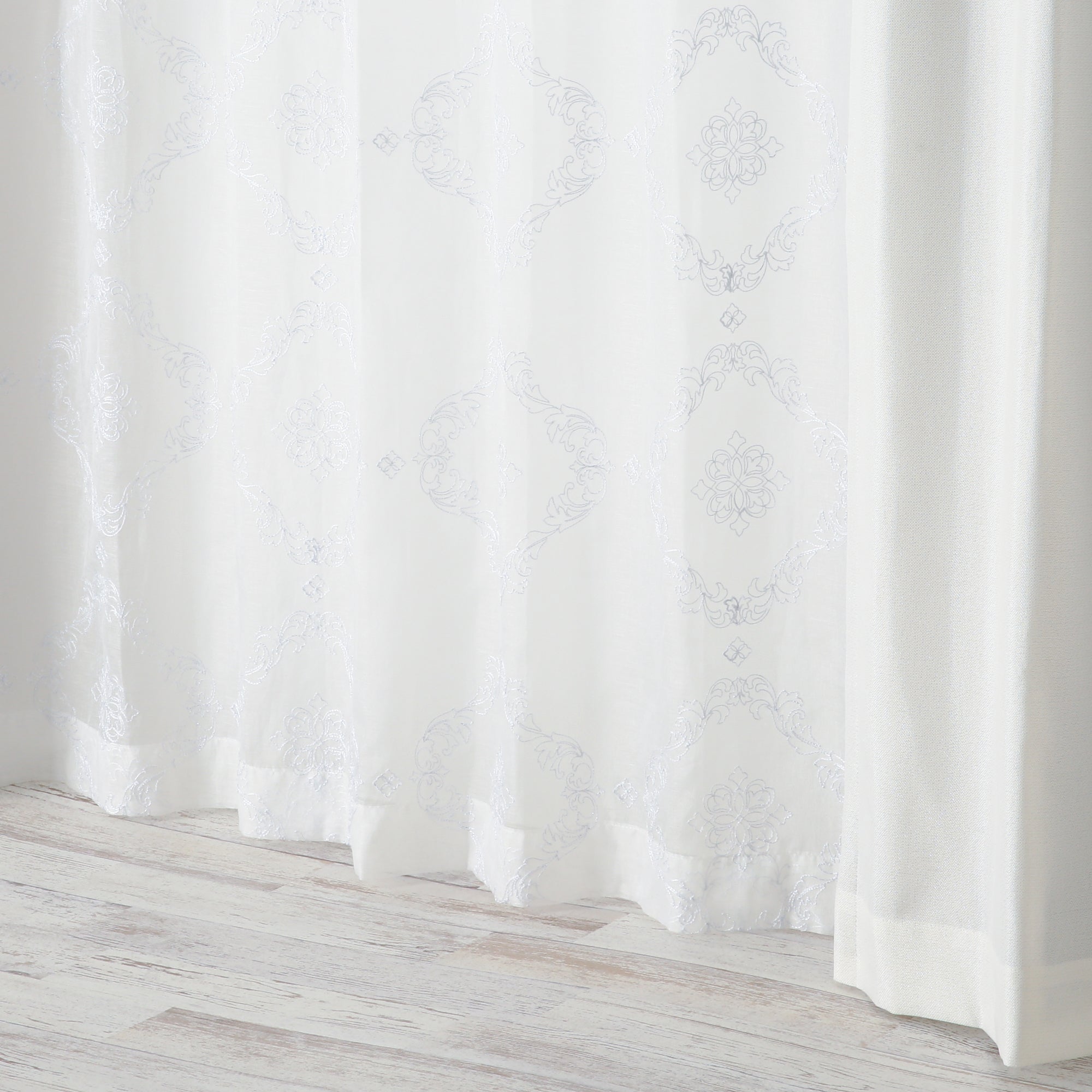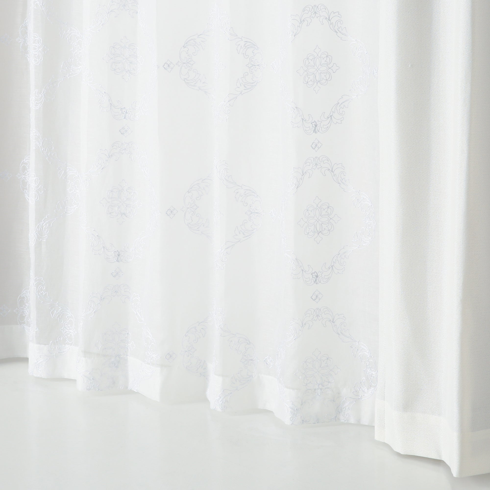 透け感のあるボイル生地のレースカーテンです。 ホワイトのラメ刺繍でオーナメント柄を全面に施した贅沢な仕上げで、エレガントなお部屋のアクセントになります。